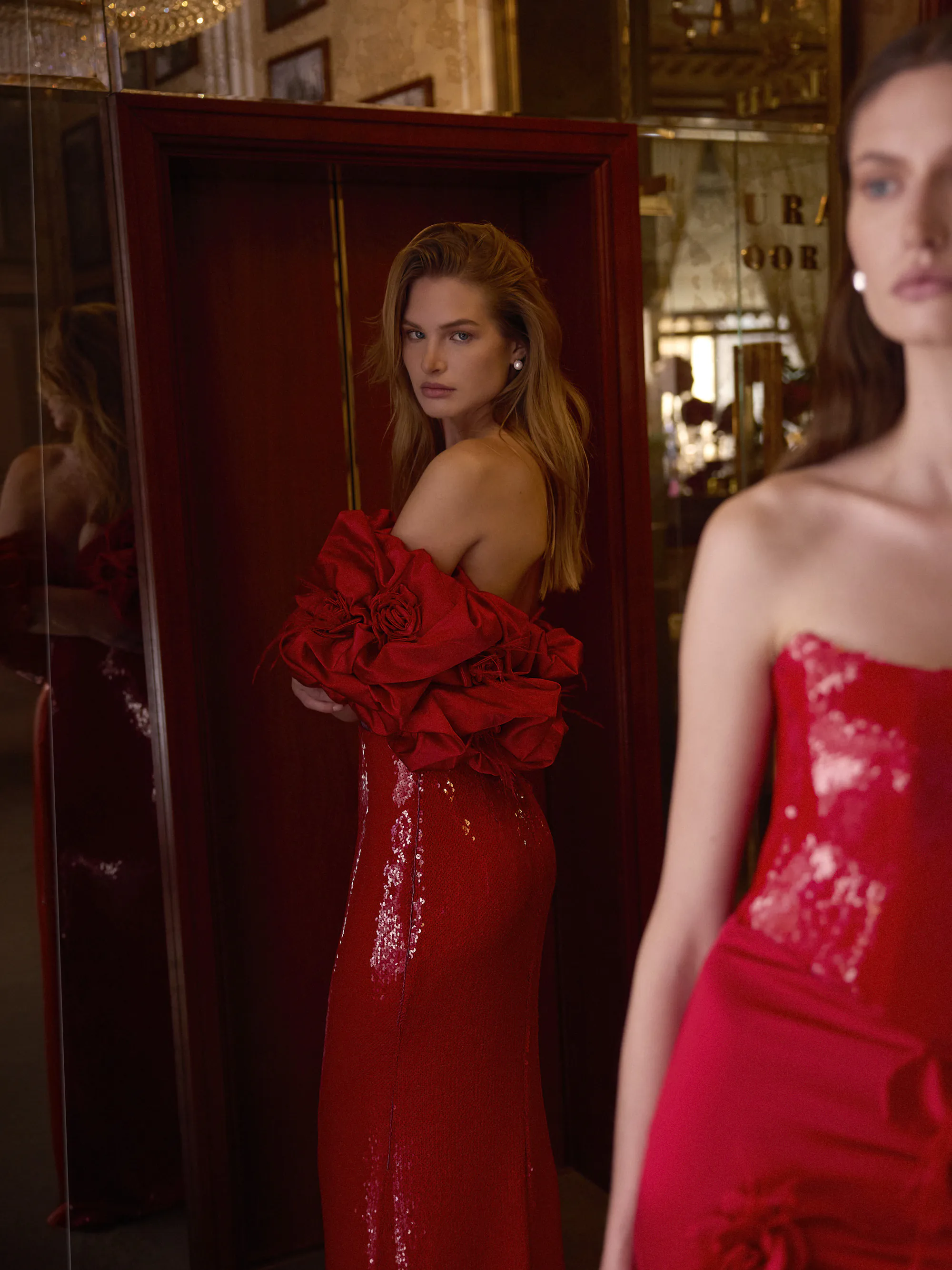 This stunning mermaid-style gown is crafted from shimmering red sequins, featuring a heart-shaped neckline. The dress is complemented by a detachable satin cape adorned with intricate 3D roses, each embellished with delicate feathers for a luxurious, dramatic effect.