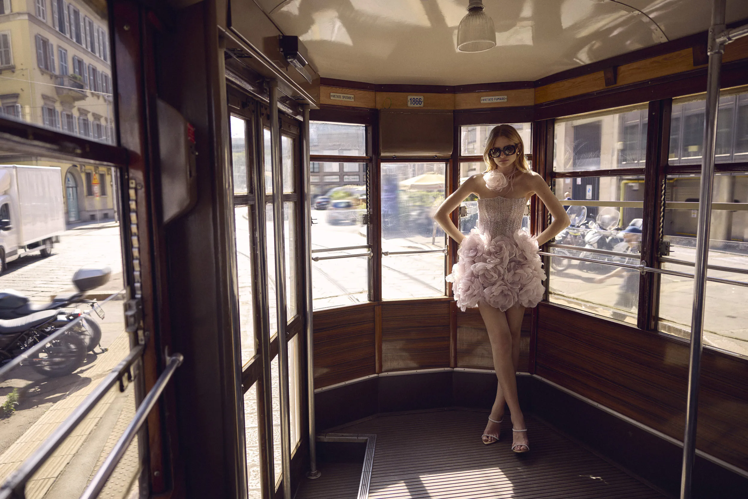 This mini dress features a corset-style bodice made from intricately beaded lace. The skirt is adorned with 3D floral details crafted from soft, dusty pink organza, adding depth and texture for a romantic, ethereal effect.