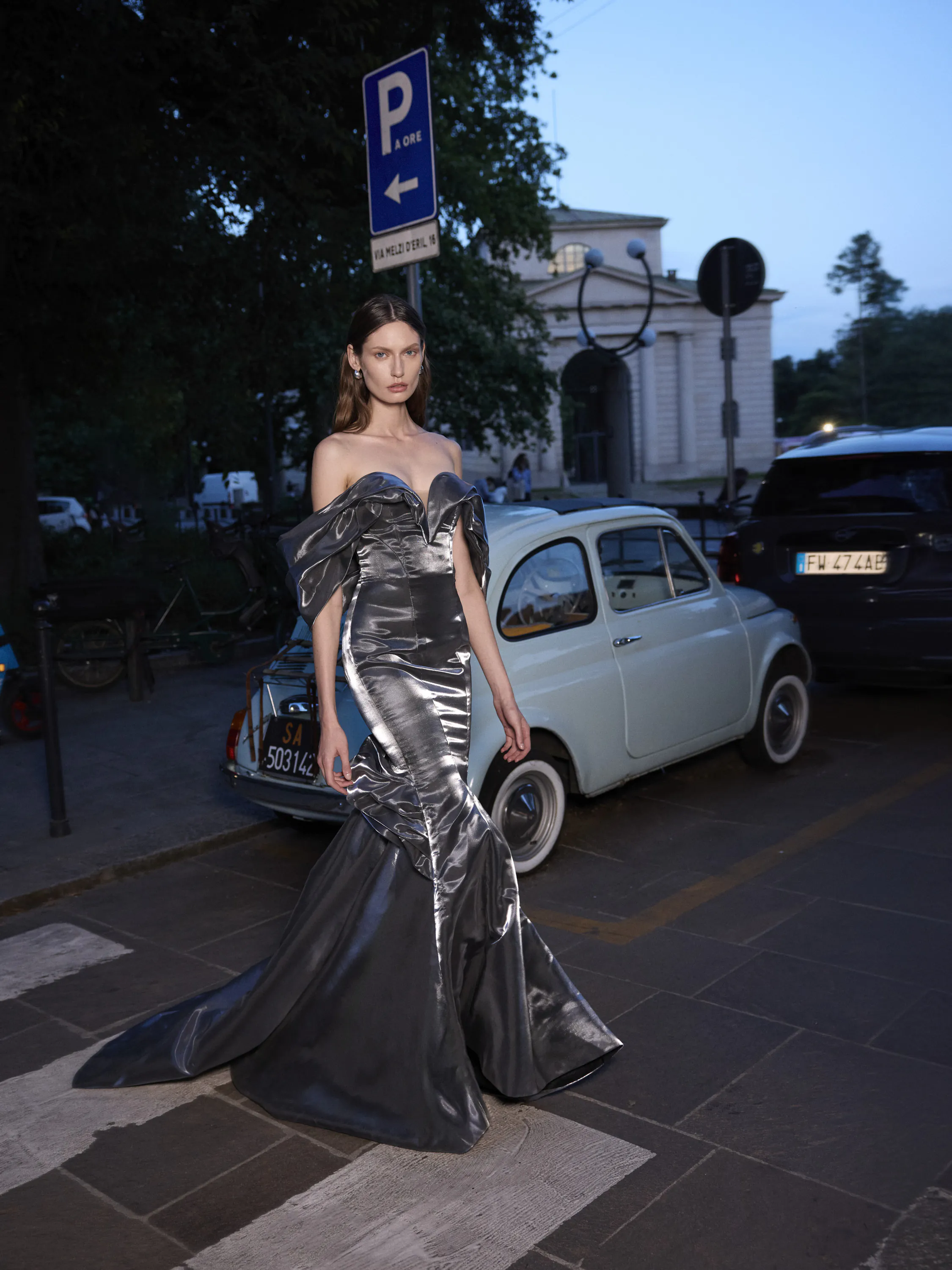 This mermaid-style gown in a metallic satin fabric with a touch of lurex exudes a luxurious, radiant glow. The dress features off-the-shoulder detailing, complemented by elegant draping that accentuates its flowing silhouette. A dramatic train adds a sophisticated and regal touch, making this dress perfect for a glamorous evening.