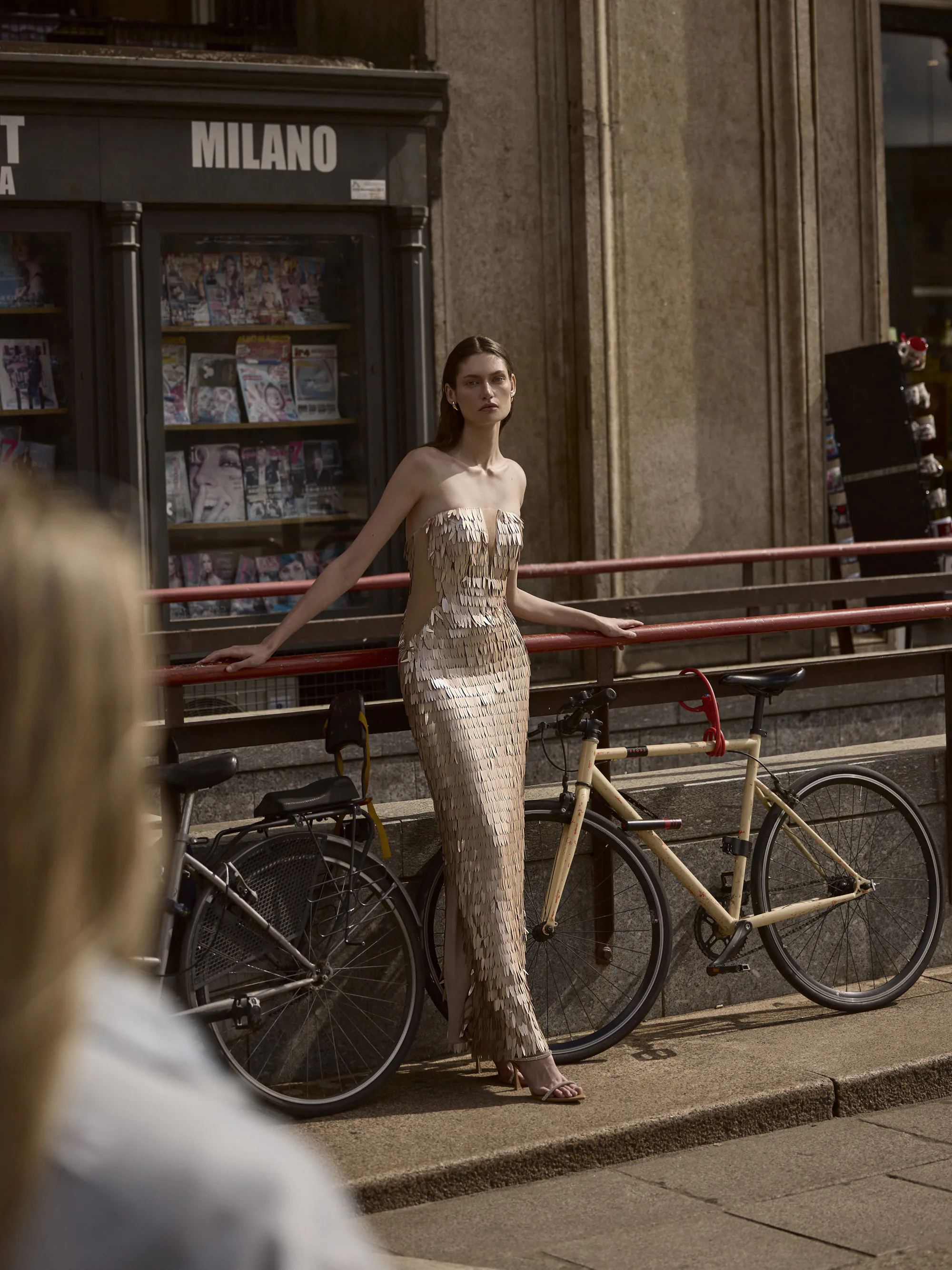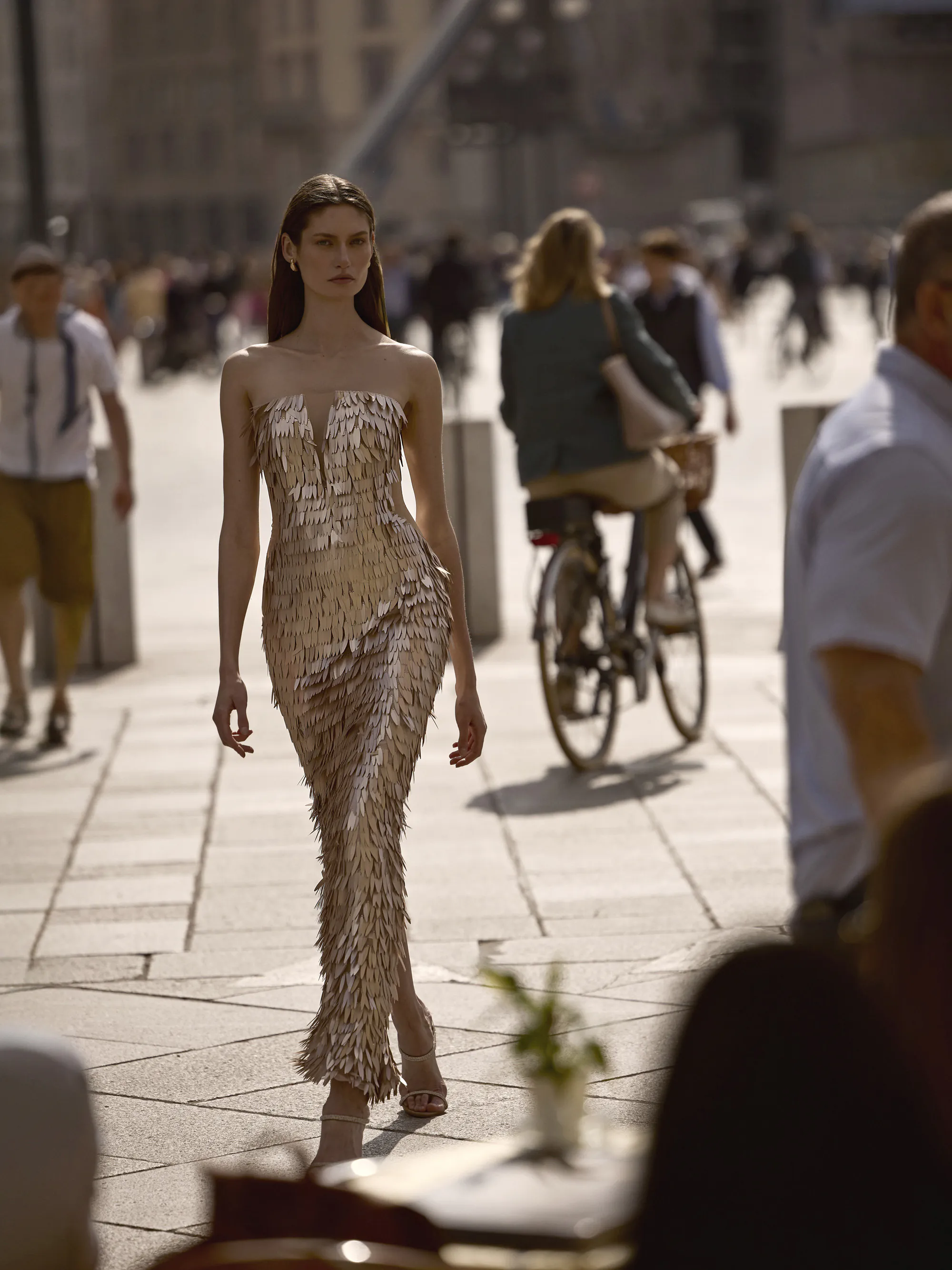 This straight-cut nude dress is adorned with 3D sequins in the shape of delicate leaves, creating a stunning, textured effect. The bodice features a nude mesh, giving the illusion of a plunging neckline while maintaining an elegant, sophisticated look.