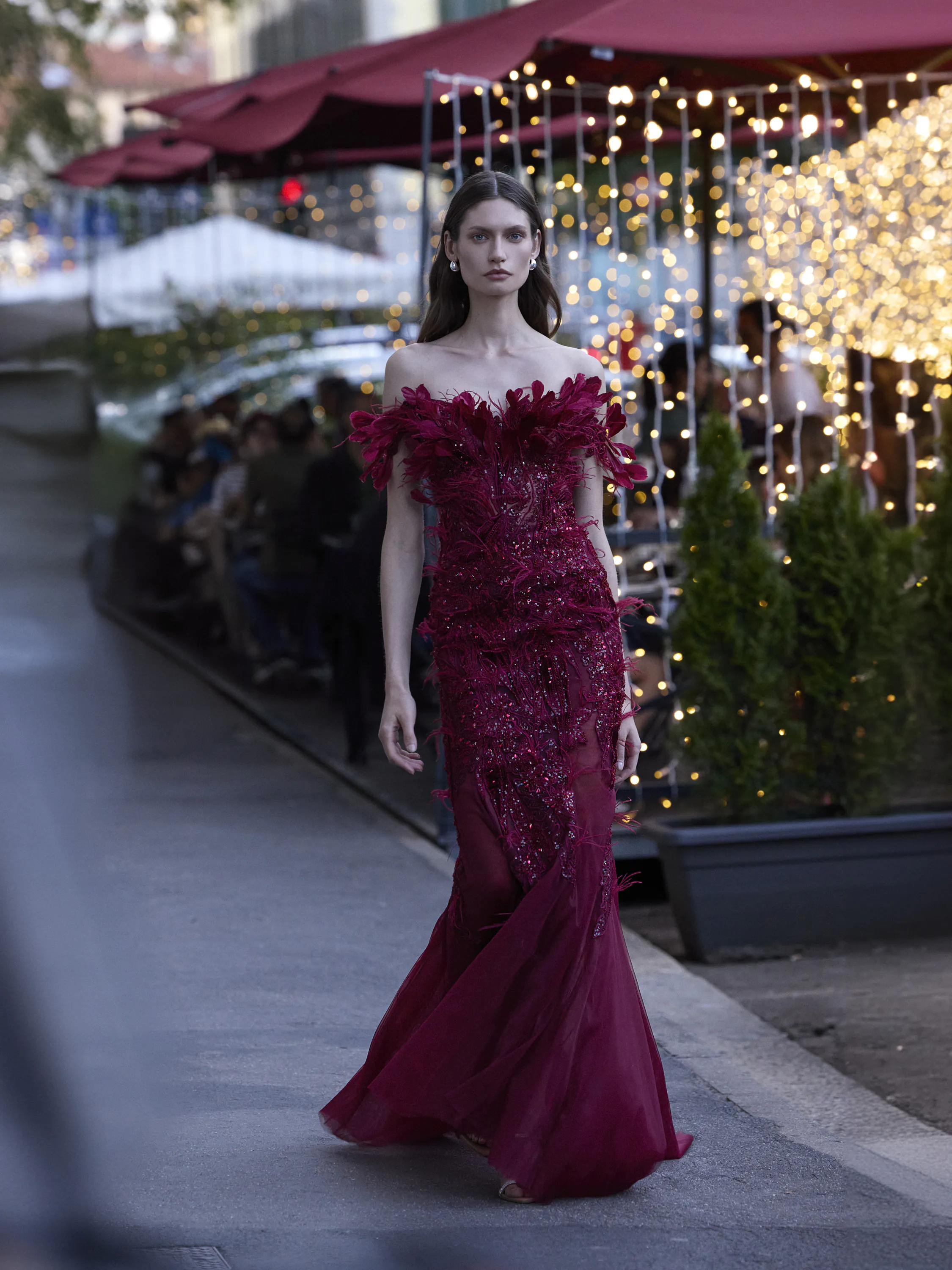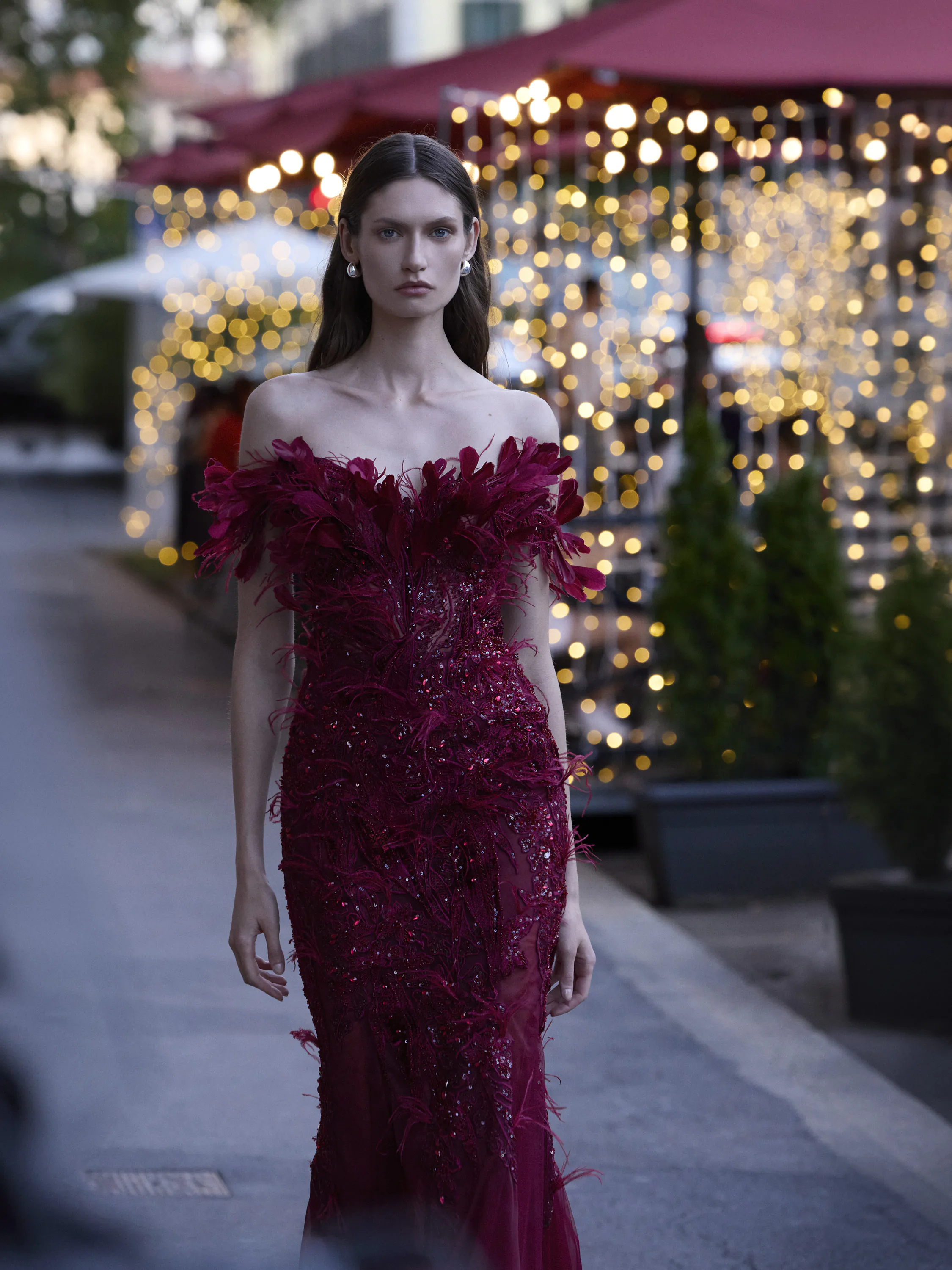This mermaid-style gown in a deep burgundy hue features an off-the-shoulder design, crafted from tulle and intricately embroidered lace with beads and sequins, creating a stunning, textured effect. The dress is further enhanced with delicate feathers across the bodice, adding a luxurious and dramatic flair.