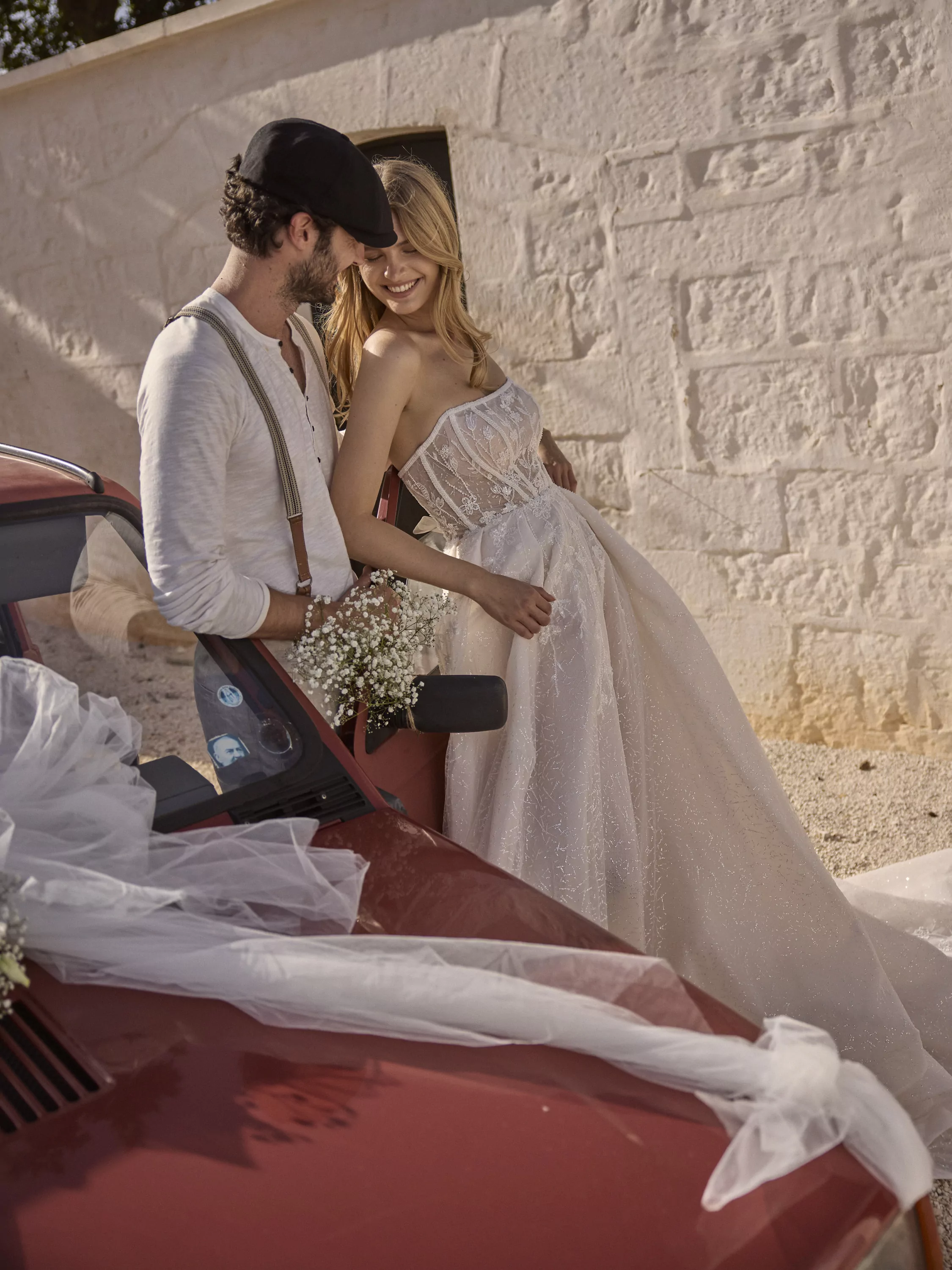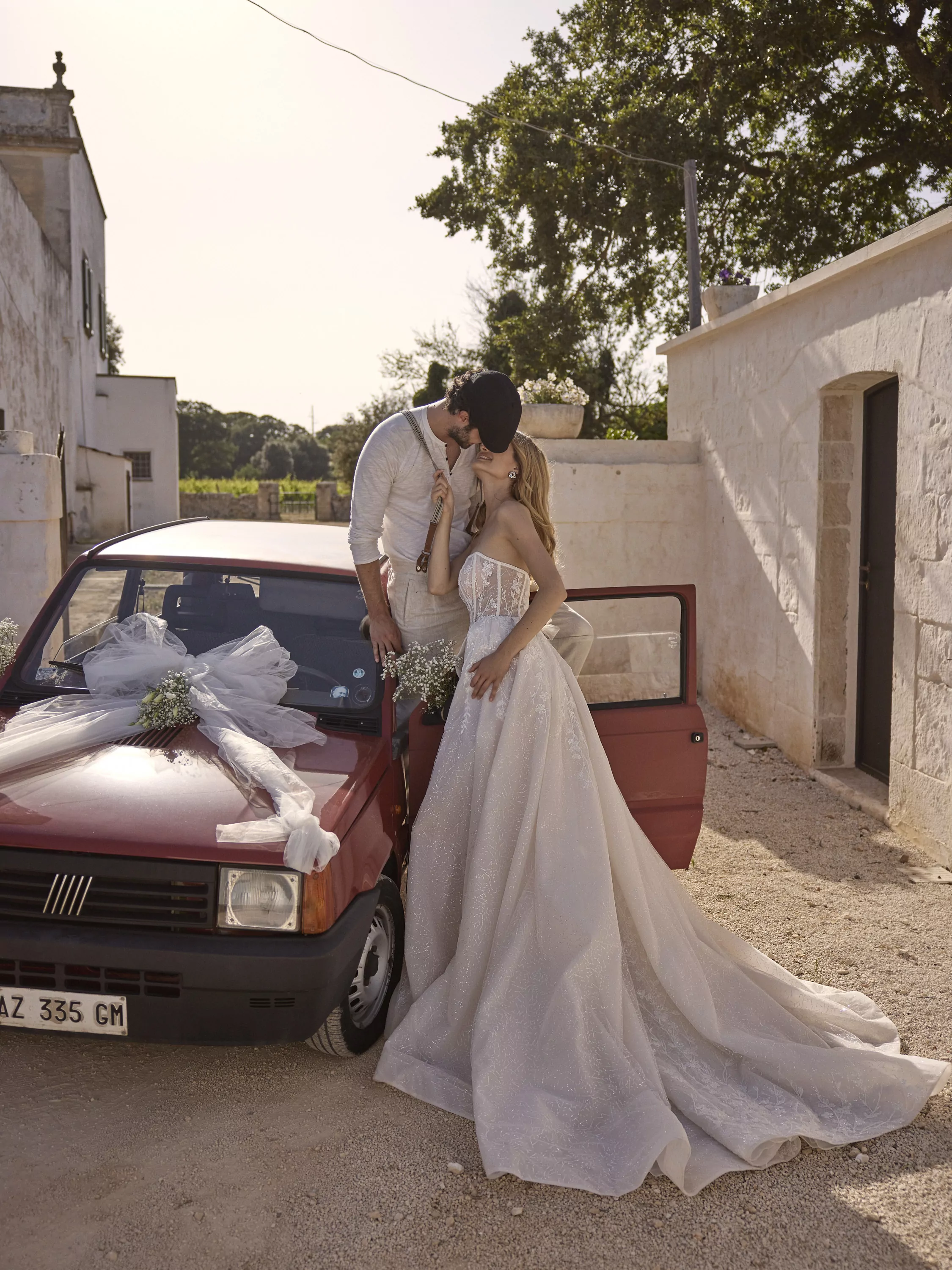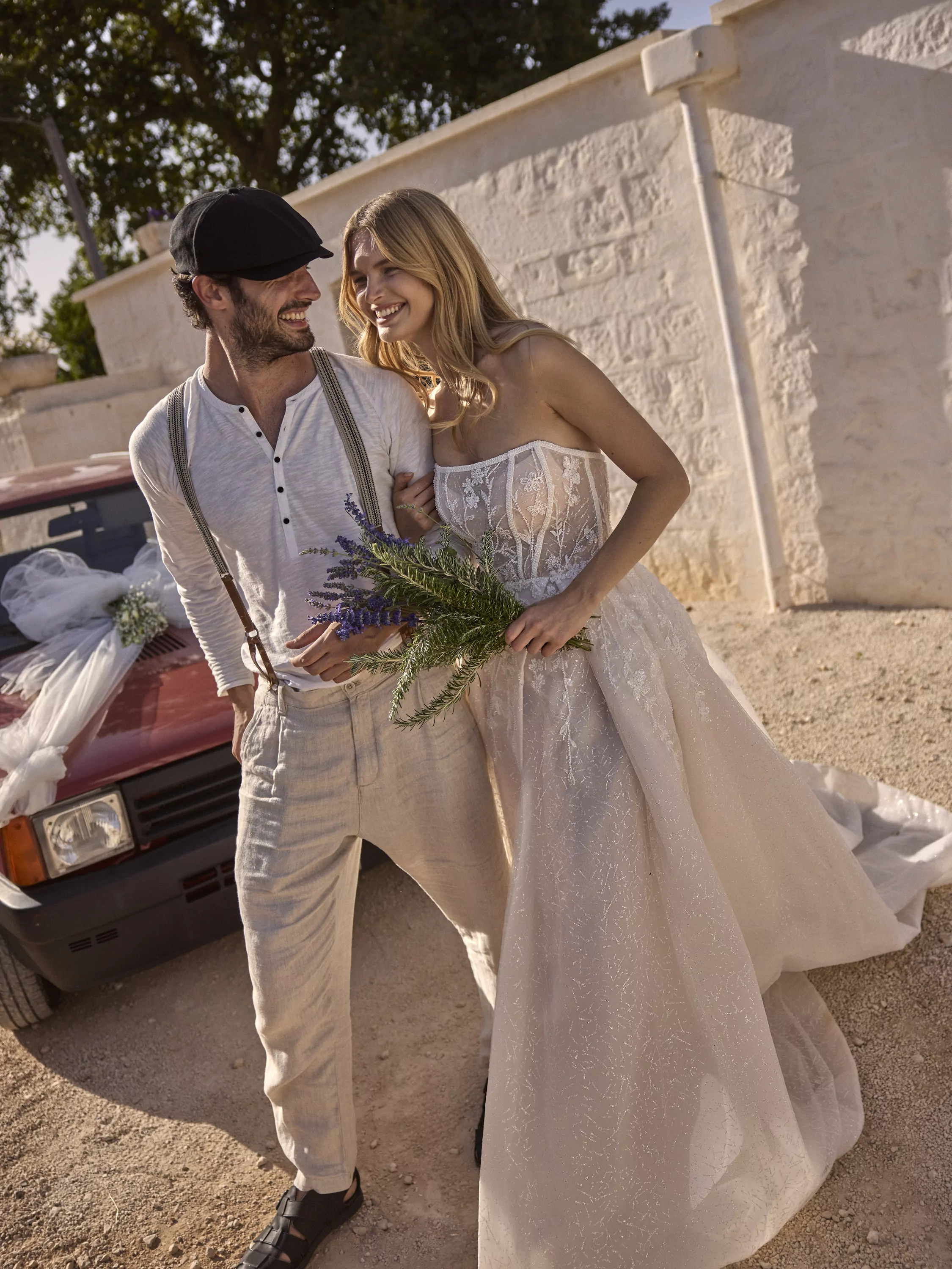 A-line dress with high slit and straight semi-transparent corset.The dress is made of mesh, beautifully embroidered with floral lace, creates an elegant and romantic look.