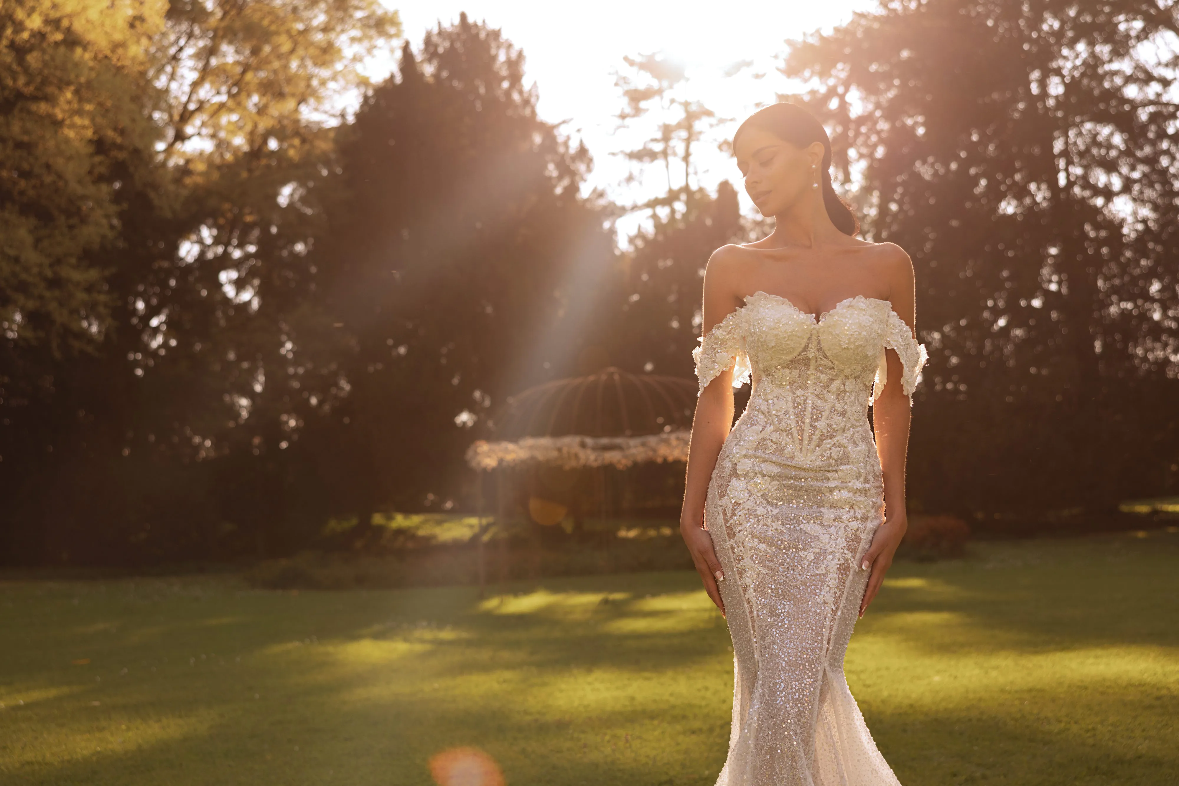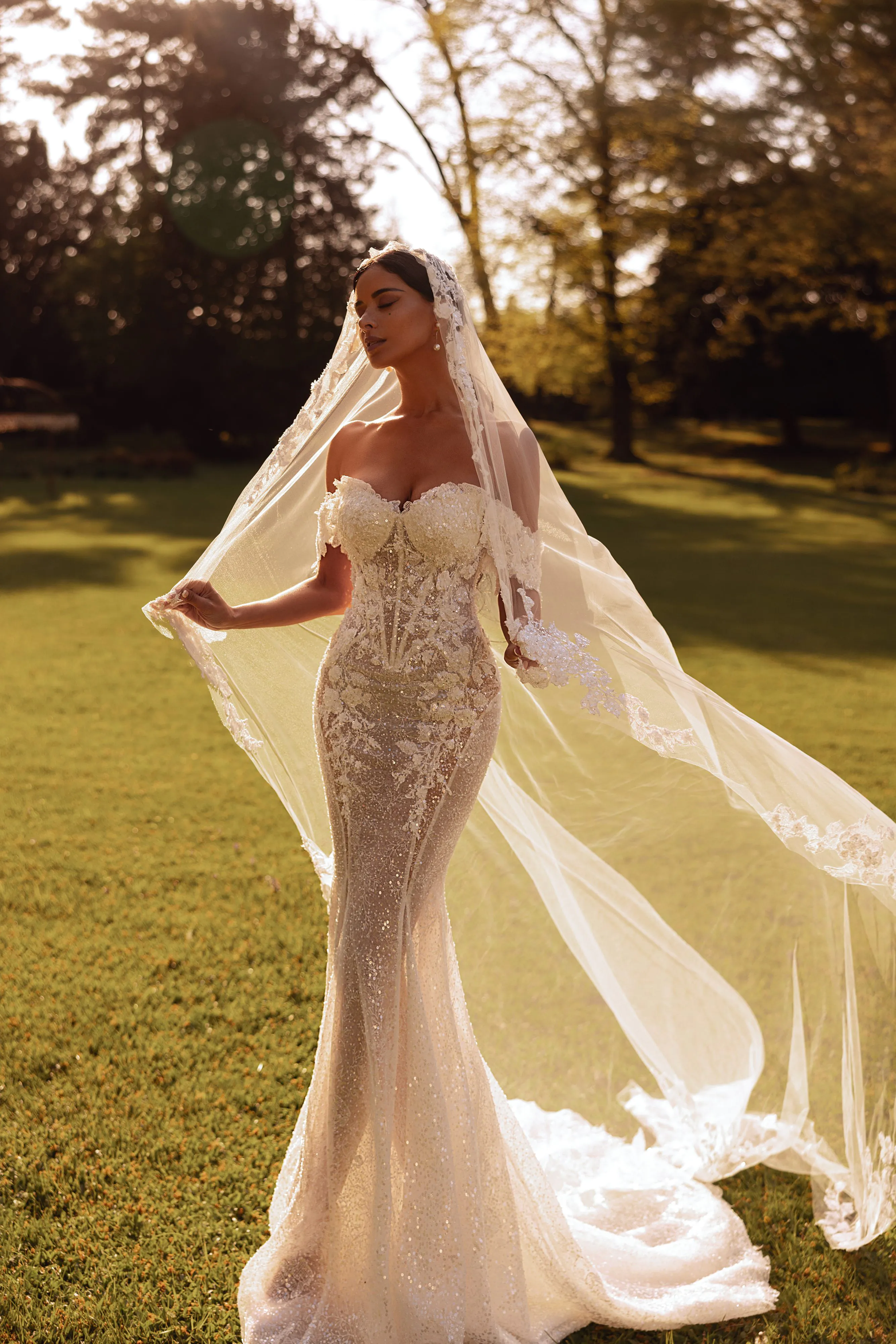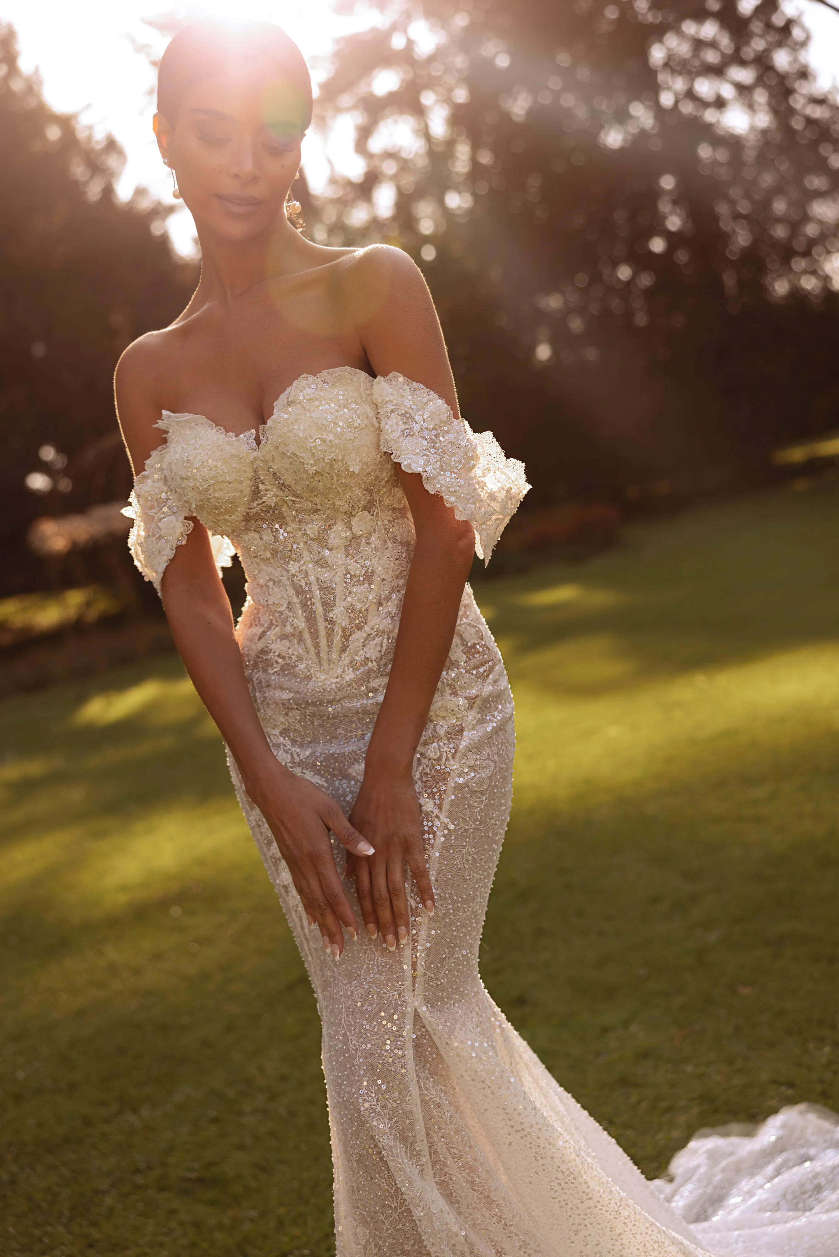 This romantic off-the-shoulder mermaid gown is made from delicate Chantilly lace with subtle sequin detailing that catches the light beautifully. The structured bodice features a flattering V-shaped waistline and is adorned with elegant floral lace appliqués. Sheer tulle inserts along the sides of the hips create a modern, sculpting effect. A long veil with a lace-trimmed edge completes the look, adding a touch of timeless grace.