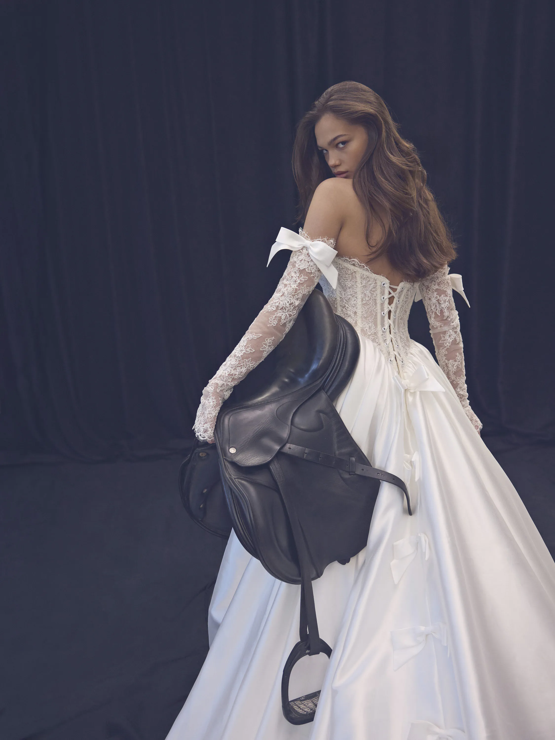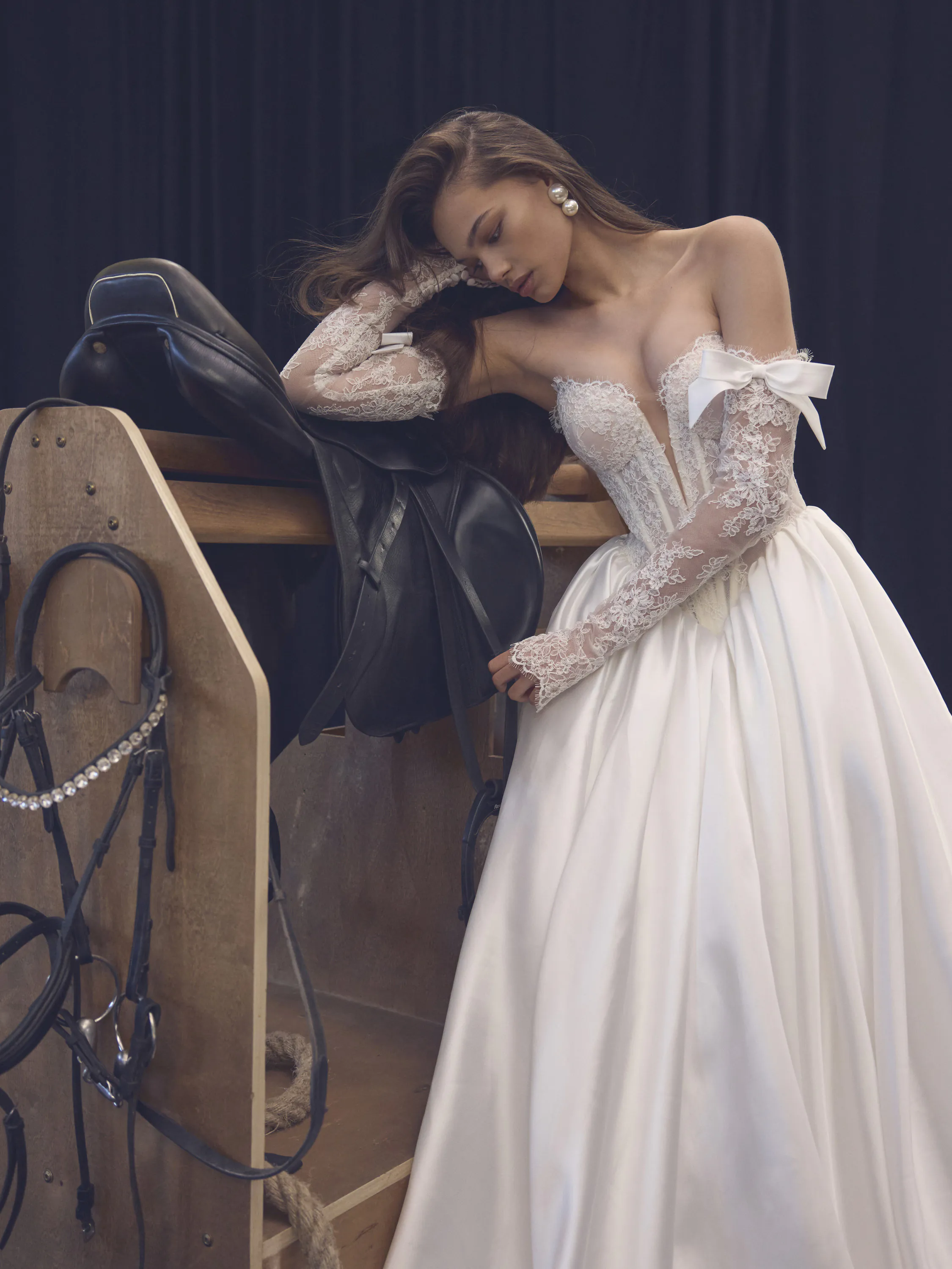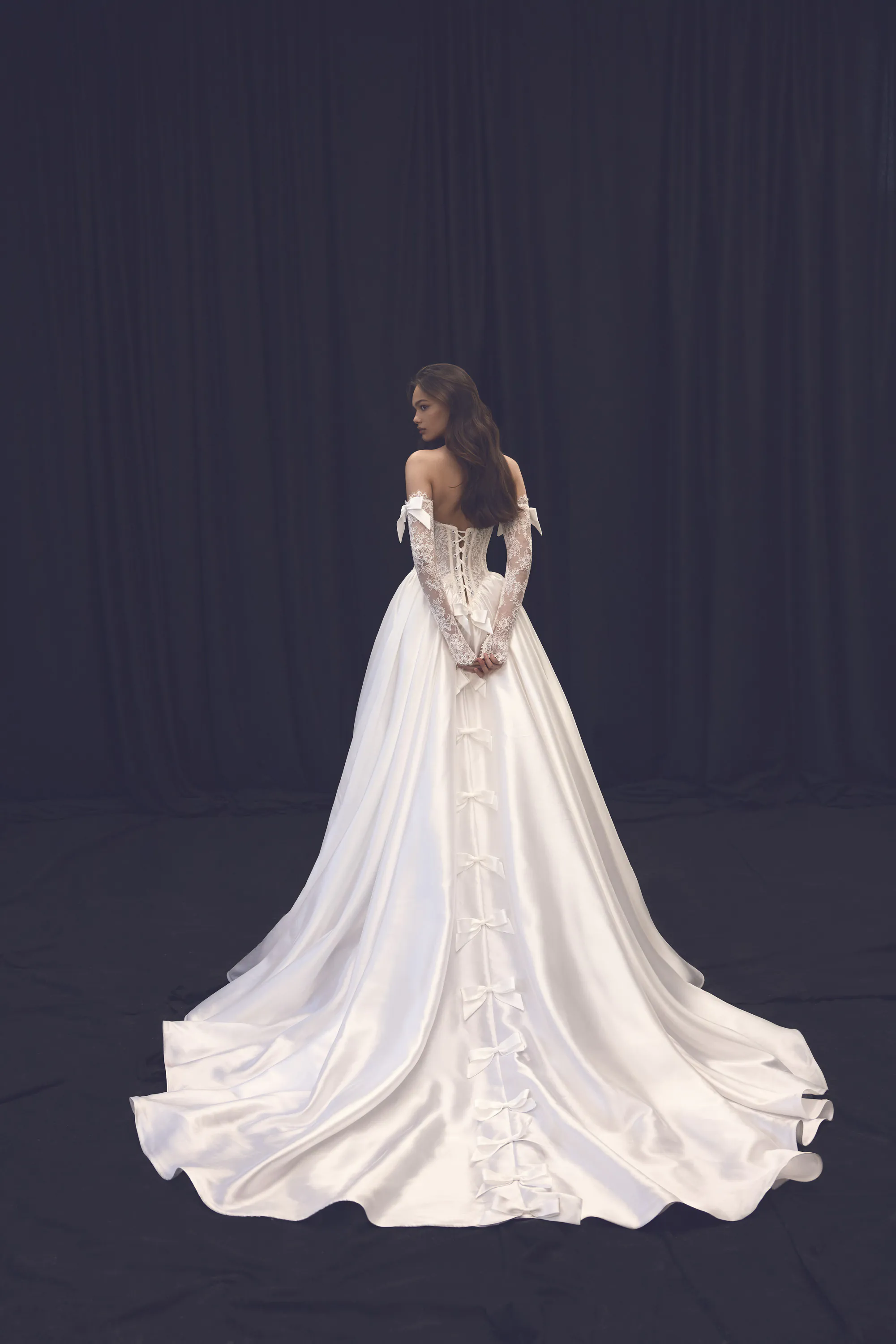 This elegant princess-style gown, crafted from luxurious pearl-toned Mikado fabric, embodies refined sophistication and romantic charm. The elongated V-shaped semi-sheer corset, made from delicate corded lace, beautifully accentuates the figure while adding a touch of lightness and femininity. The back of the gown is adorned with a graceful row of bows that extend all the way to the edge of the train, creating a striking and memorable detail. Completing the look are detachable lace sleeves with charming little bows — a playful yet elegant addition that allows the bride to transform her look with ease.