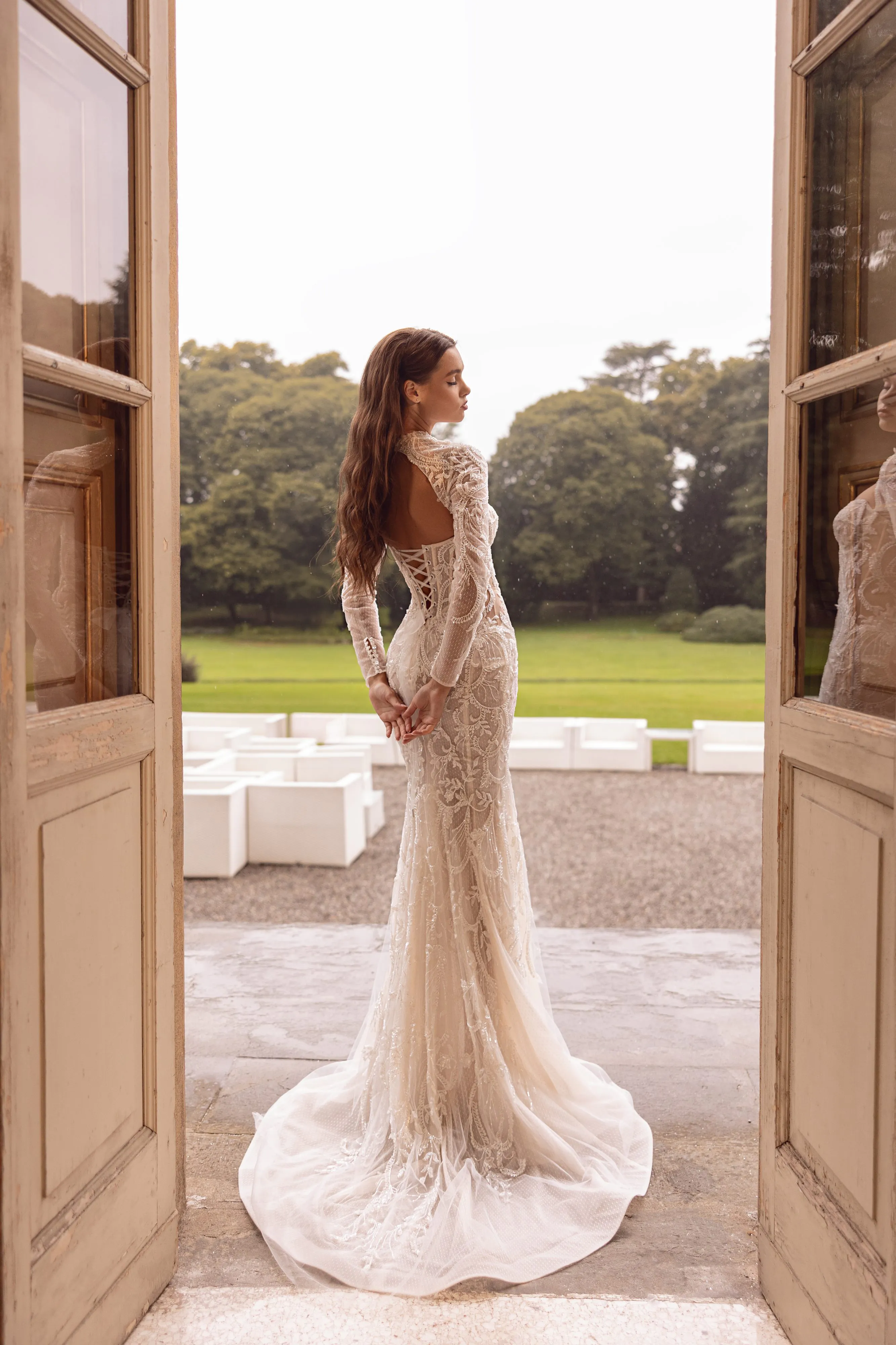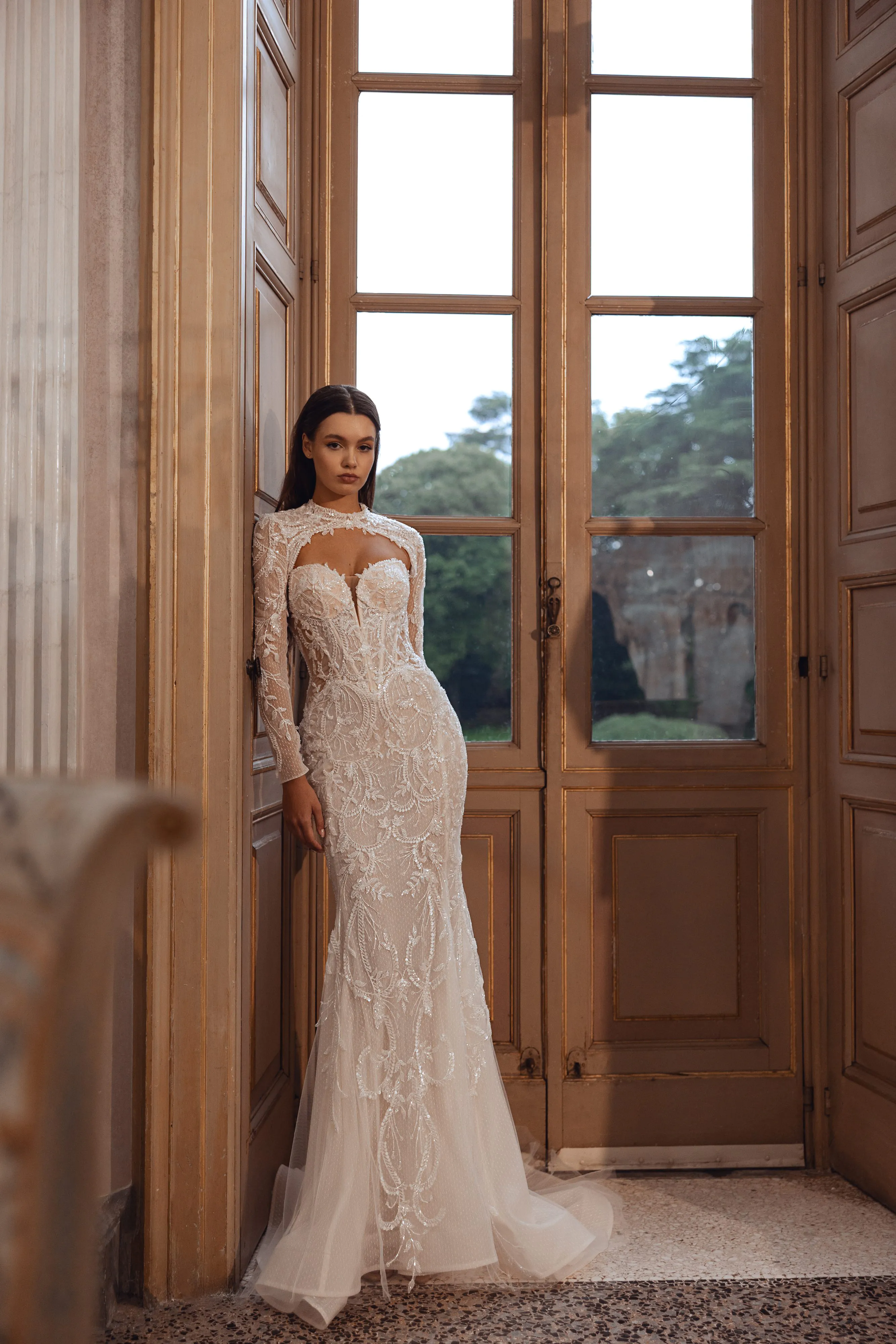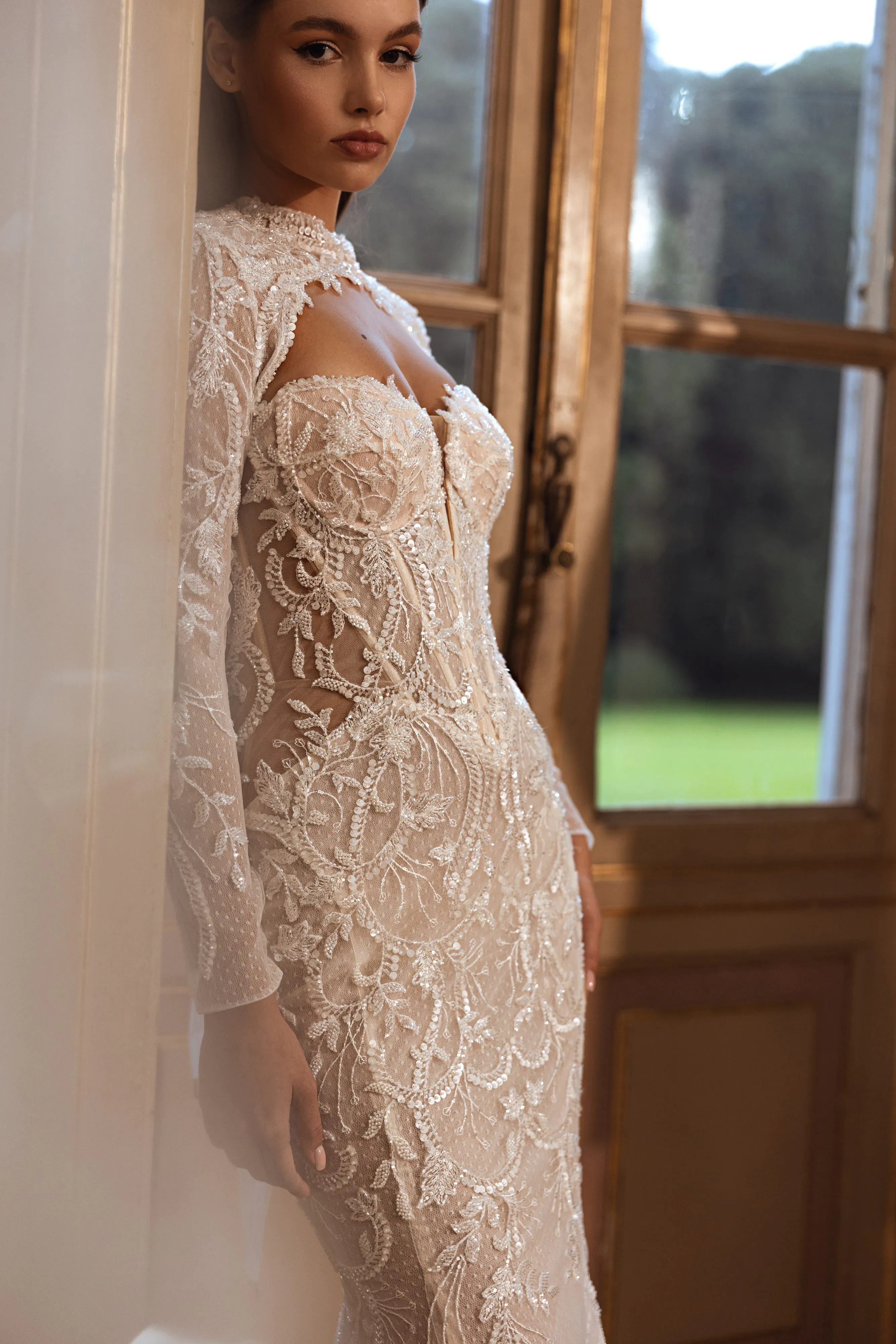 This exquisite mermaid gown in soft milk-colored lace features an intricate embroidered pattern of lace and crystals on a nude mesh base. The dress is adorned with transparent side cutouts, beautifully embellished with the same lace, adding a touch of sensuality and elegance. It also includes a detachable bolero with long sleeves, adding a graceful and romantic element to the overall look.