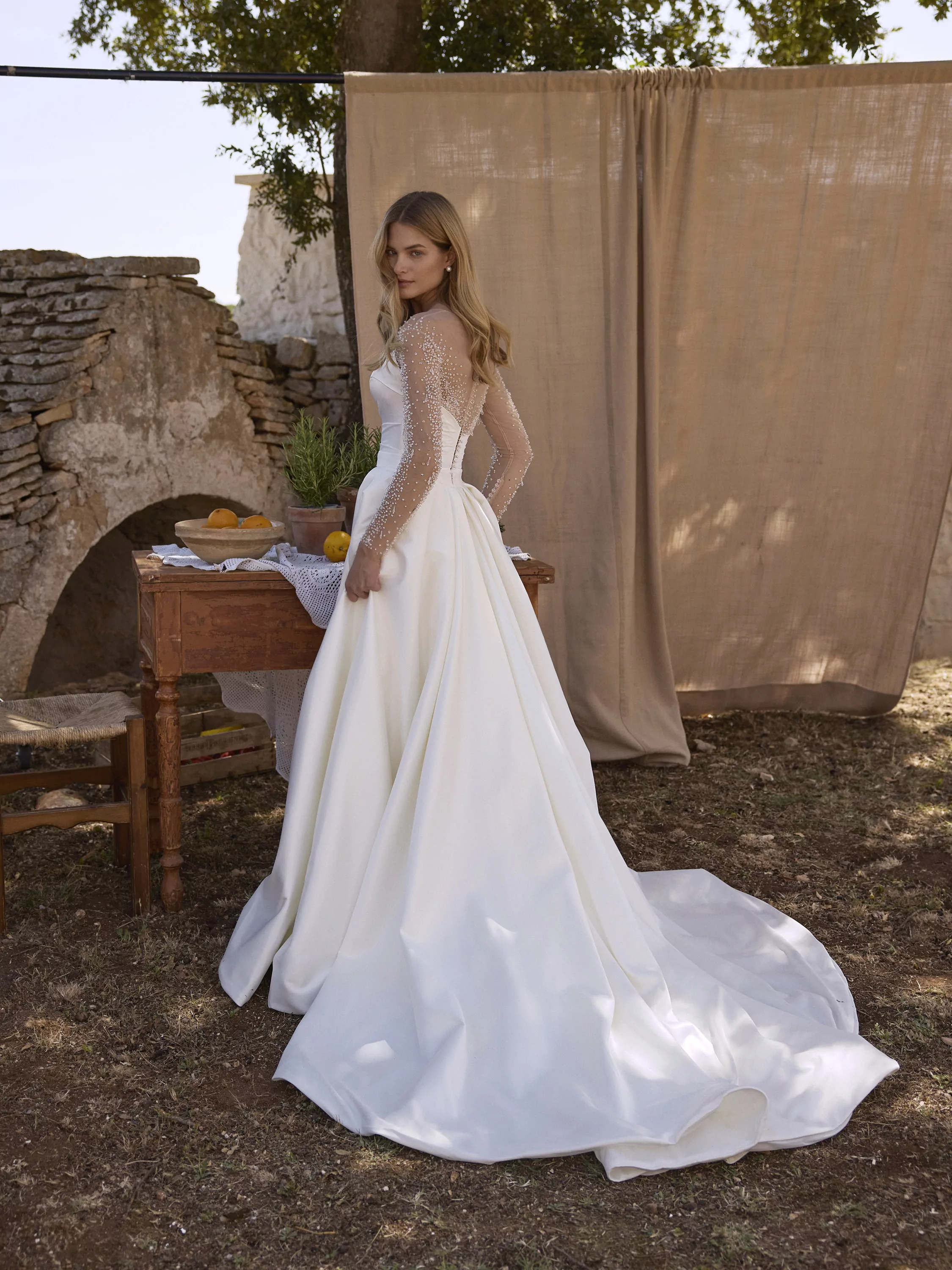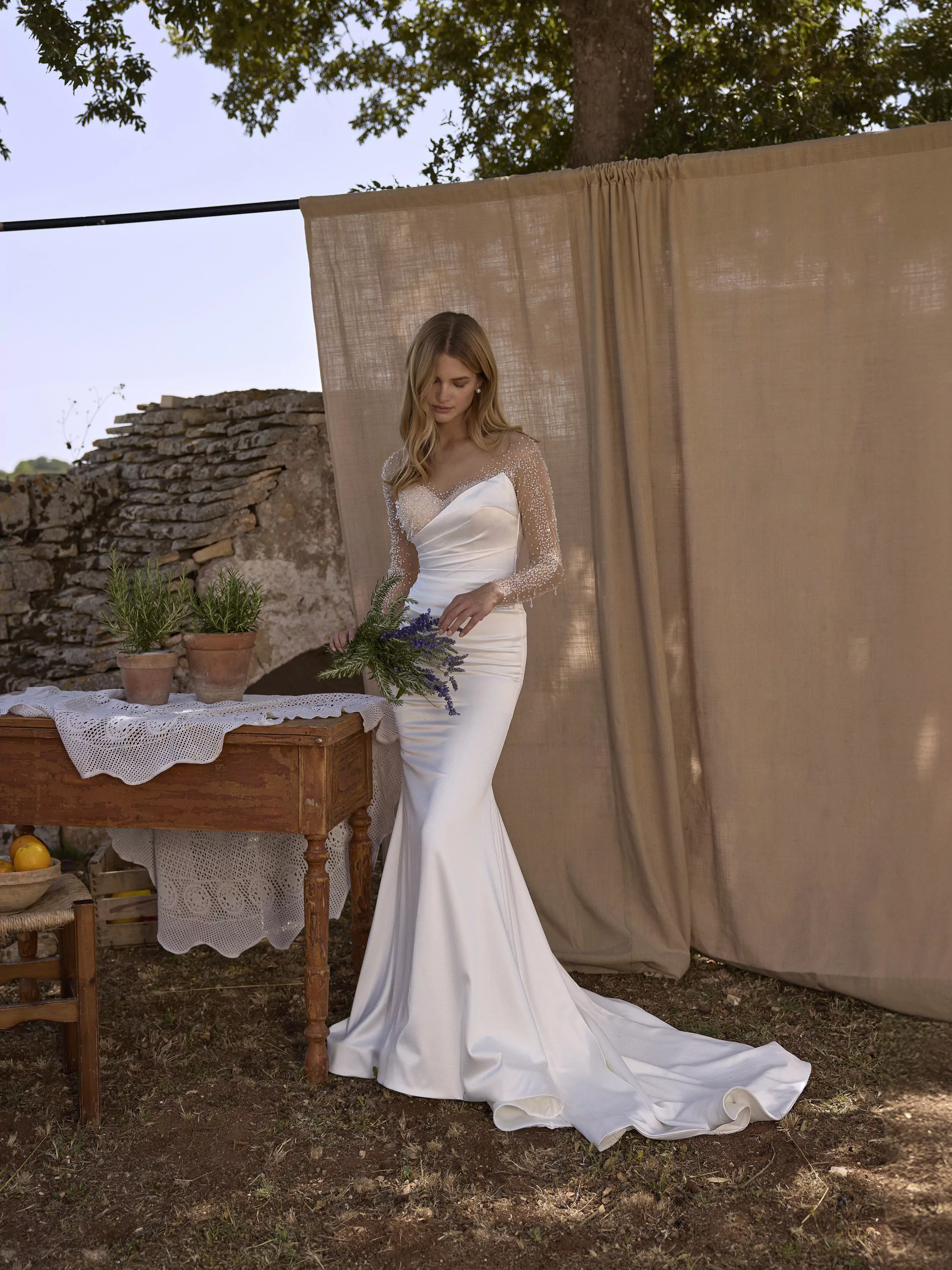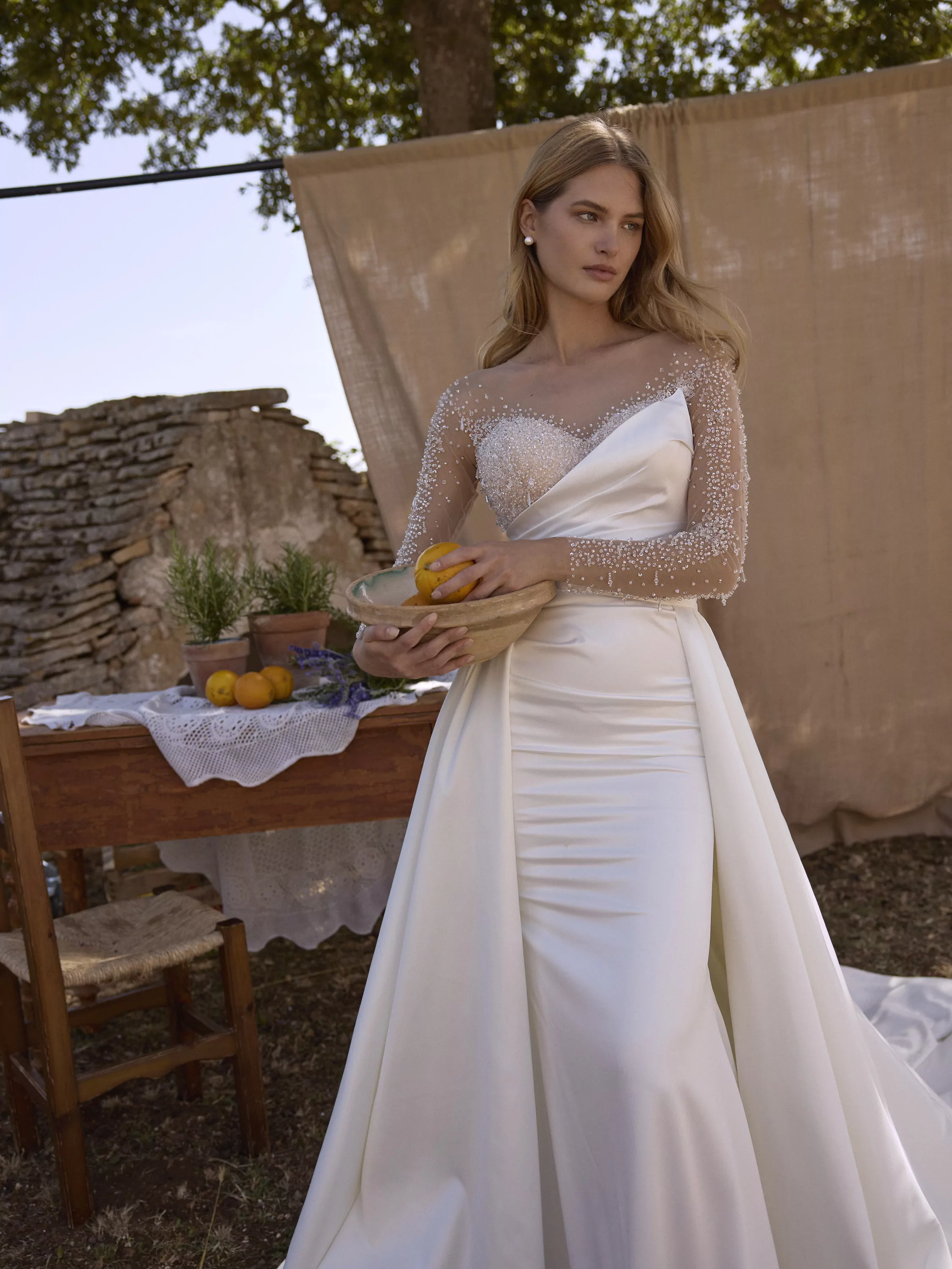 The dress features a mermaid silhouette, made from milk-colored stretch satin with draping over the corset, beneath which lies nude mesh. The mesh is embellished with intricate bead work and rhinestones, extending across the entire corset and long sleeves. The dress is completed with a detachable satin skirt, featuring a slim waistband and a dramatic long train.