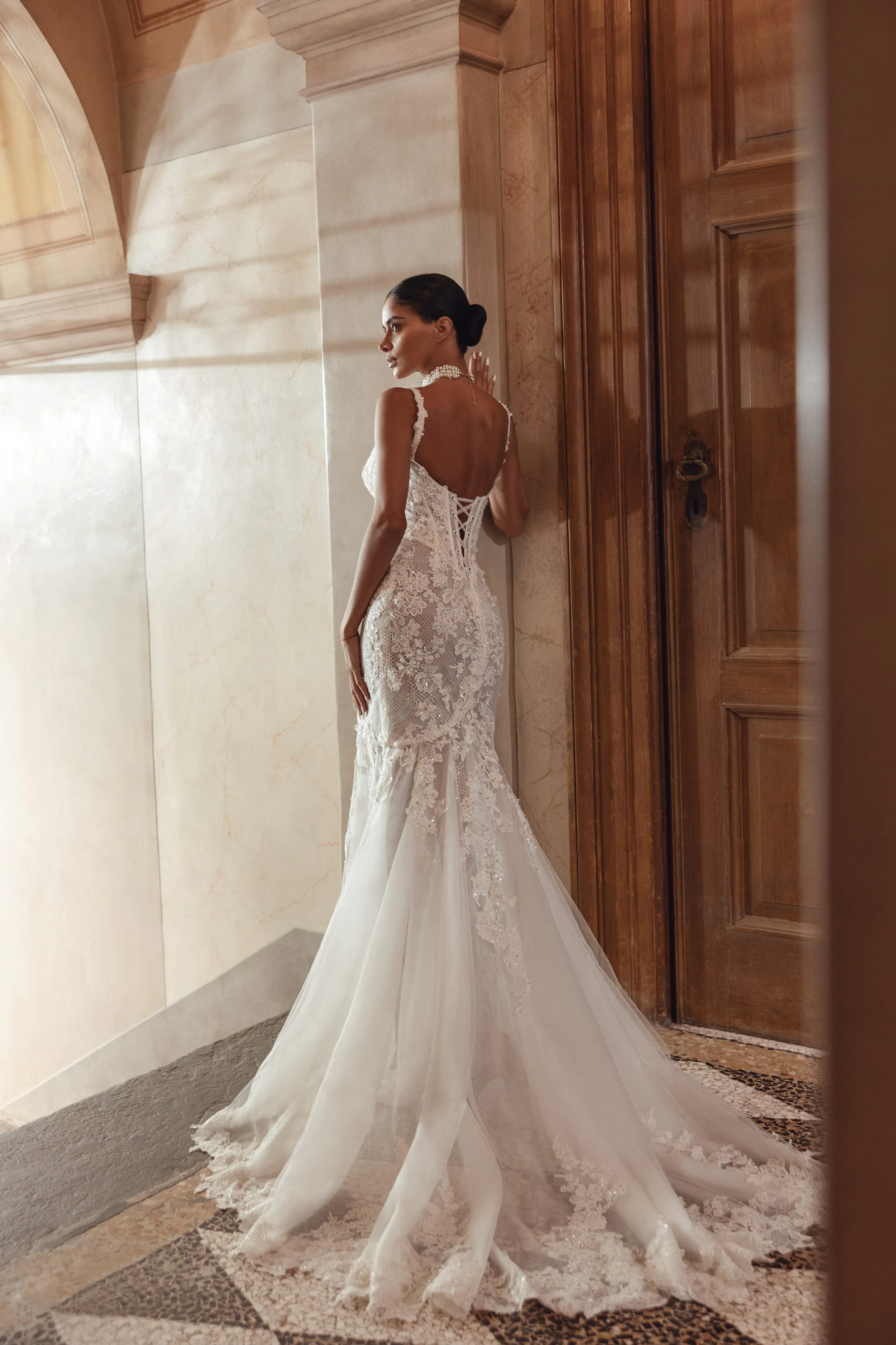 This exquisite mermaid gown in a soft milk shade is made from delicate corded lace and mesh. Featuring a daring center slit and thin straps, the dress offers a perfect blend of elegance and sensuality. The corset is beautifully adorned with pearl beads and intricate 3D flowers, adding a touch of opulence and femininity.
