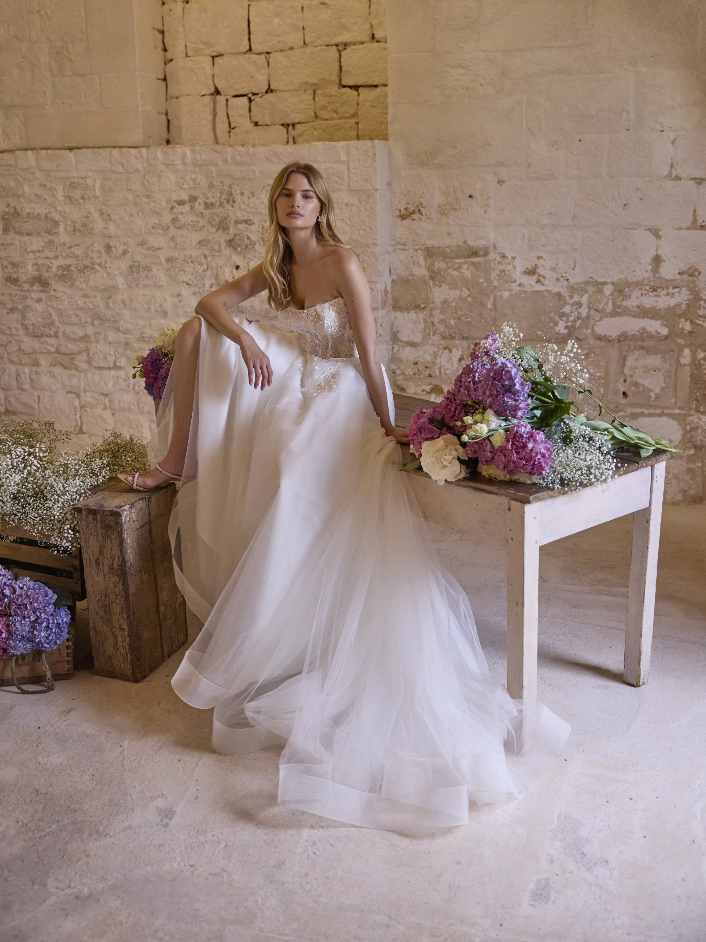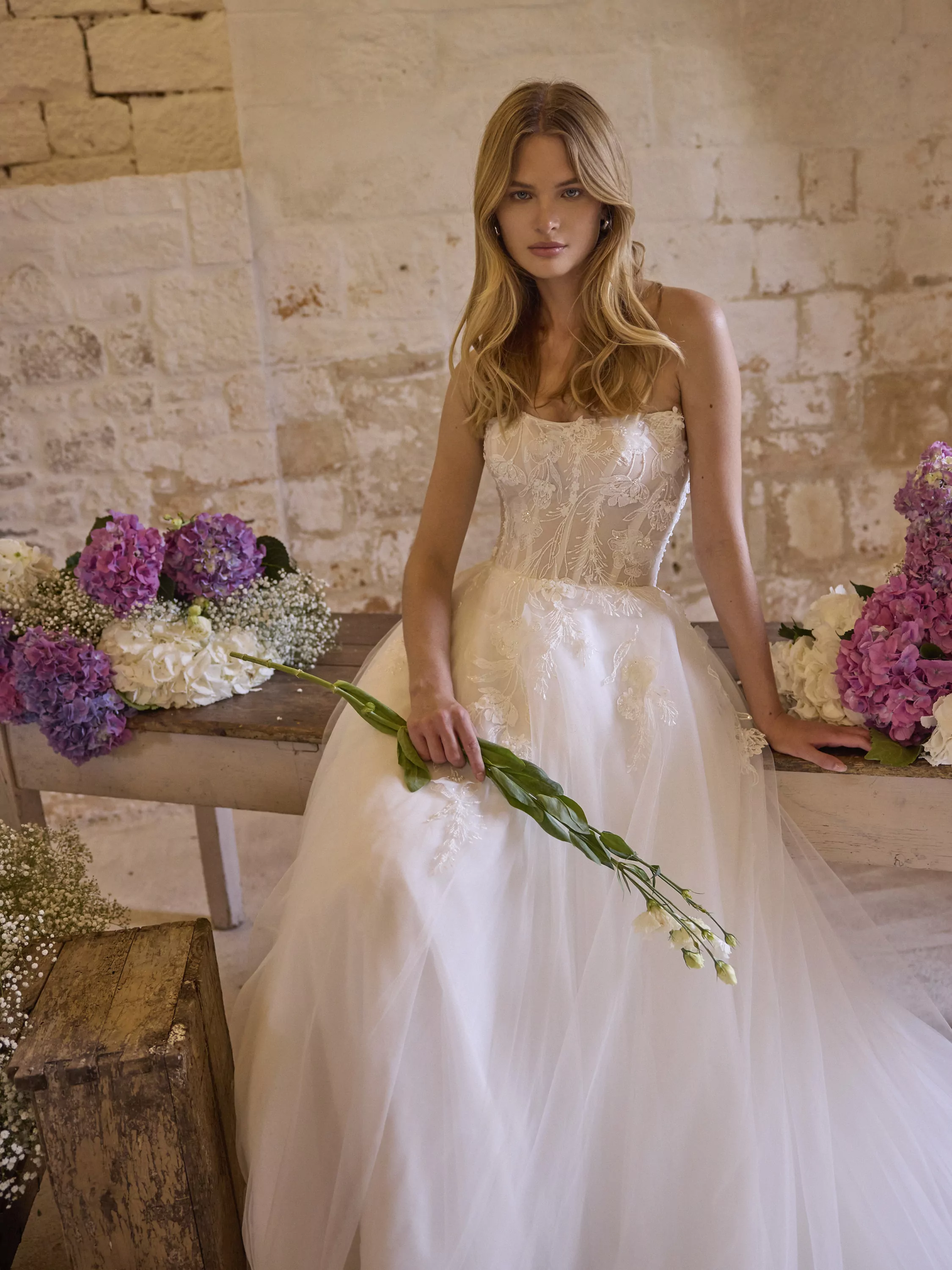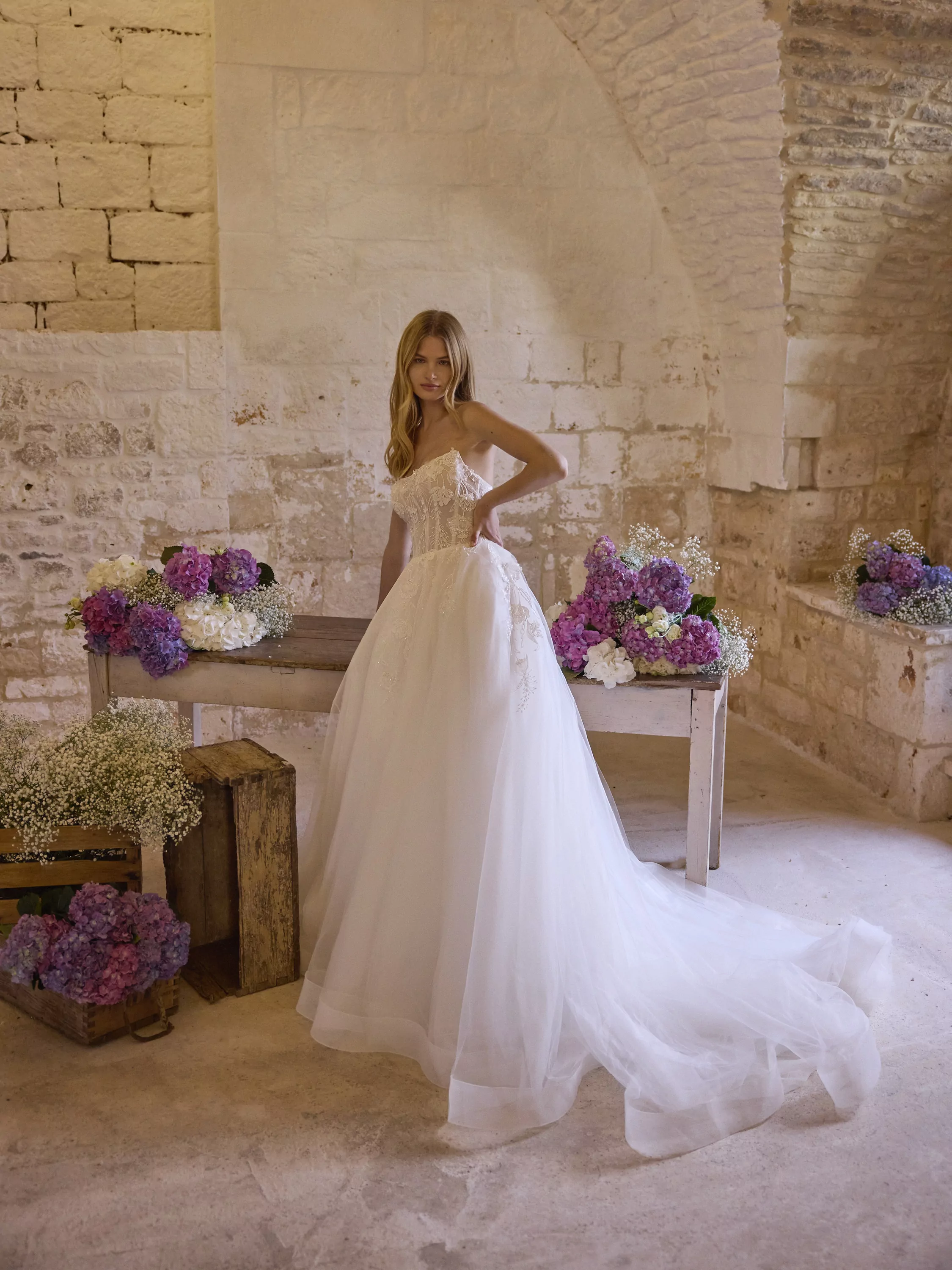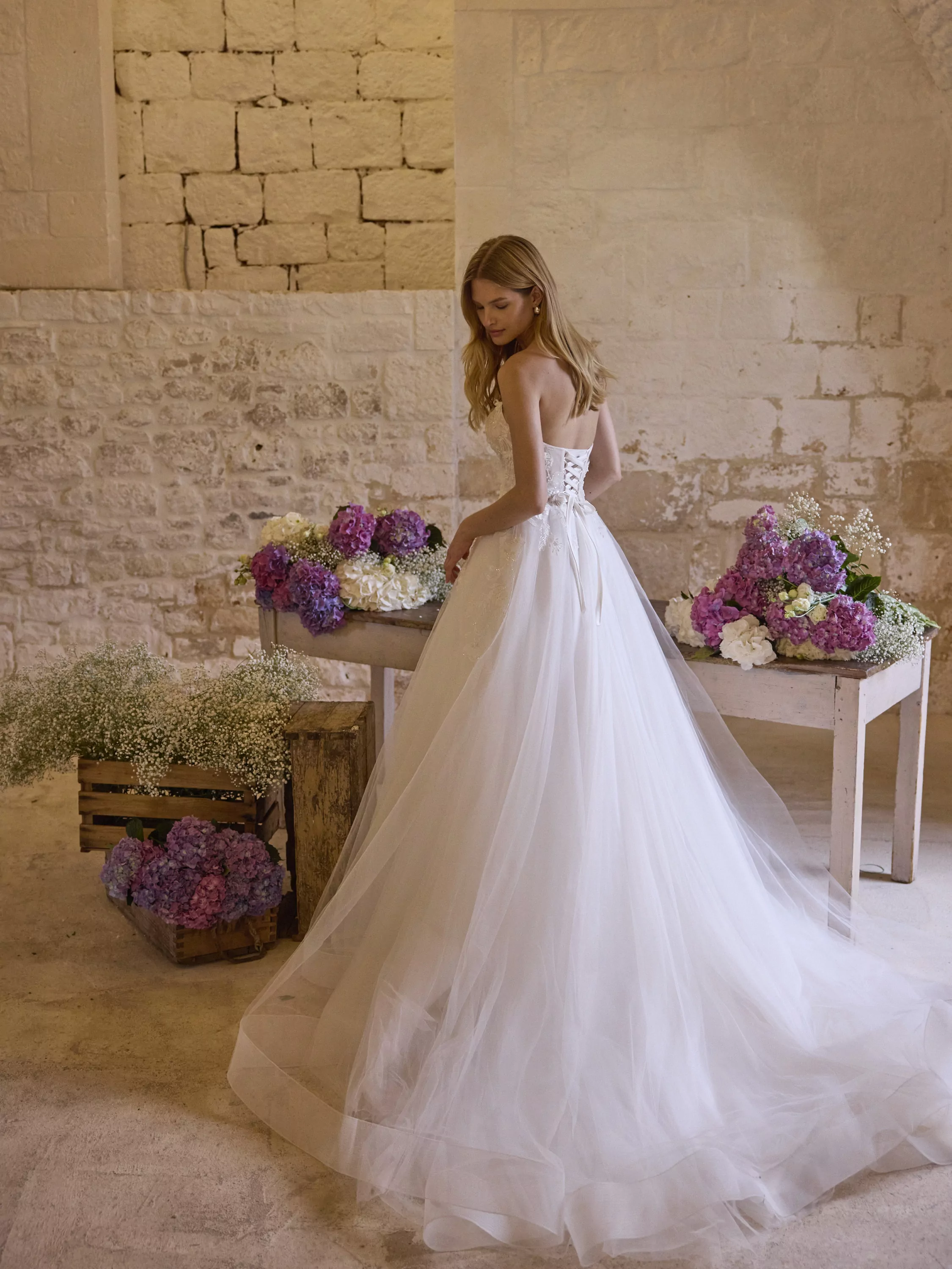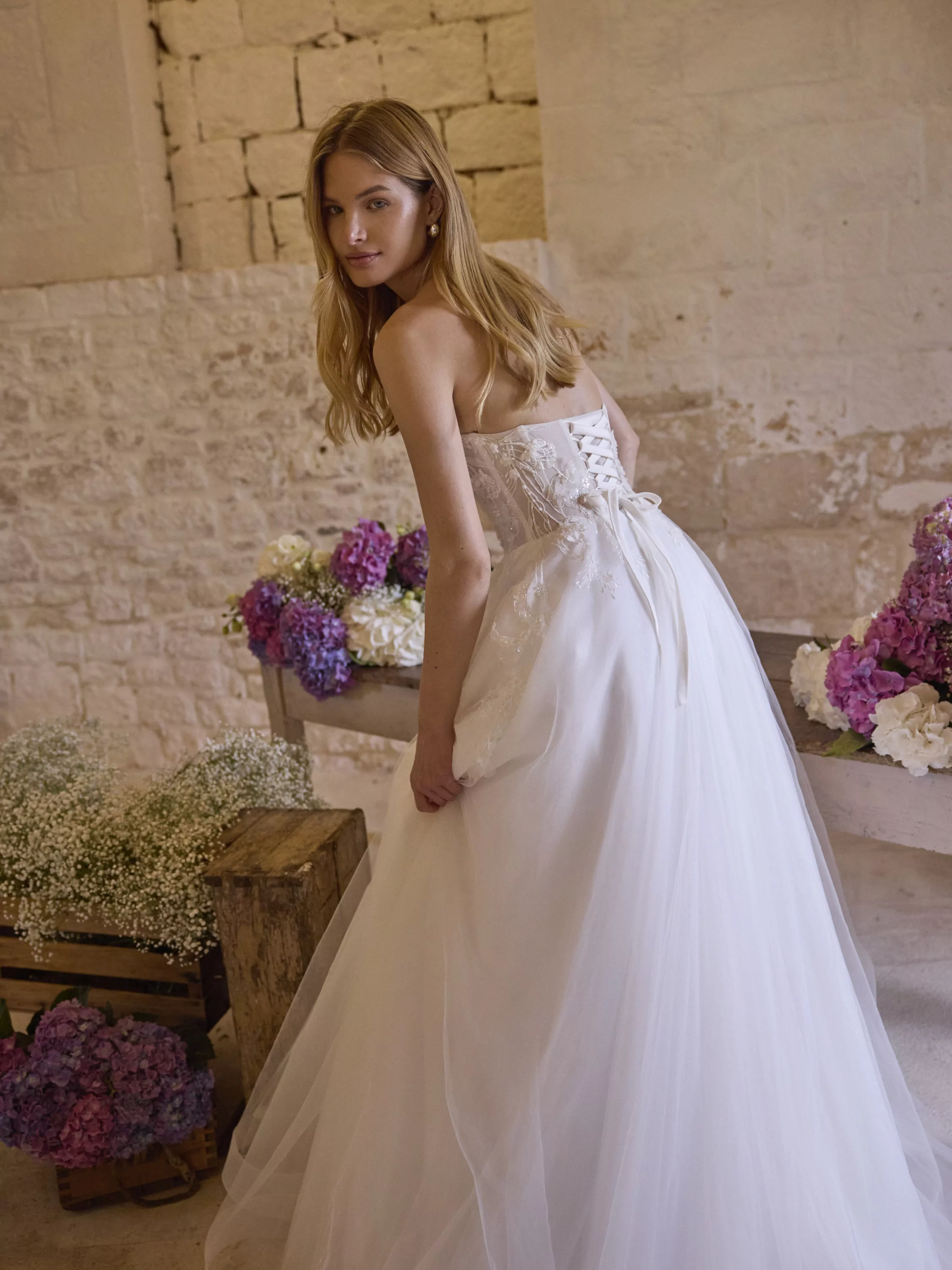The dress features a princess silhouette, crafted from soft tulle with a semi-transparent corset adorned with intricate lace embroidery. The back is finished with delicate lacing for an elegant, adjustable fit.