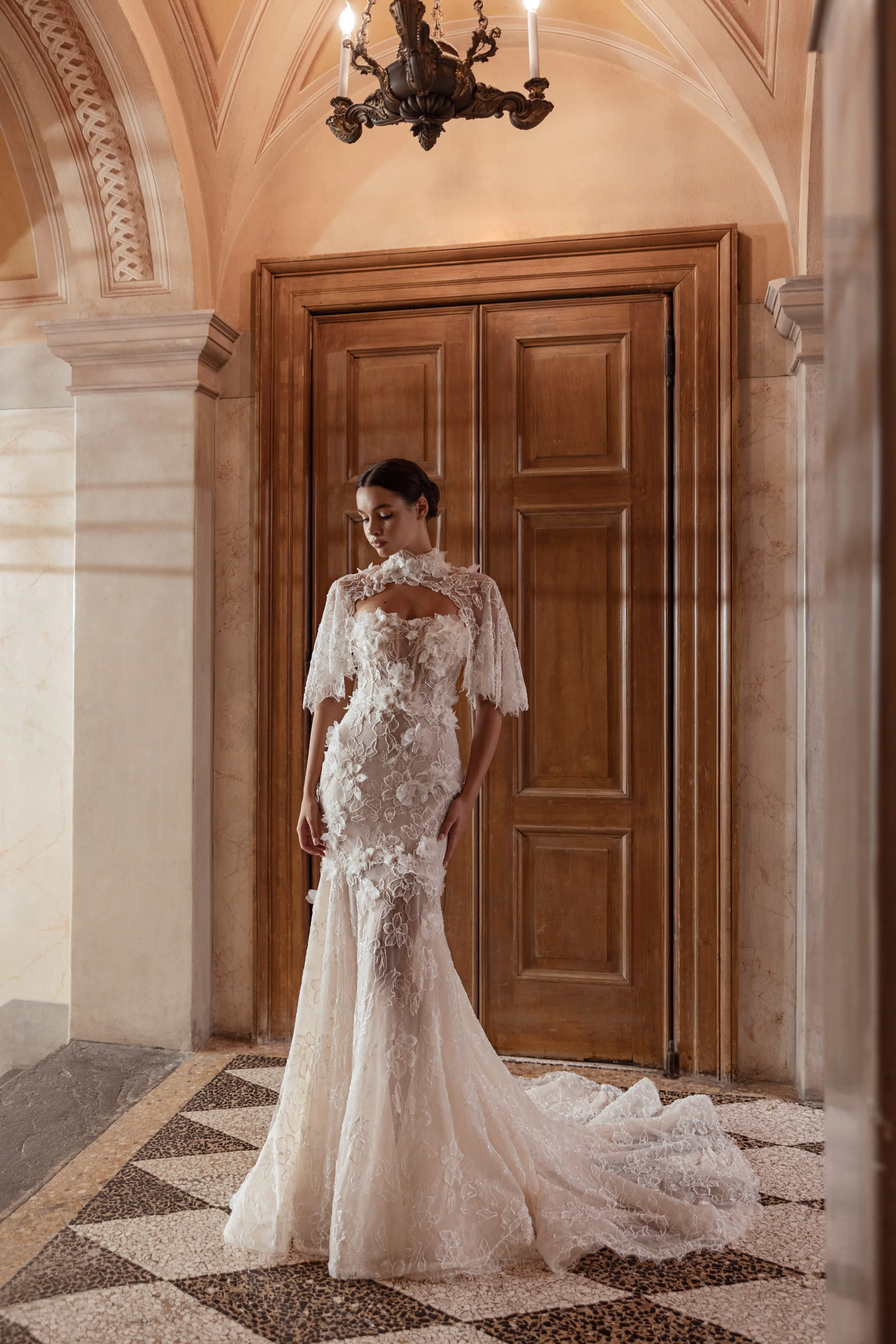 This enchanting mermaid gown in delicate ivory nude lace offers a soft and romantic feel. Adorned with intricate 3D flowers, the dress exudes elegance and sophistication. It is beautifully complemented by a removable cape that covers the shoulders, adding a graceful touch and versatility to the look. Perfect for the bride who desires a blend of classic beauty and modern charm.