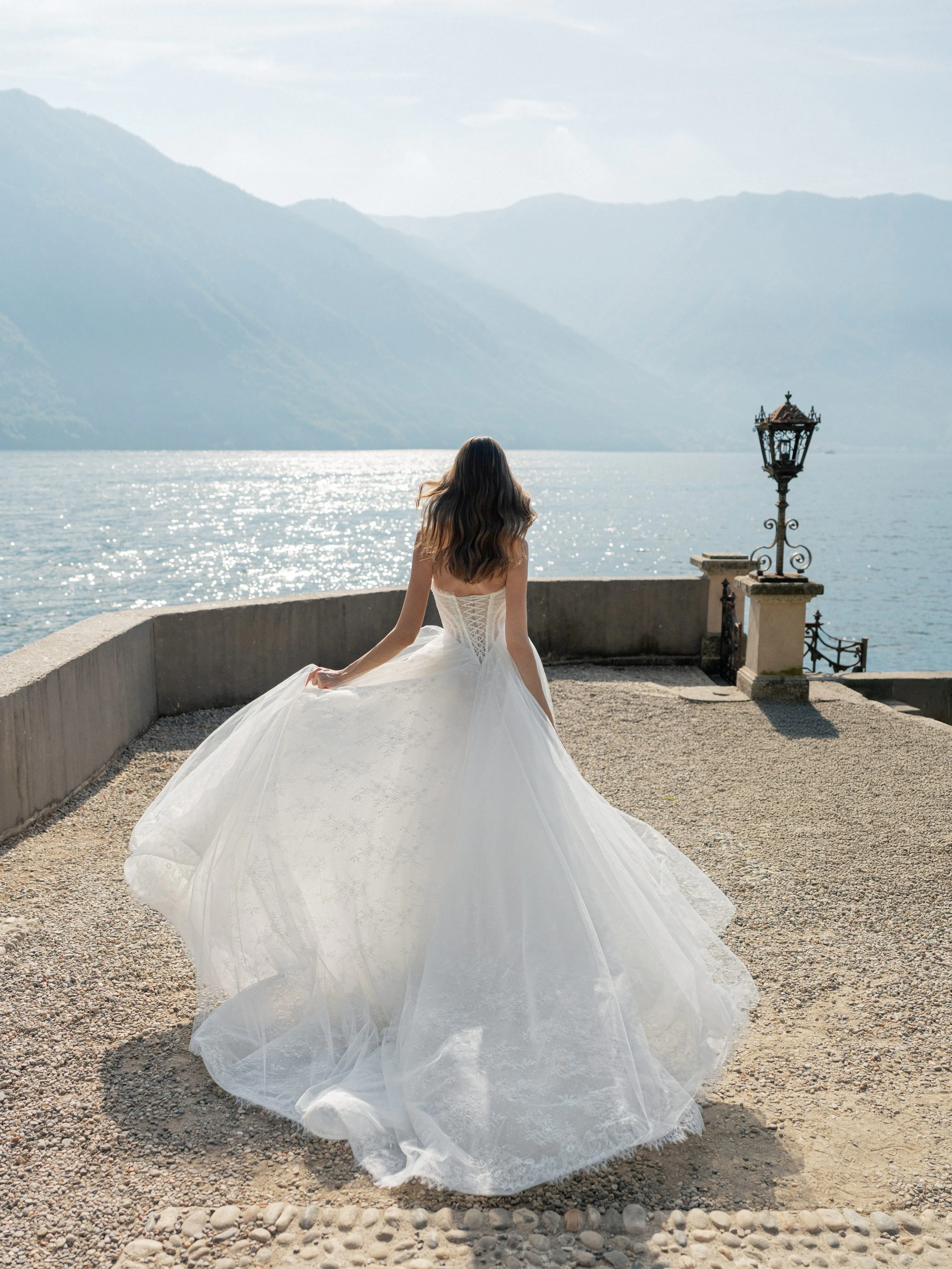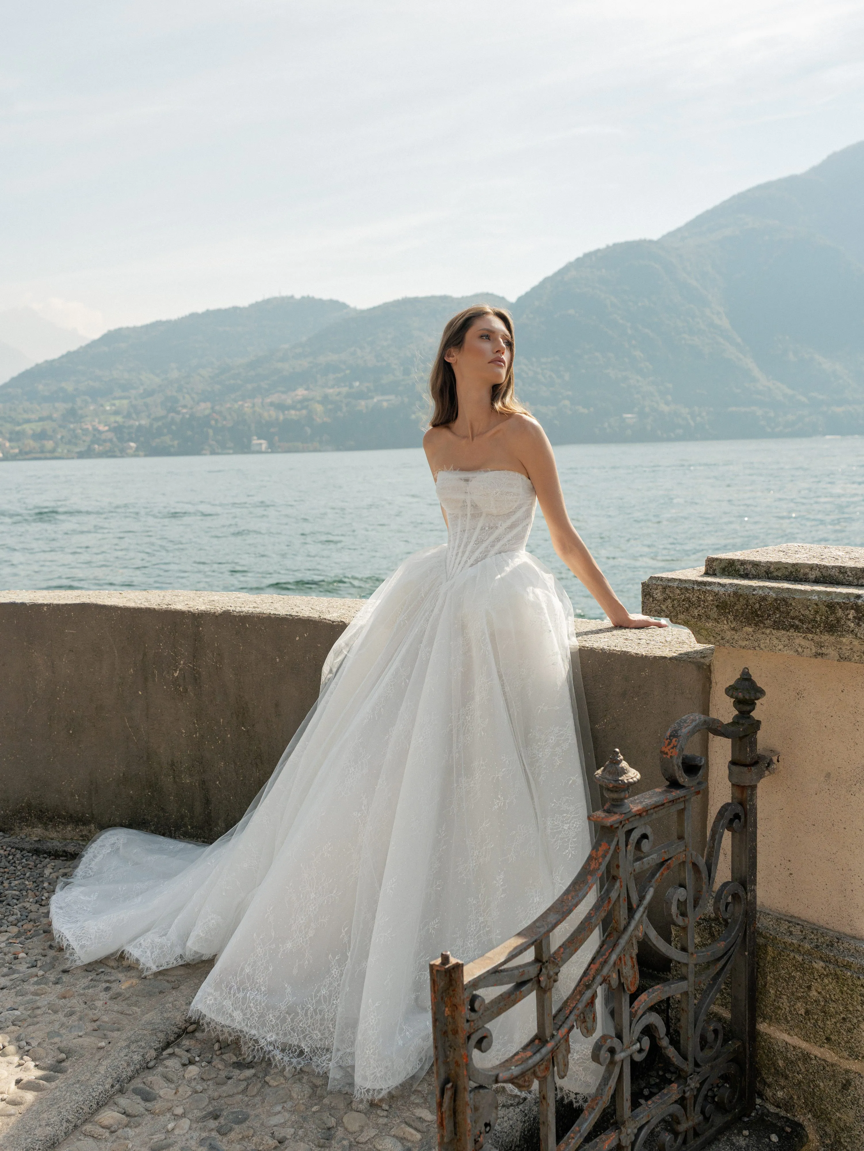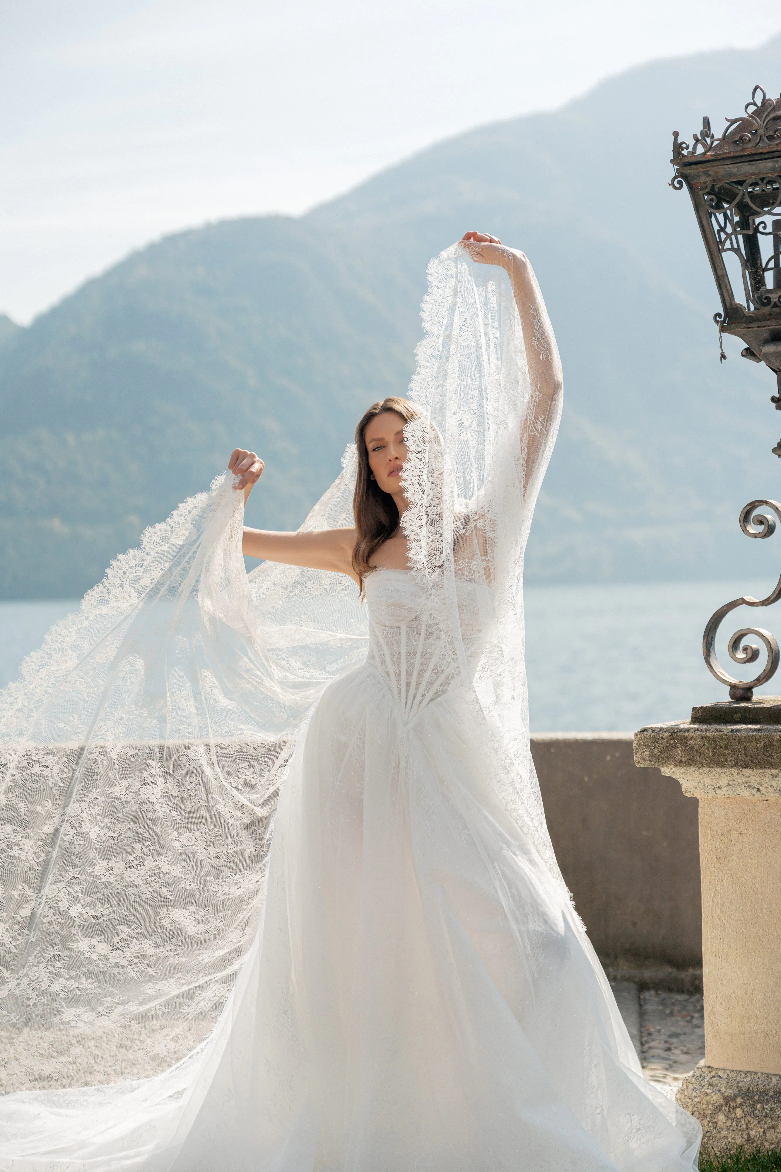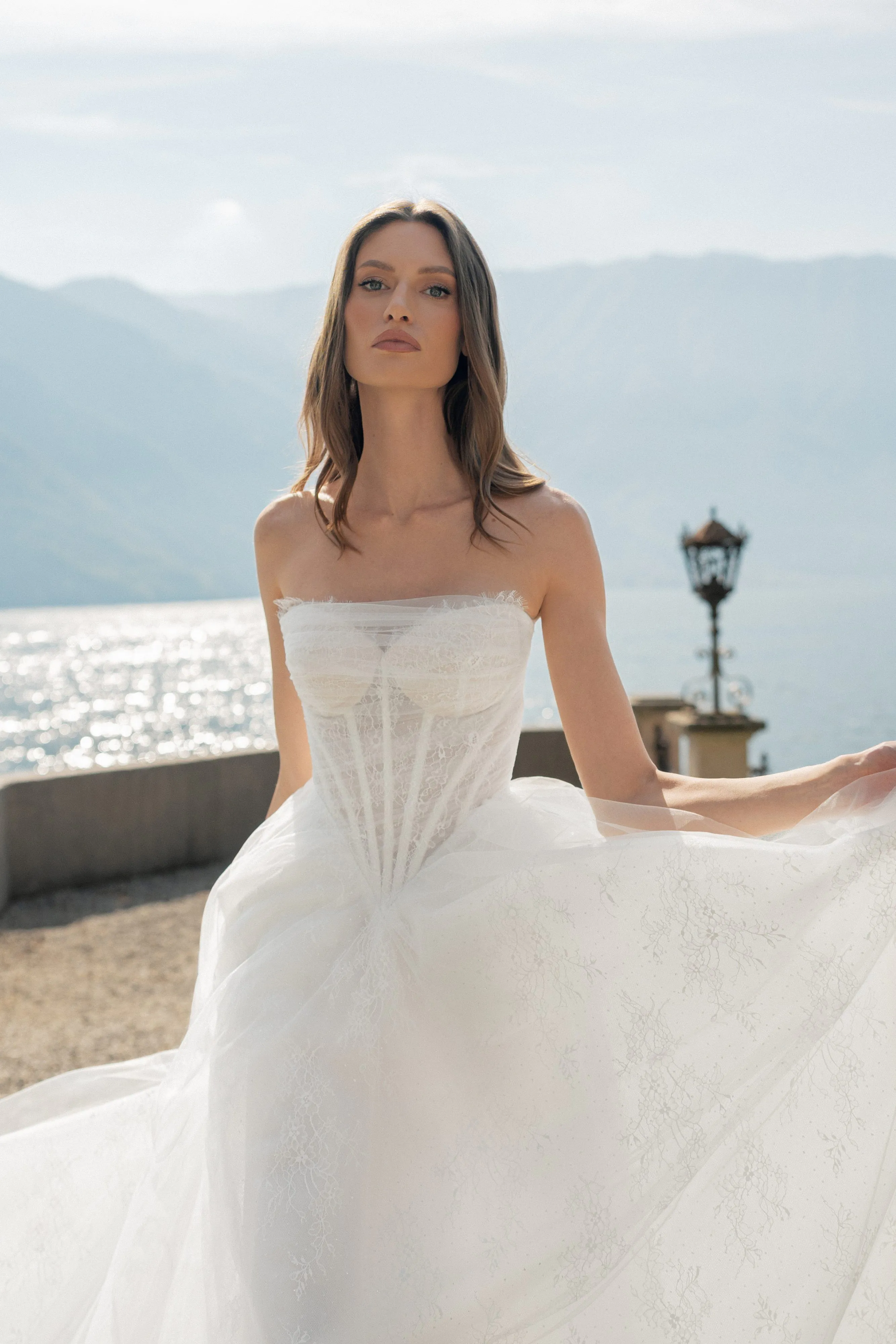 A stunning princess gown crafted from Chantilly lace and sparkle tulle, featuring a V-shaped elongated corset that is semi-sheer with accentuated boning on the bodice. The bodice is enhanced with gathered tulle detailing, creating a delicate texture and adding depth to the silhouette.
