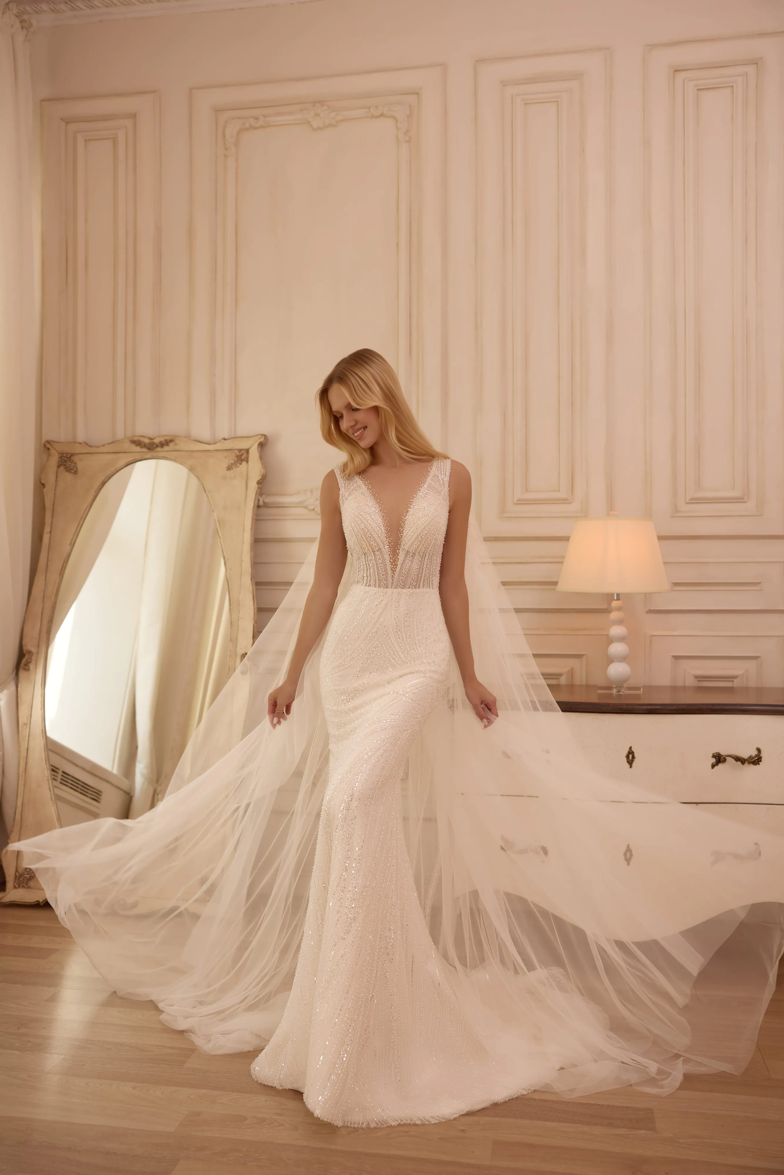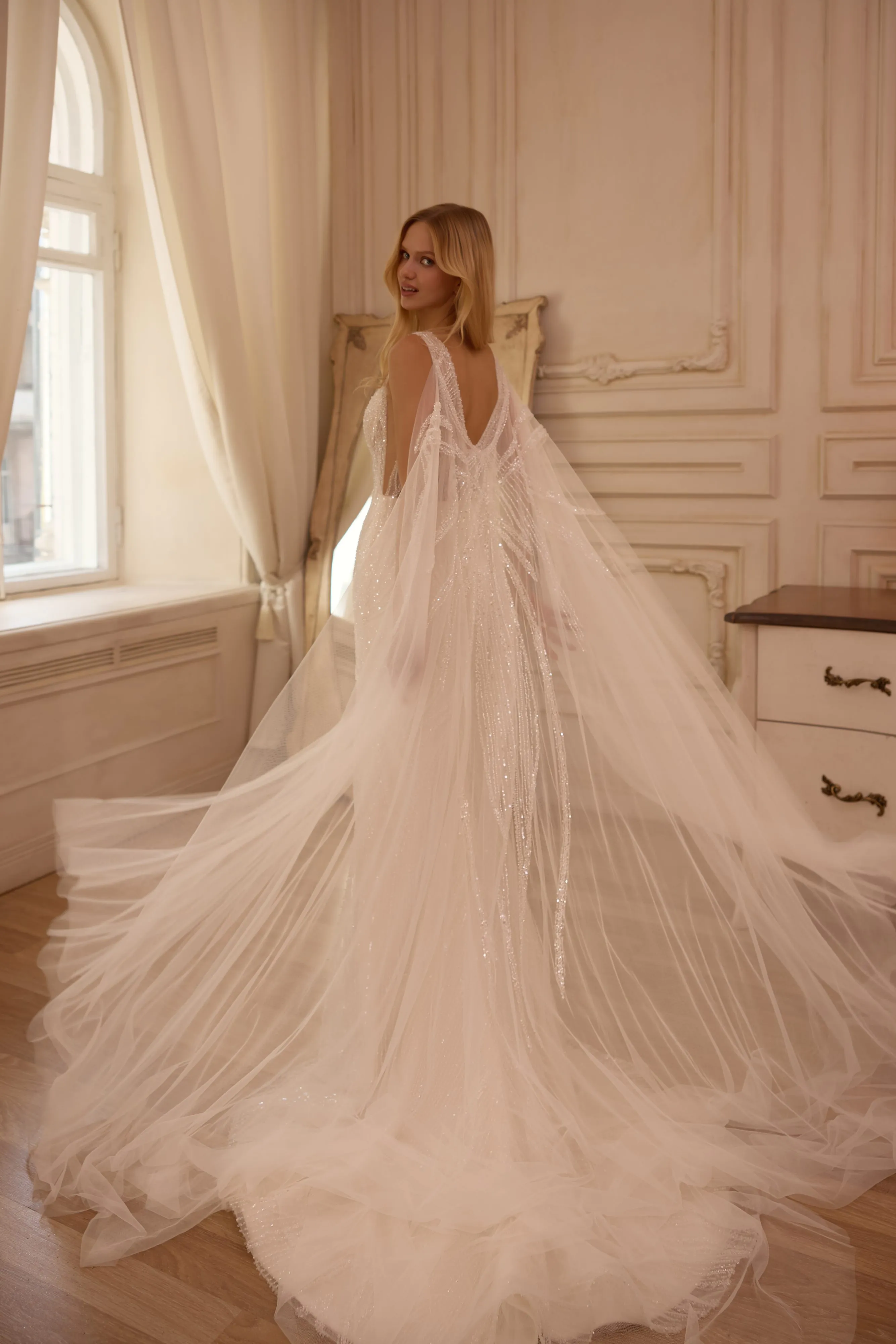 This striking mermaid gown is made from luxurious beaded lace and features an illusion deep neckline paired with a semi-sheer corset, adding a touch of sensual elegance. The look is completed with a detachable tulle cape that attaches at the back. The cape is delicately adorable with lace detailing, creating a seamless, romantic finish from behind.