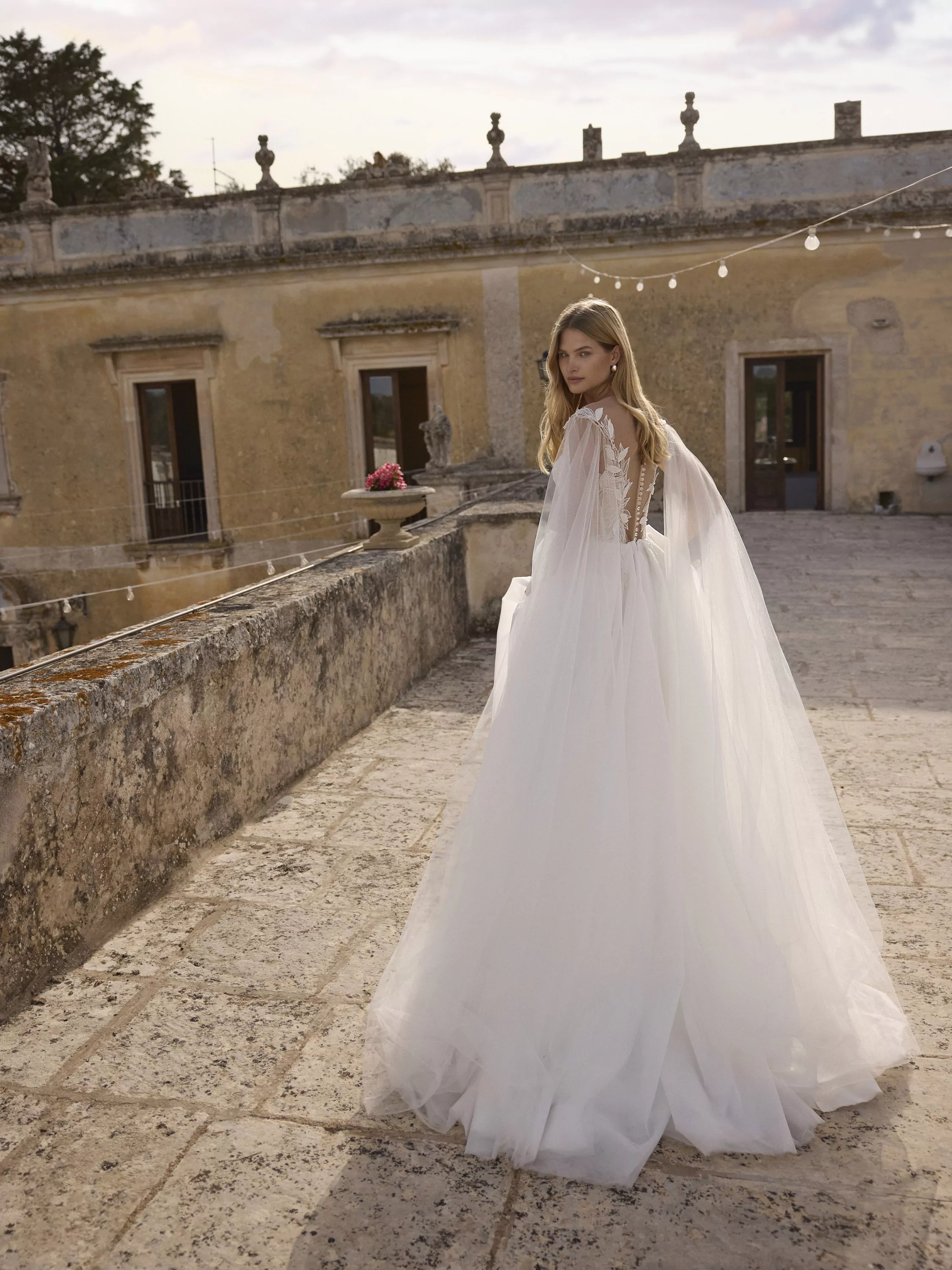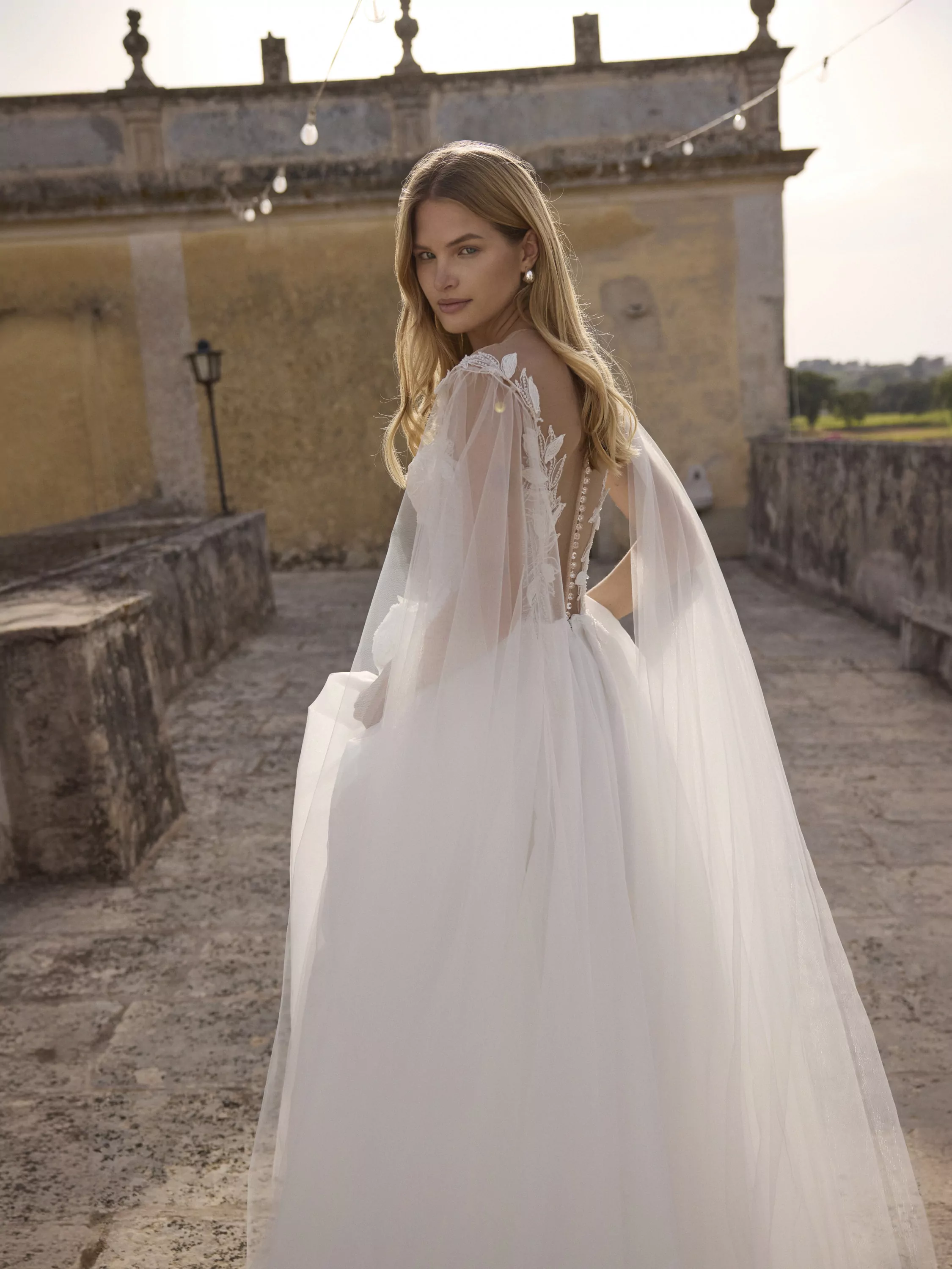The dress features an A-line silhouette with a leg slit, crafted from soft milk-colored tulle. The corset is decorated with lace in the shape of petals, which extends along the shoulder straps. The back is adorned with a row of buttons on nude mesh. The dress also features ethereal mesh wings that gently cascade down the arms from the shoulder line.