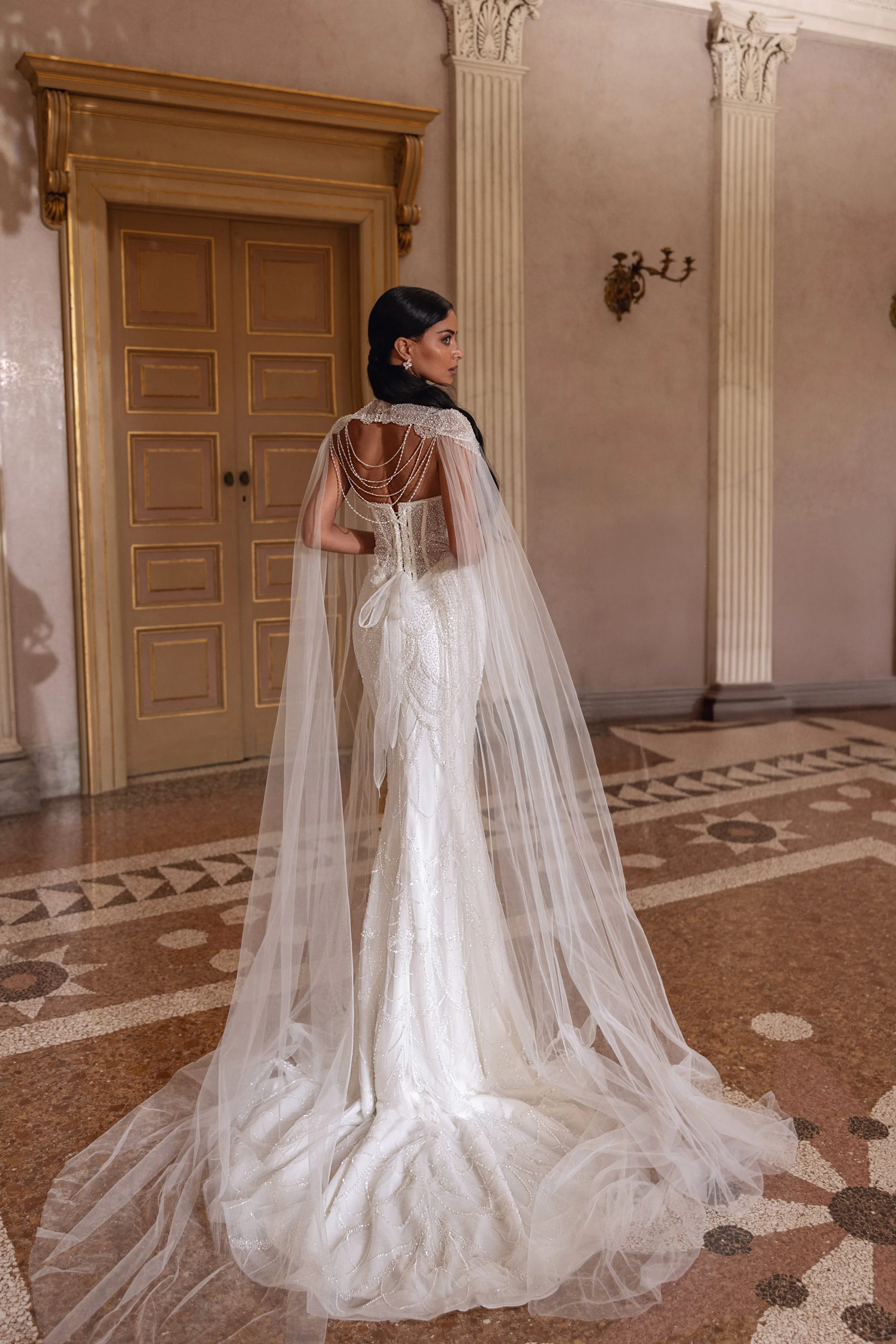 A breathtaking mermaid gown crafted from beaded lace, featuring a heart-shaped neckline. Cascading layers of lace flow gracefully down to the hem, creating a dramatic and elegant silhouette. The look is completed with a detachable royal cape made from matching beaded lace, fastening at the neck. From the shoulders, ethereal tulle sleeves fall like wings, forming a soft train. Sparkling beaded embellishments on the back of the cape add a final touch of enchantment and glamour.