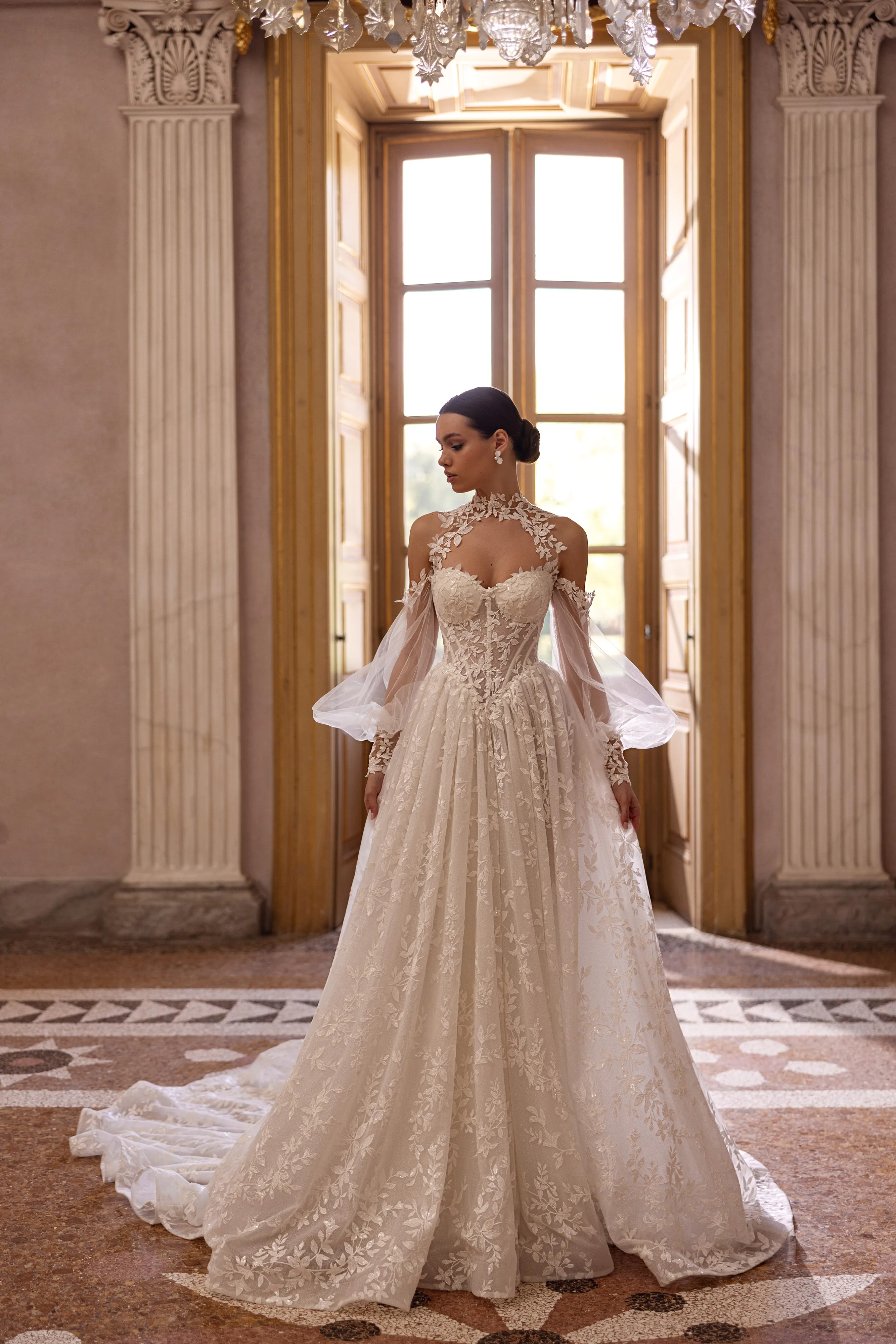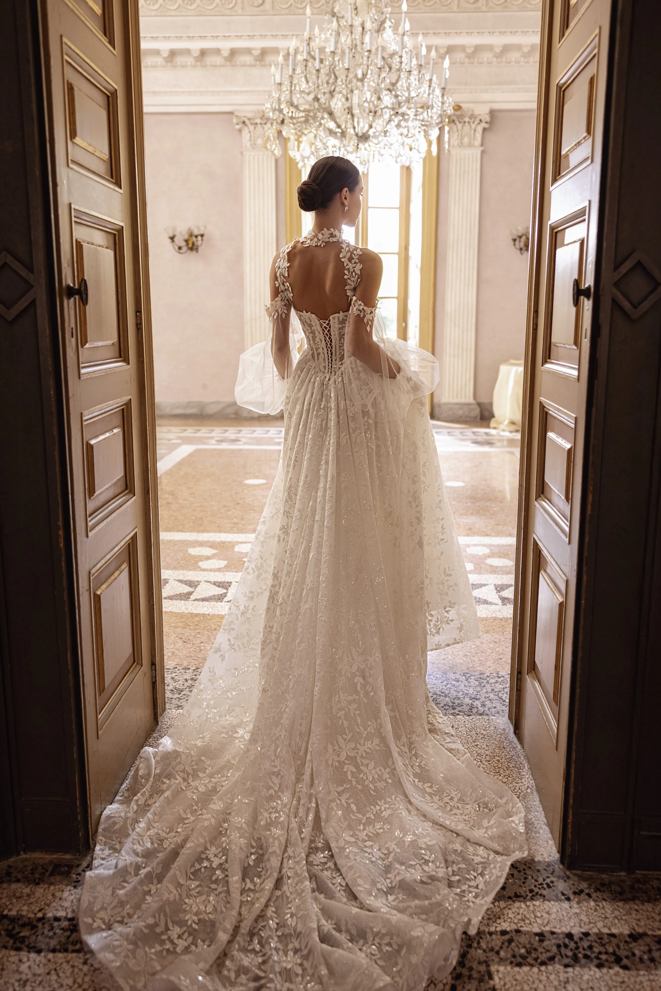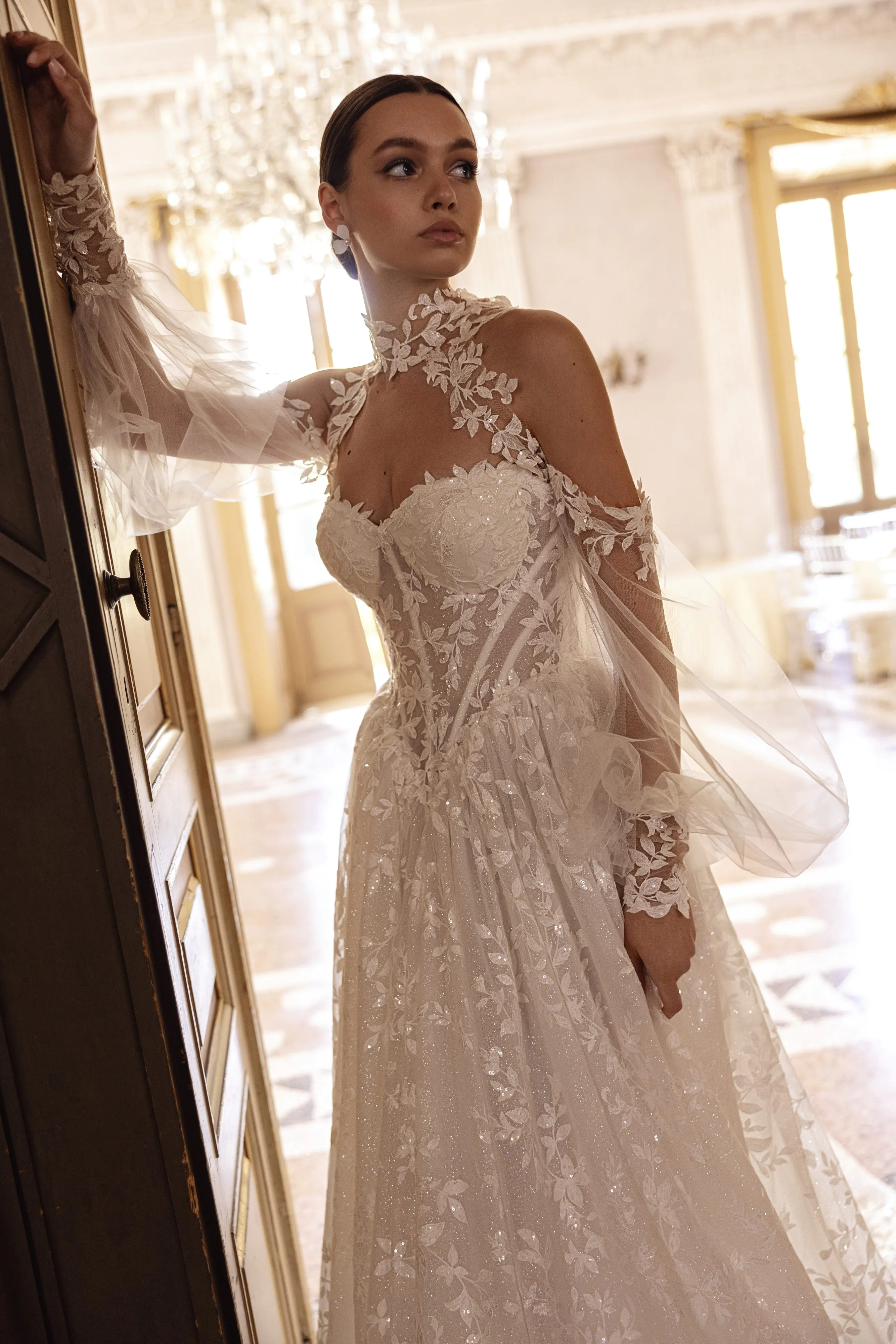 This enchanting princess silhouette gown is crafted from lace adorned with shimmering sequins and delicate leaf motifs. The semi-sheer corset features structured boning and a flattering V-shaped waistline that enhances the feminine form. The look is completed with a removable lace bolero that gracefully drapes off the shoulders and flows into voluminous tulle sleeves, gathered at the wrists for a romantic touch.
