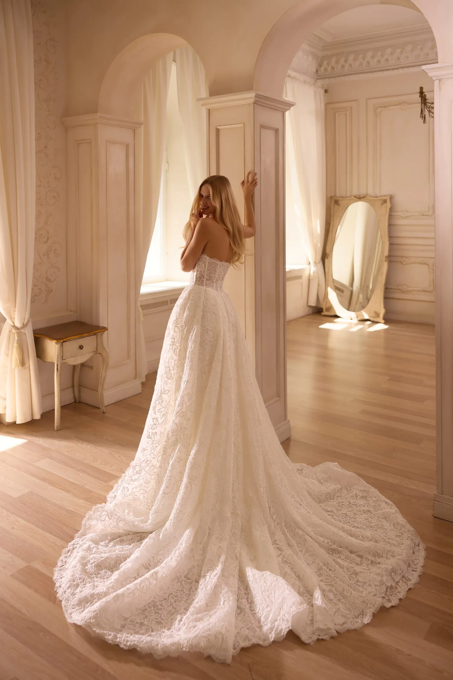 A breathtaking princess gown crafted from exquisite corded lace, this masterpiece features a semi-sheer corset bodice with an asymmetric design and a straight neckline. The bodice is delicately adorned along the bust with cascading bead embellishments, adding a touch of ethereal sparkle. Romantic and refined, this dress perfectly blends modern sensuality with timeless elegance.