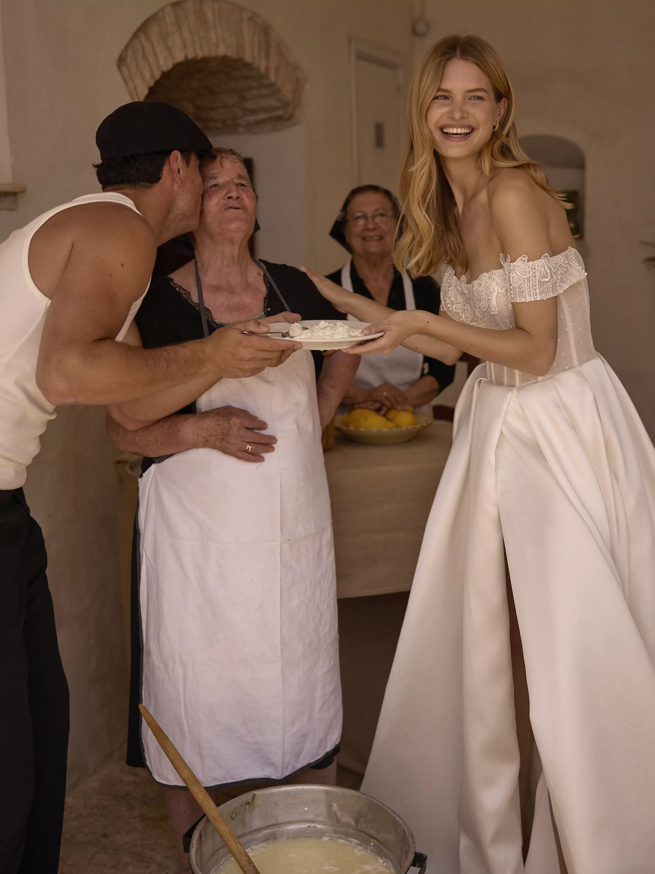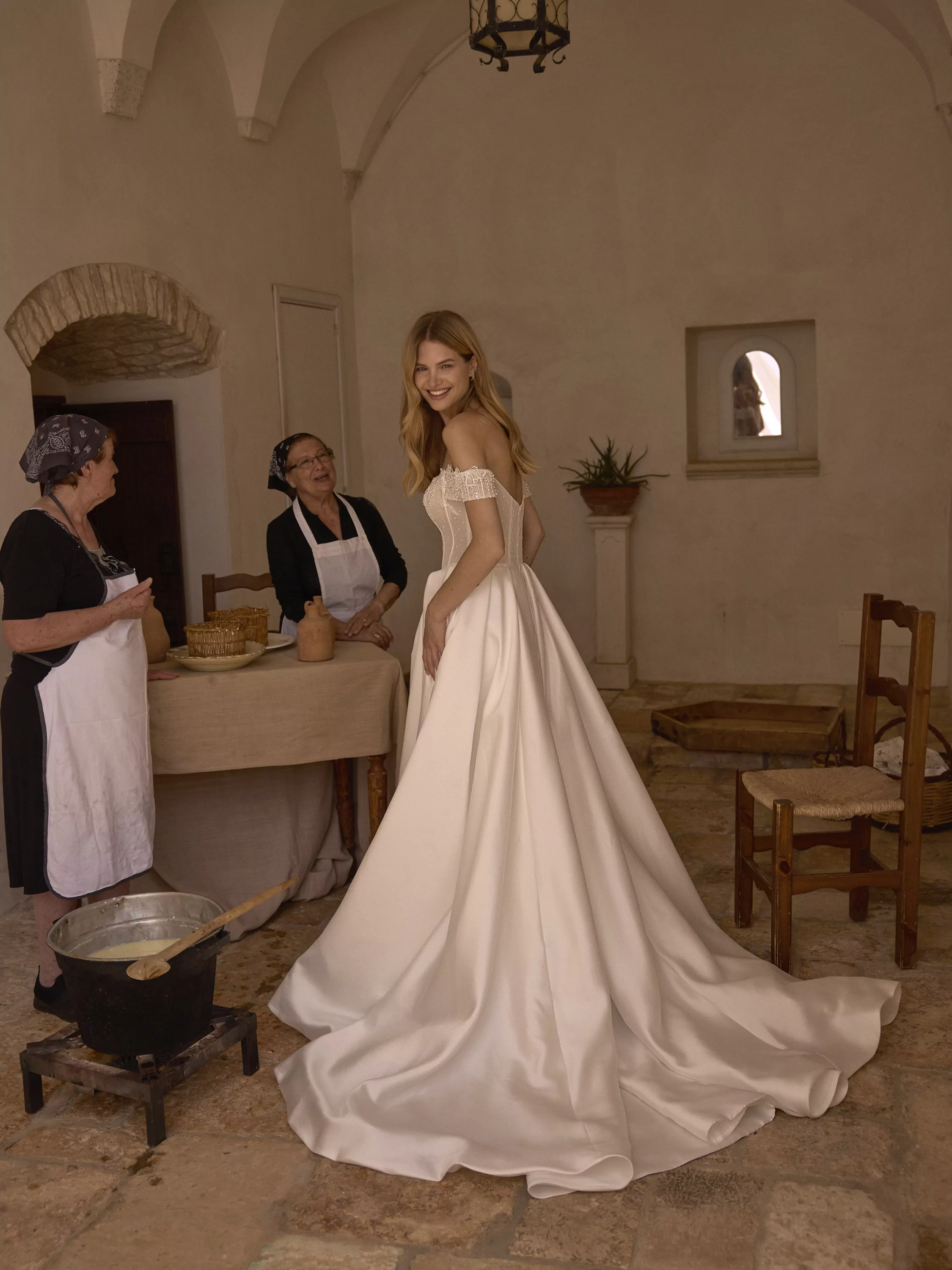 This stunning A-line dress with a satin skirt with elegant pleats and a daring slit creates the perfect balance of sophistication and appeal. The bodice is made of sparkling mesh, giving a subtle glow, and is embellished with intricate embroidered lace, emphasizing the sophisticated elegance of the dress. Wide straps descend from the shoulders and are embroidered with the same lace