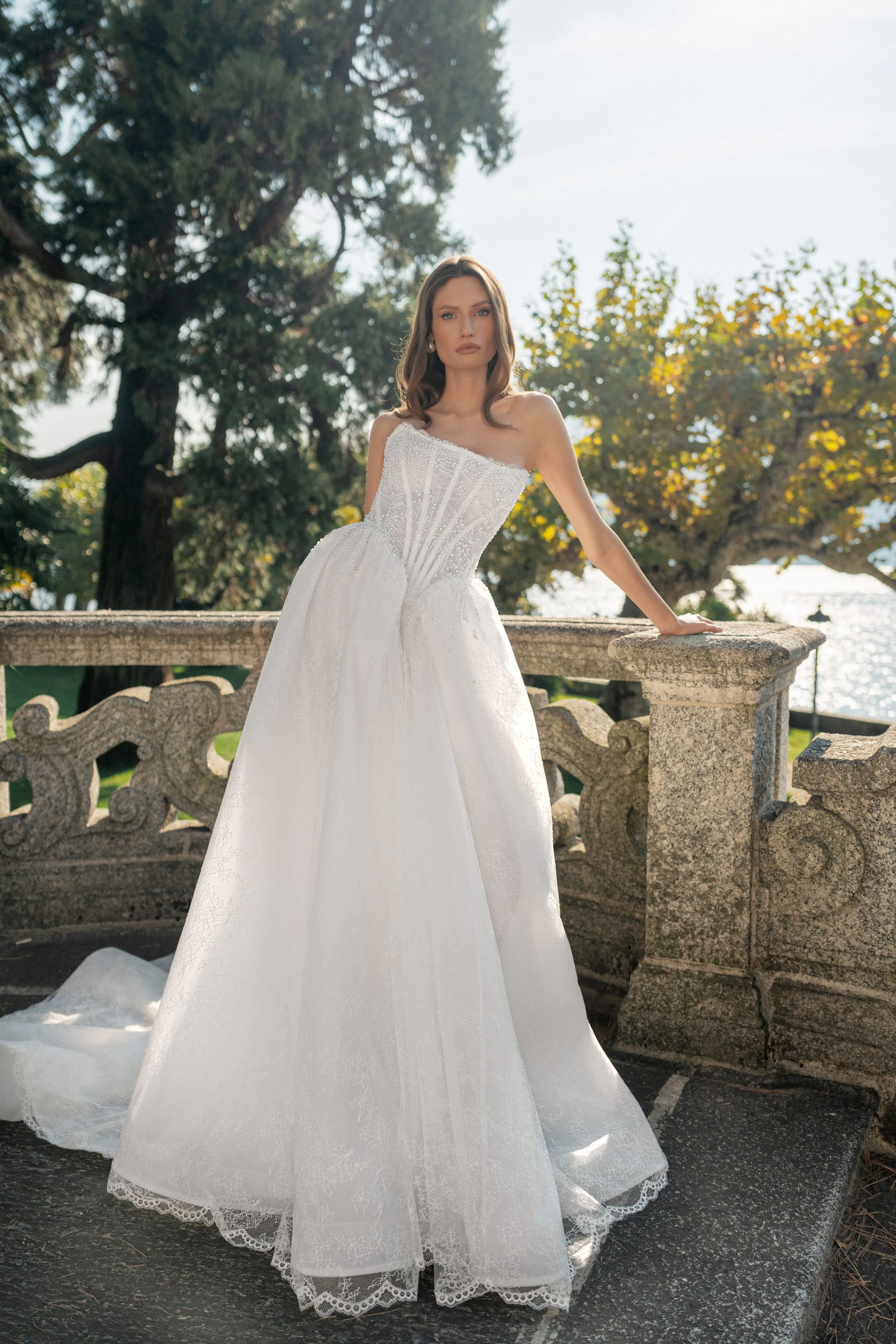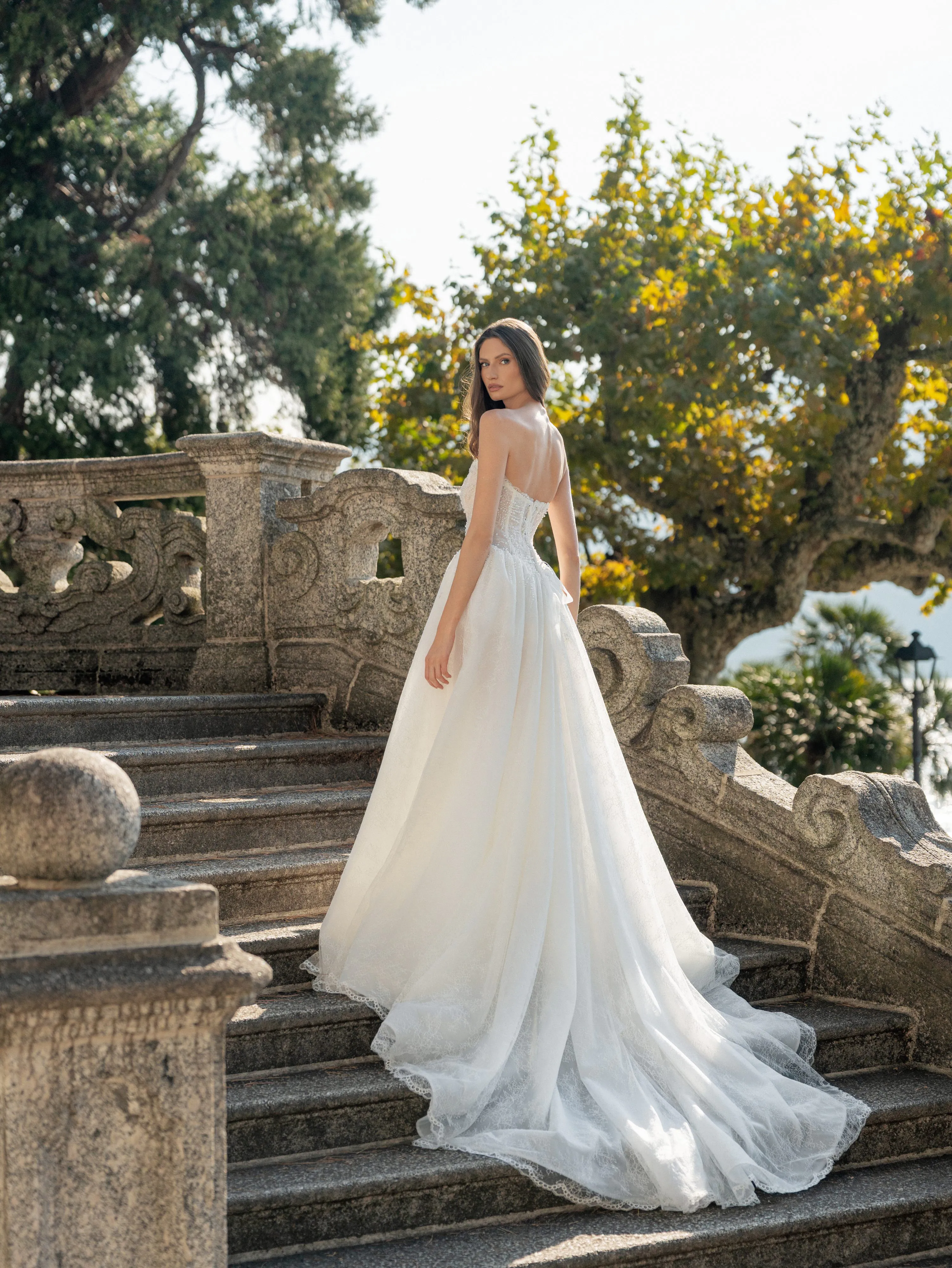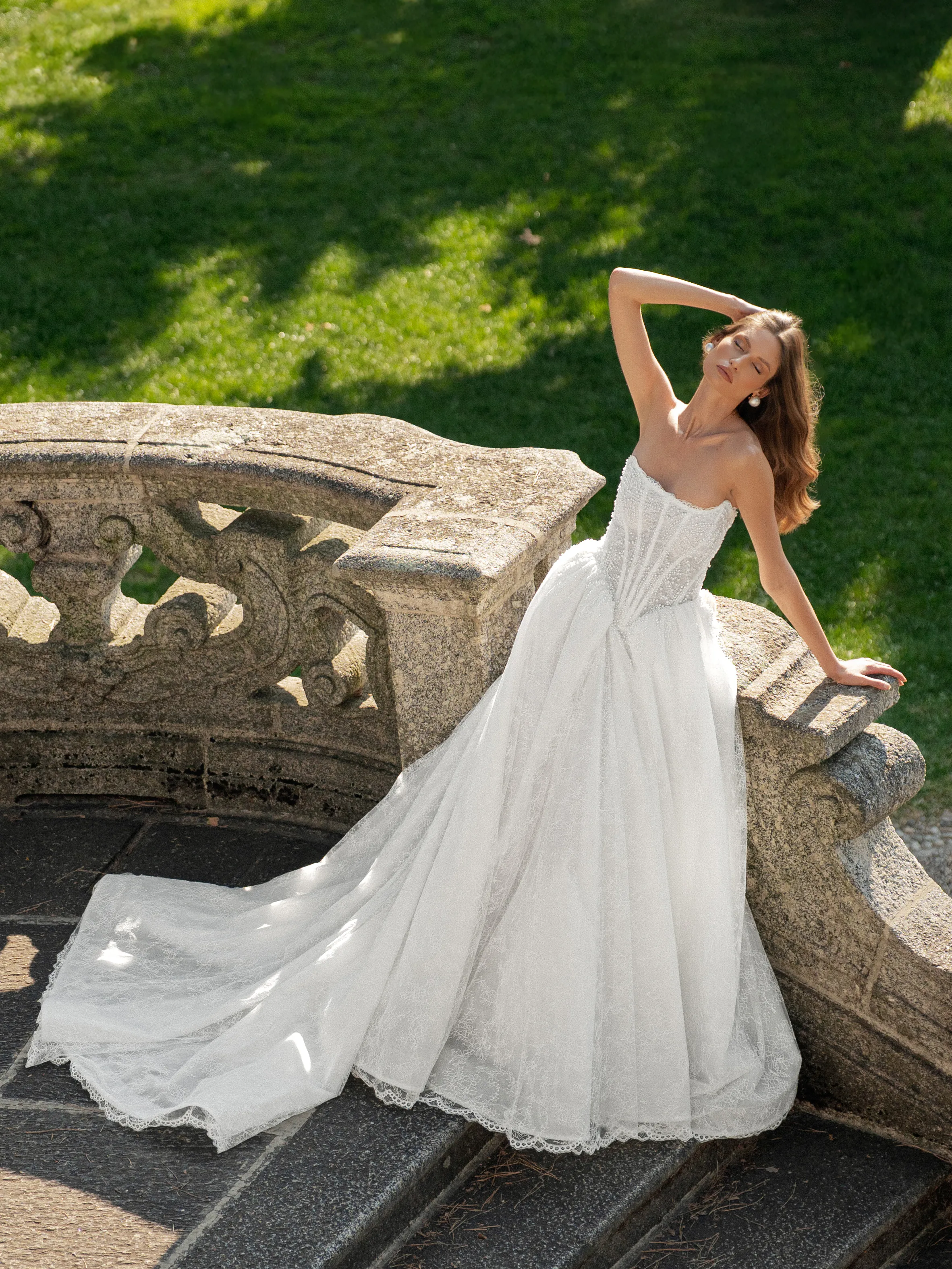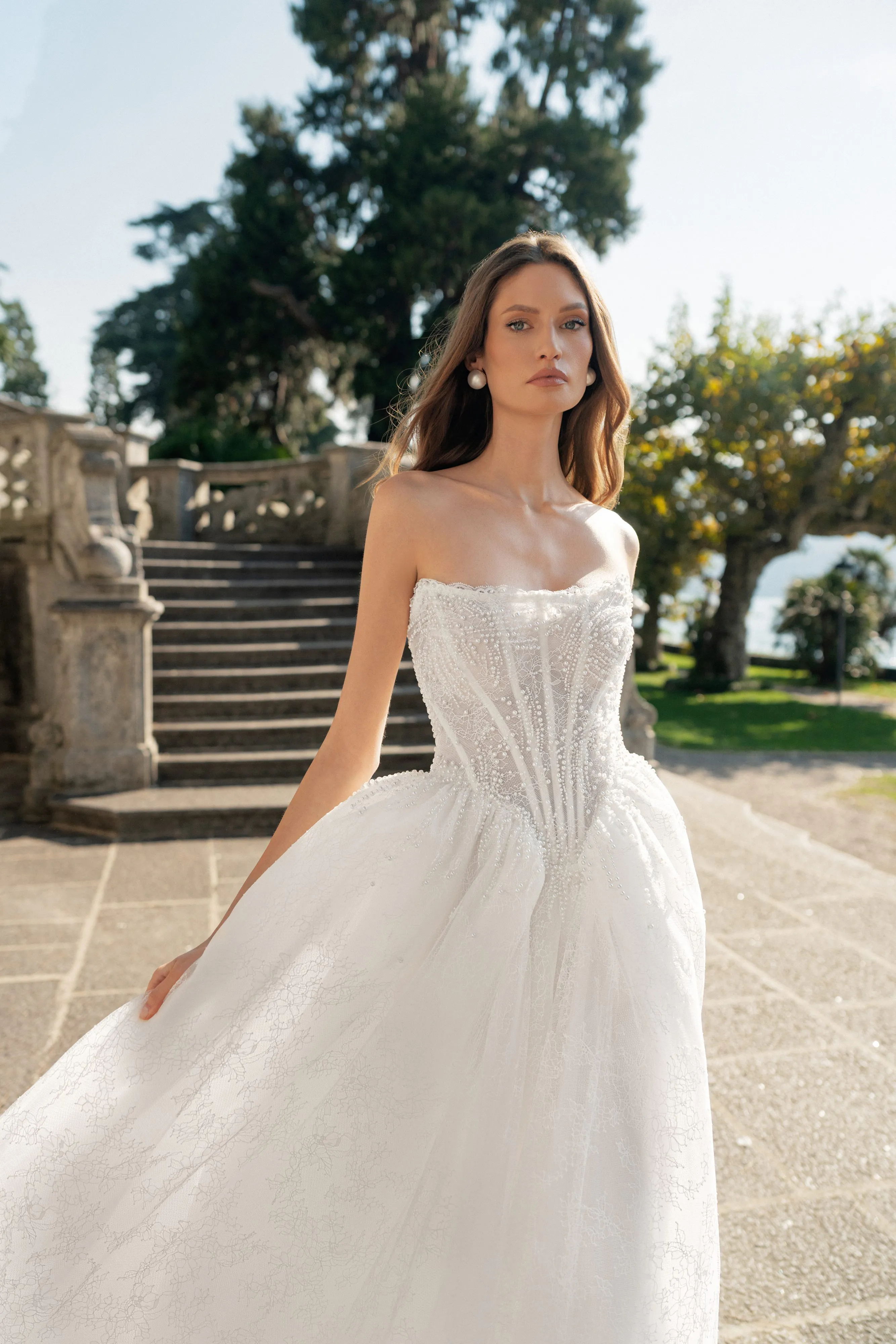 A romantic princess gown crafted from delicate Chantilly lace, featuring a V-shaped elongated corset that is semi-sheer with accentuated boning on the bodice. The corset is exquisitely decorated with pearls, adding a touch of timeless elegance and refinement to the silhouette.