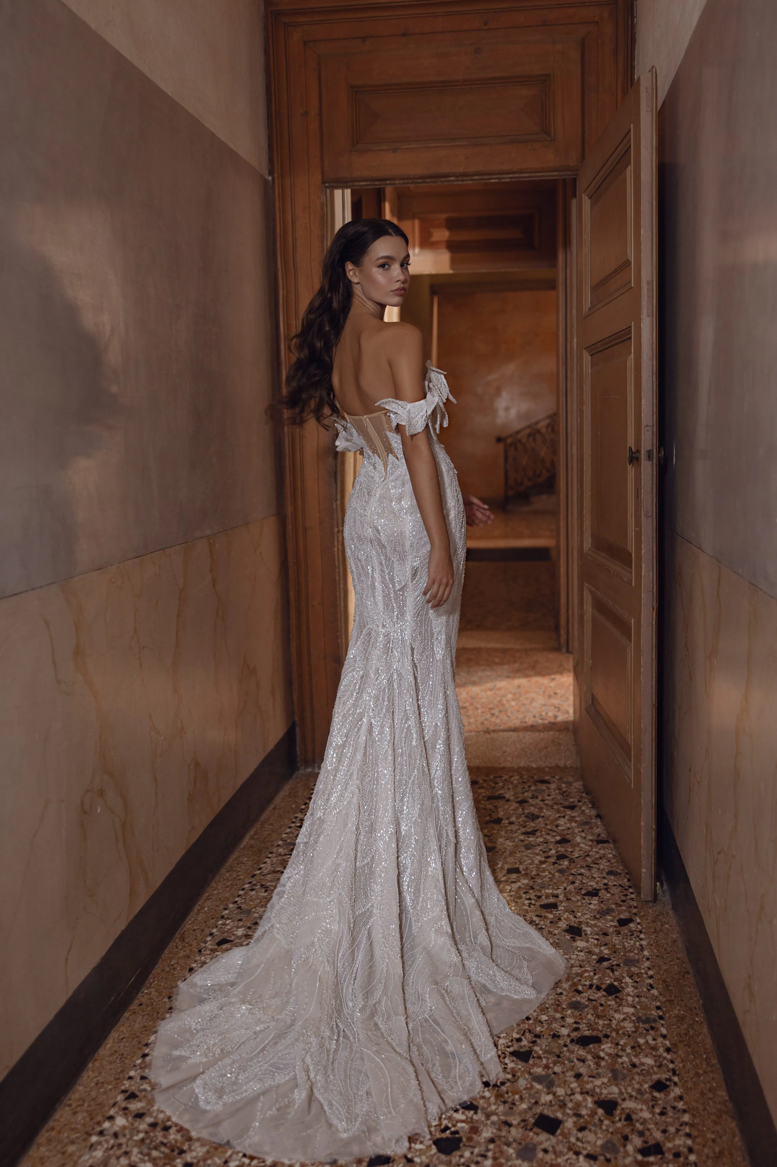 This stunning mermaid gown features a daring high slit and is crafted from beaded lace in the shape of delicate petals. The dress is beautifully complemented by detachable straps that gently fall off the shoulders, designed to resemble petals for an added touch of elegance. The back is made of sheer mesh, intricately embroidered with beads, and is finished with a zipper closure.