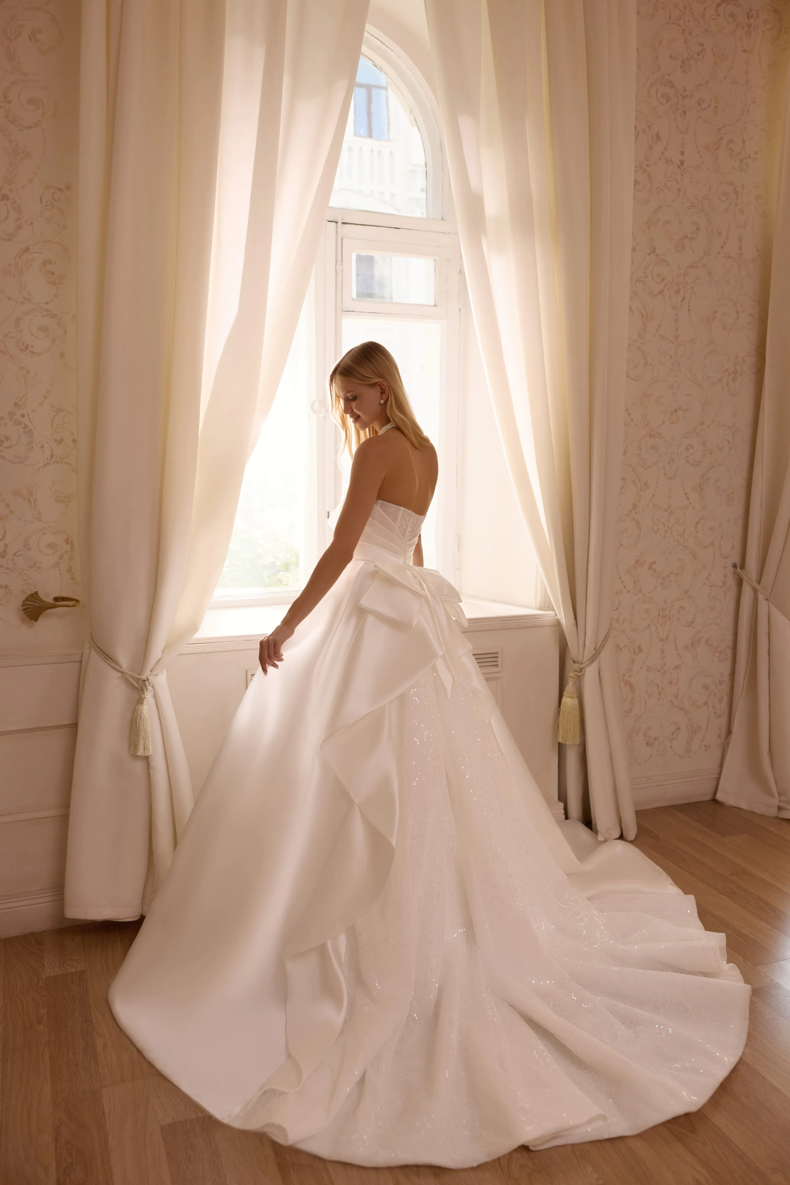 This princess gown is crafted from rich satin and features a romantic sweetheart neckline. Soft draping along the bodice and waistline beautifully sculpts the silhouette, while delicate, shimmering lace peeks through beneath the drapery—adding a touch of femininity and sparkle. At the back, an elegant lace insert cascades into the train, offering a graceful contrast to the smooth satin. A statement satin bow completes the look, creating a sense of refined drama from every angle.