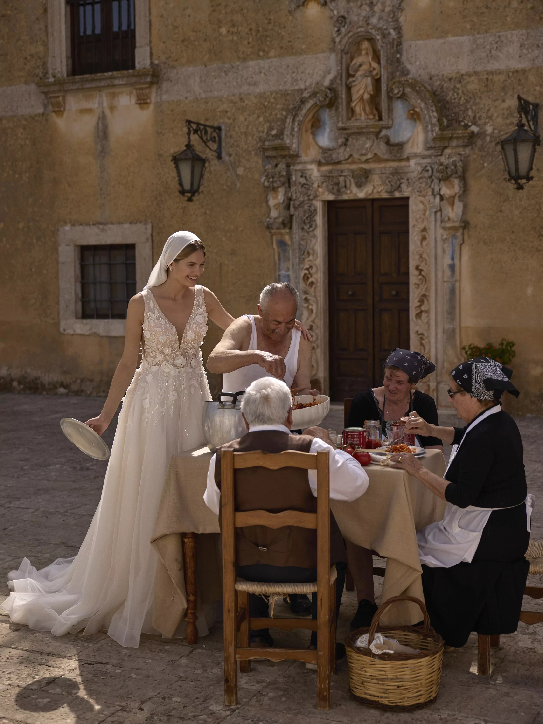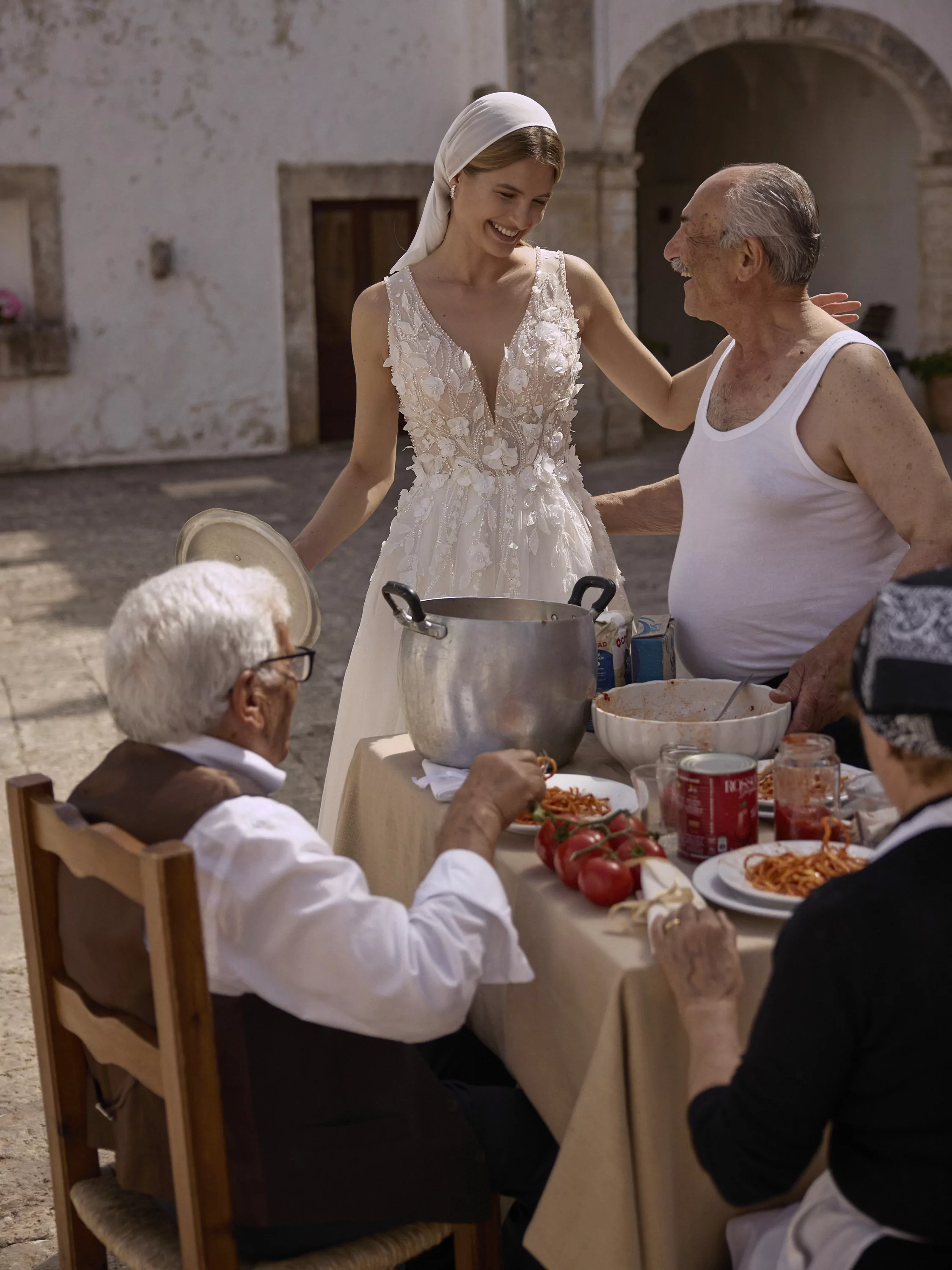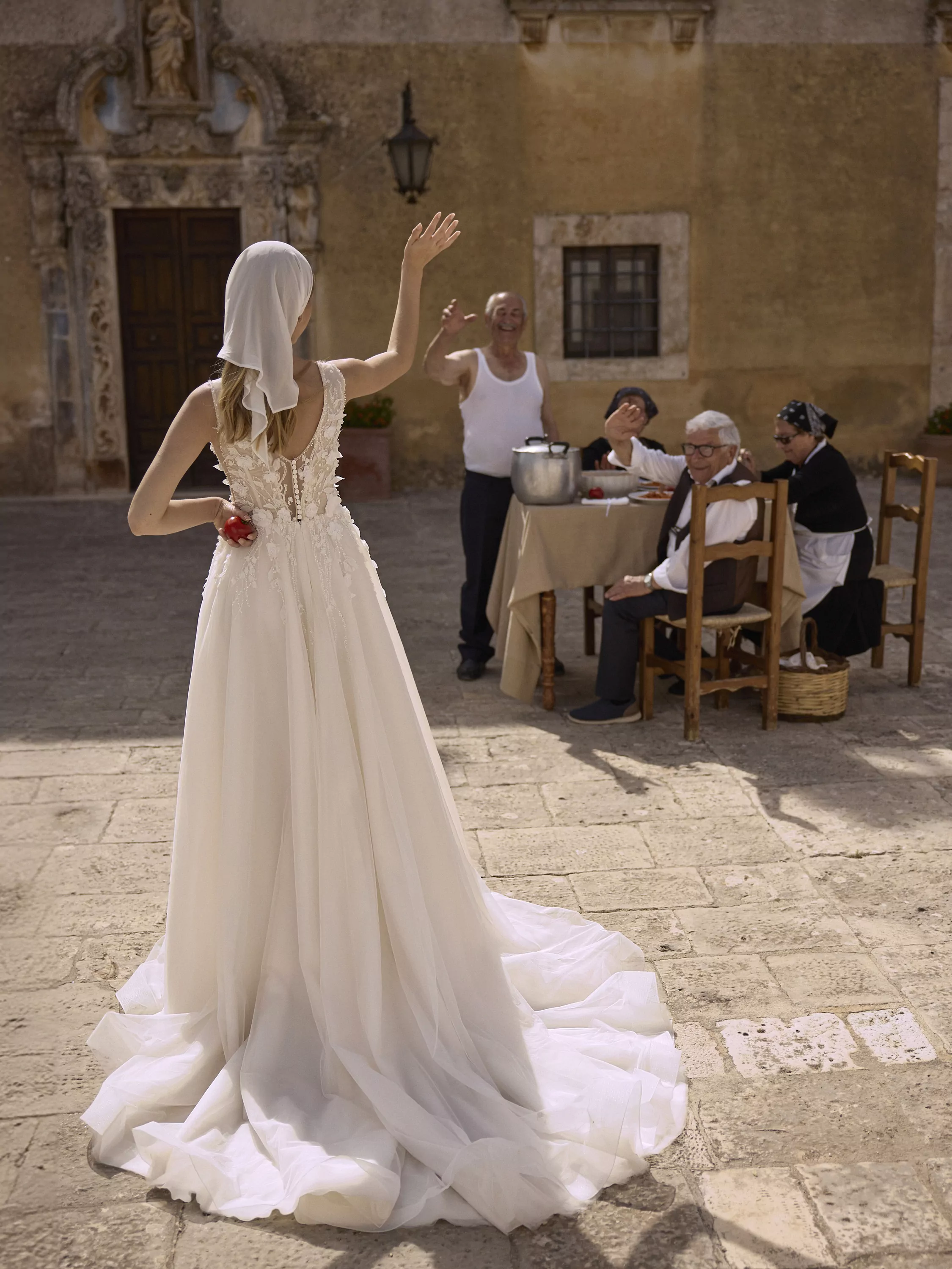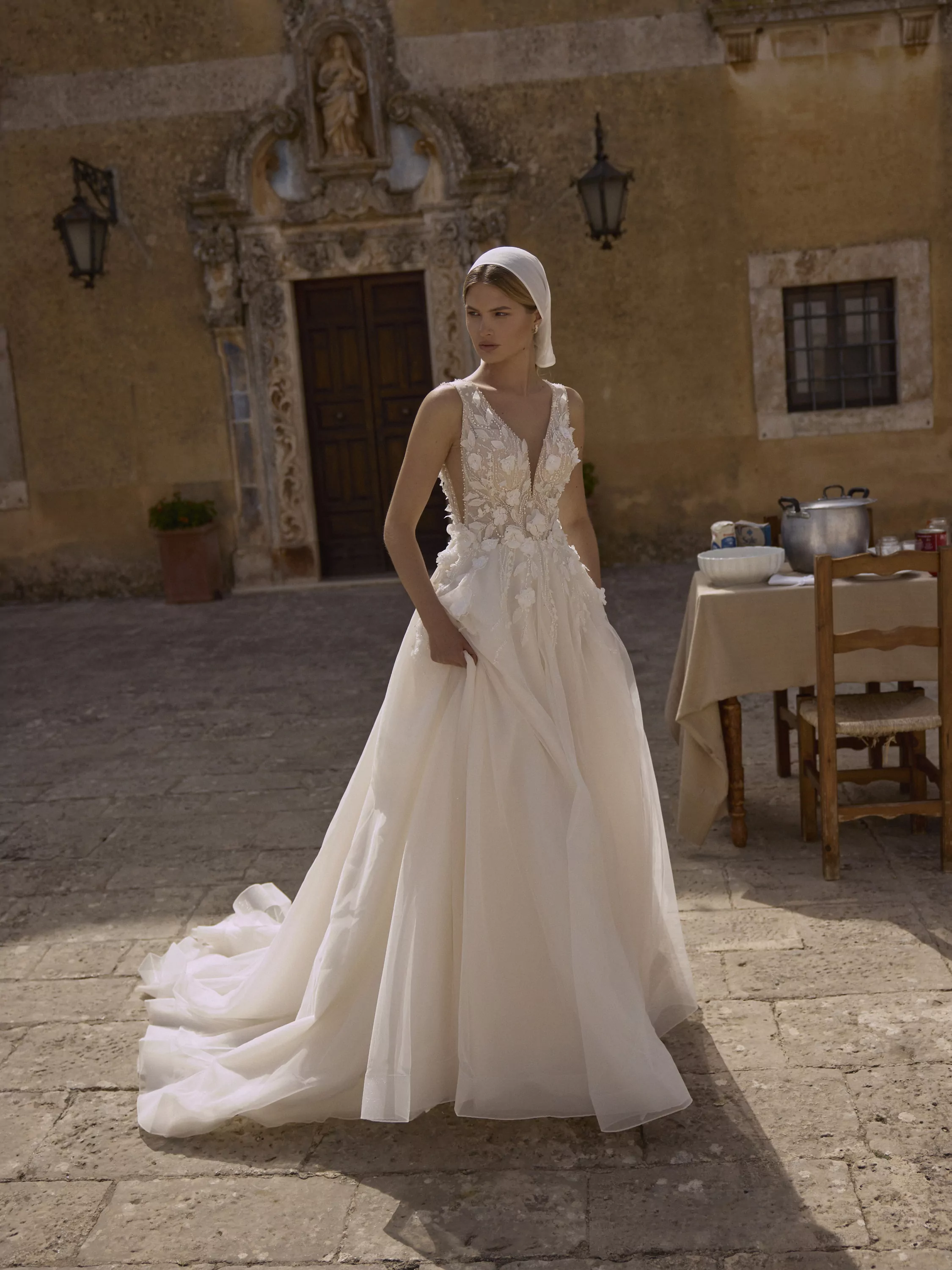 The dress features an A-line silhouette made from milk-colored mesh, with a V-shaped neckline and cutouts on the sides. The soft corset is adorned with embroidery lace with beads and 3D floral appliqués. The back is finished with a row of buttons, adding a refined touch to the design.