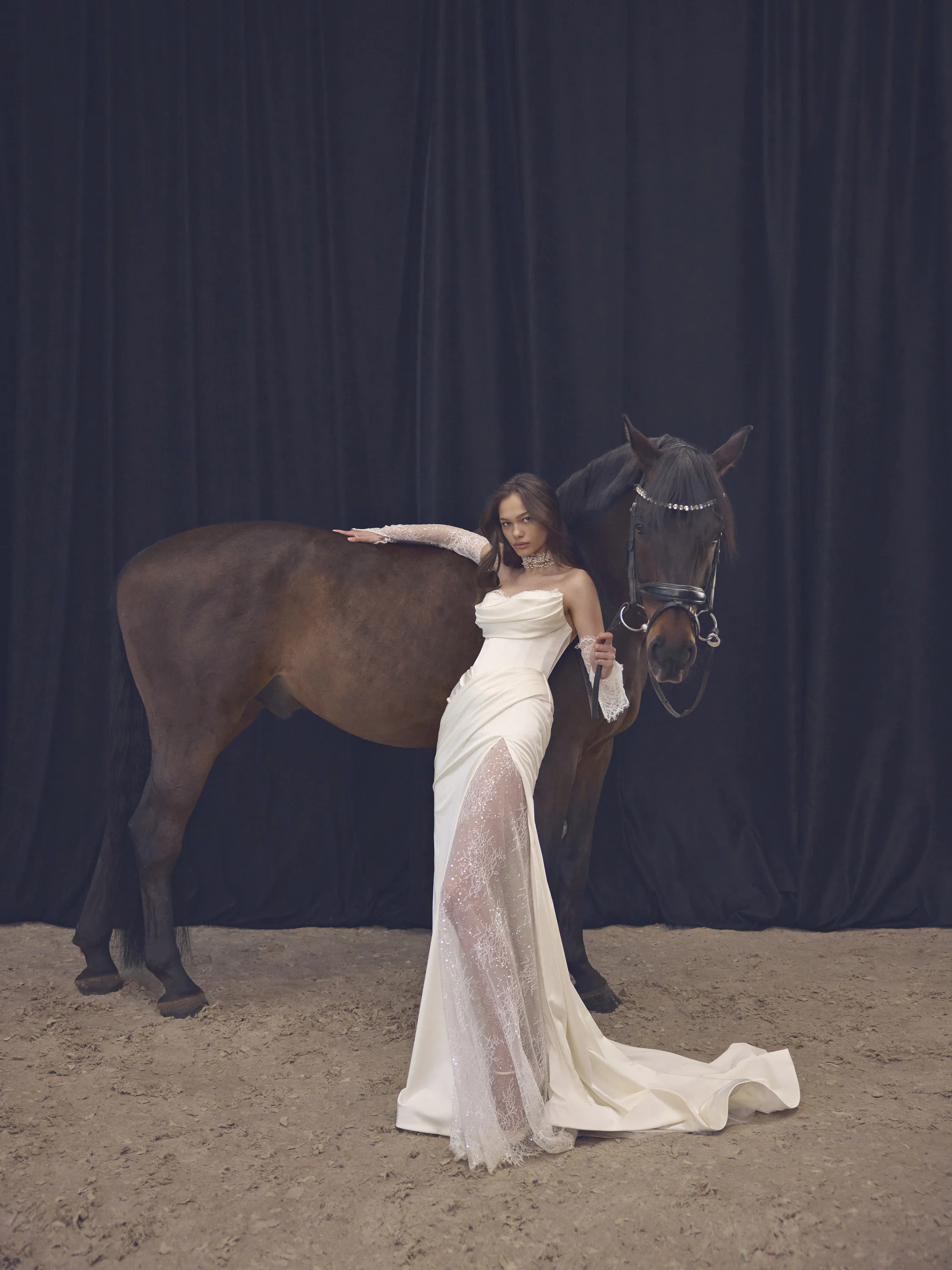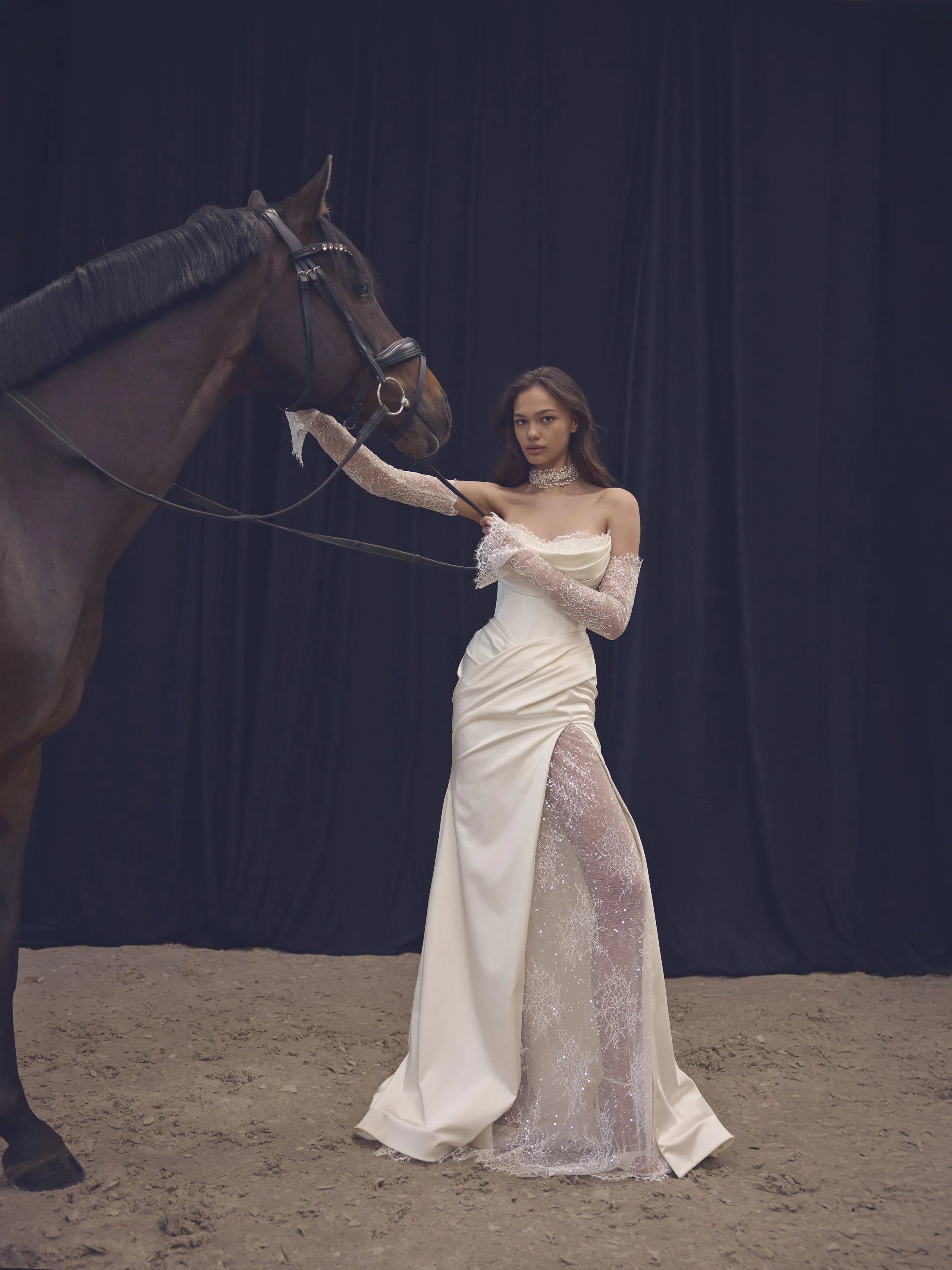 Elegant and figure-hugging, this mermaid gown is crafted from stretch satin and features a structured corset bodice with soft draping across the bust and an asymmetrical draped detail at the hips. A high slit reveals delicate lace with subtle sequin accents for a hint of sparkle. The back is finished with a lace-up closure for a perfect fit. Complete with removable lace sleeves, this gown effortlessly combines sophistication and versatility.