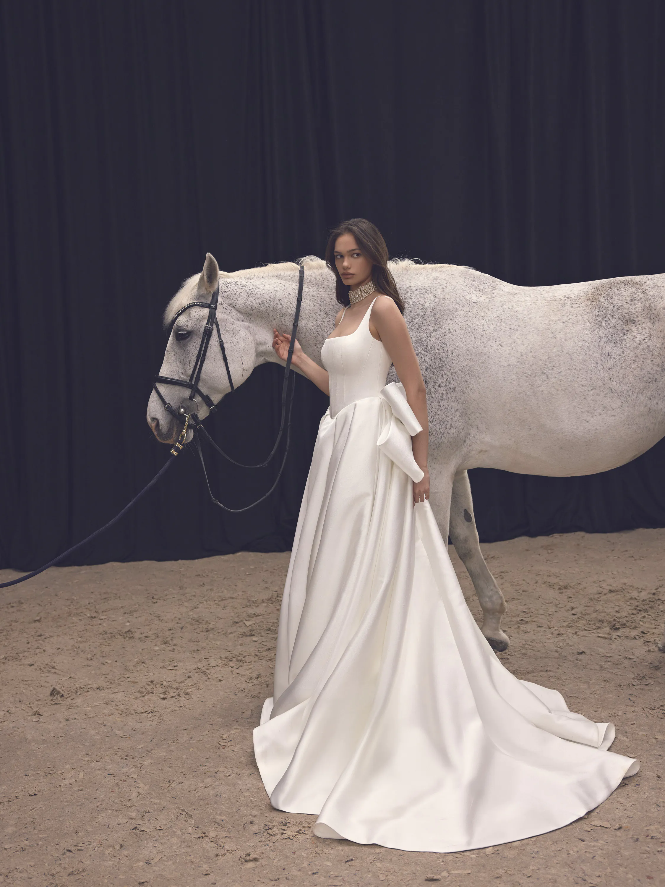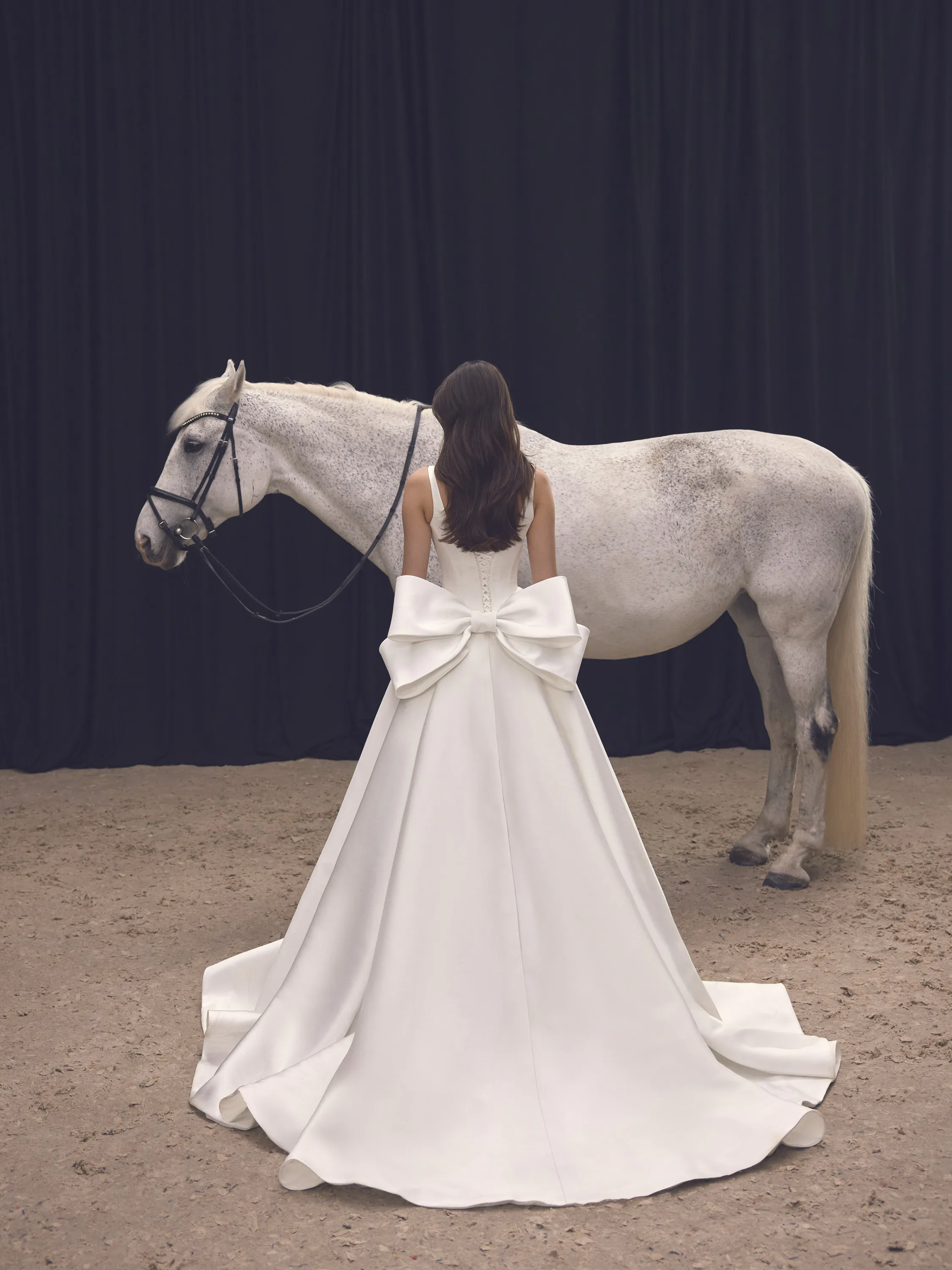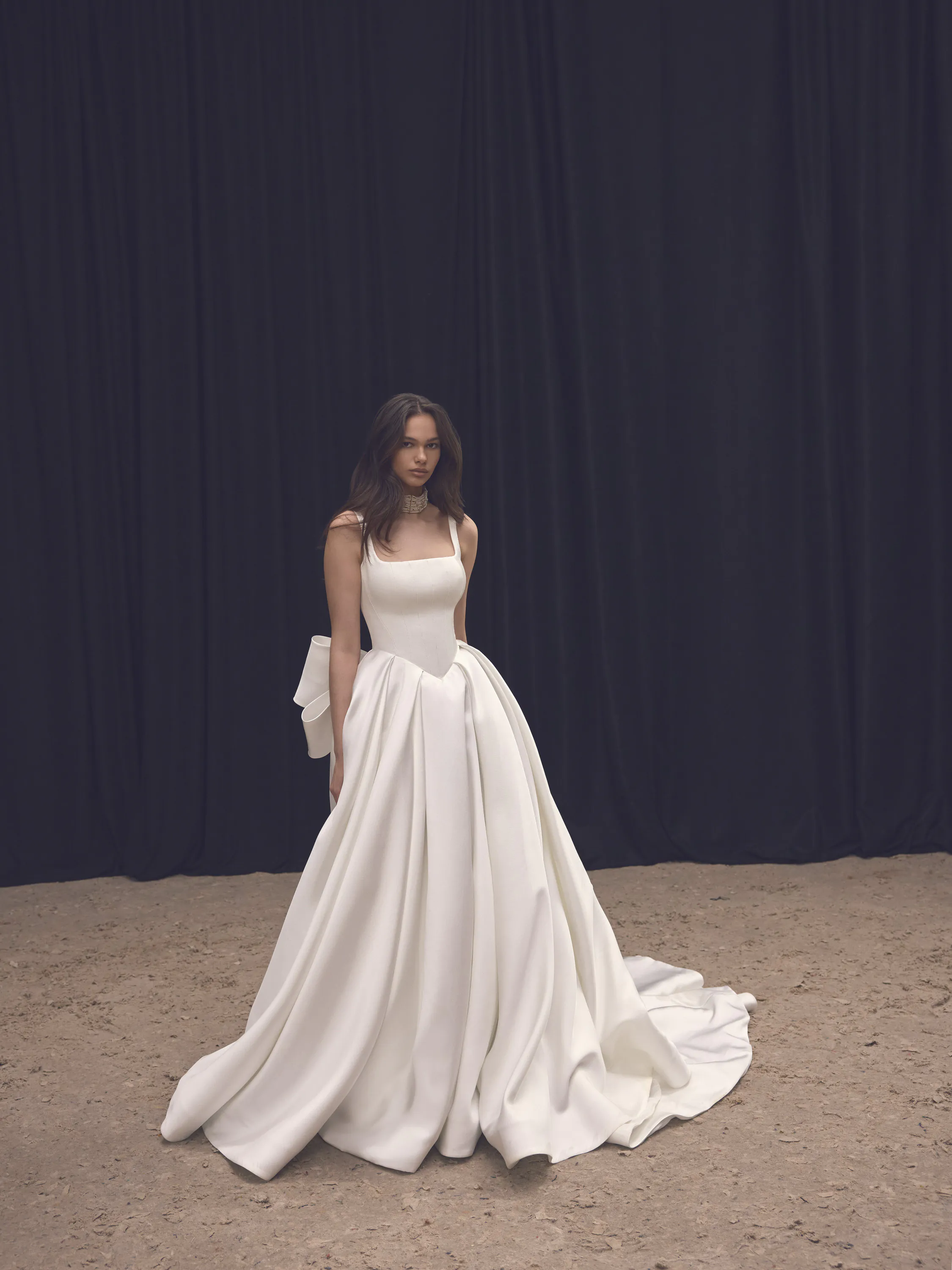 This enchanting princess-style gown, crafted from luxurious milk Mikado satin, features a square neckline and structured corset with V-line that accentuates the waist. The voluminous skirt, created with soft gathers, adds a fairy-tale quality to the silhouette. At the back, an elegant lace-up closure enhances the fit and adds a touch of romance. Completing the look is a detachable oversized bow that cascades into a sweeping train