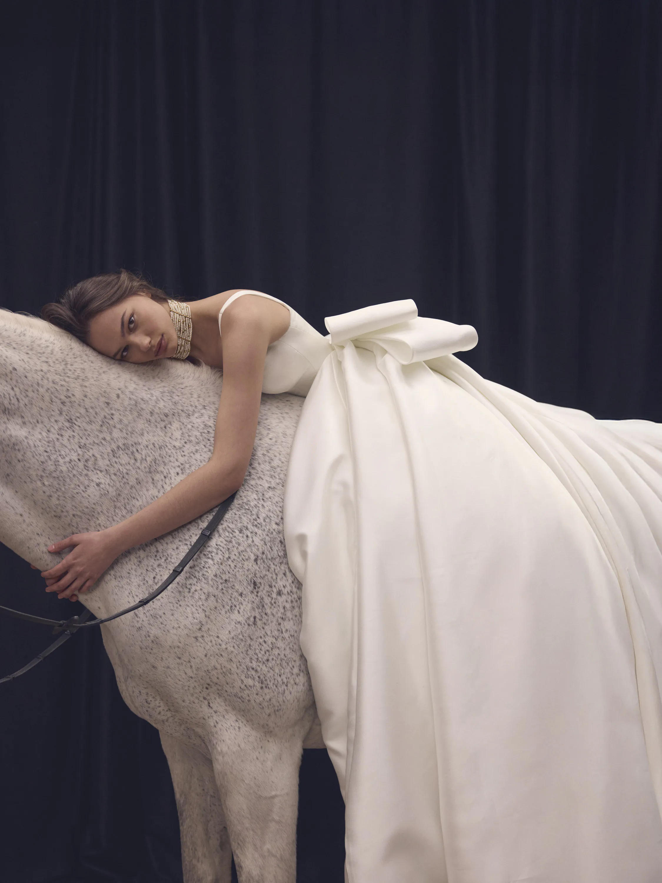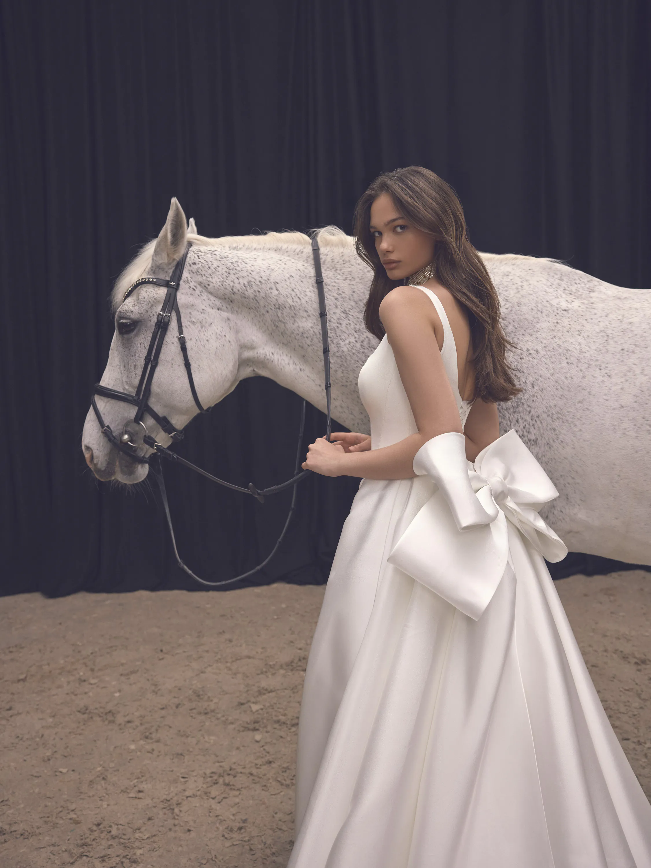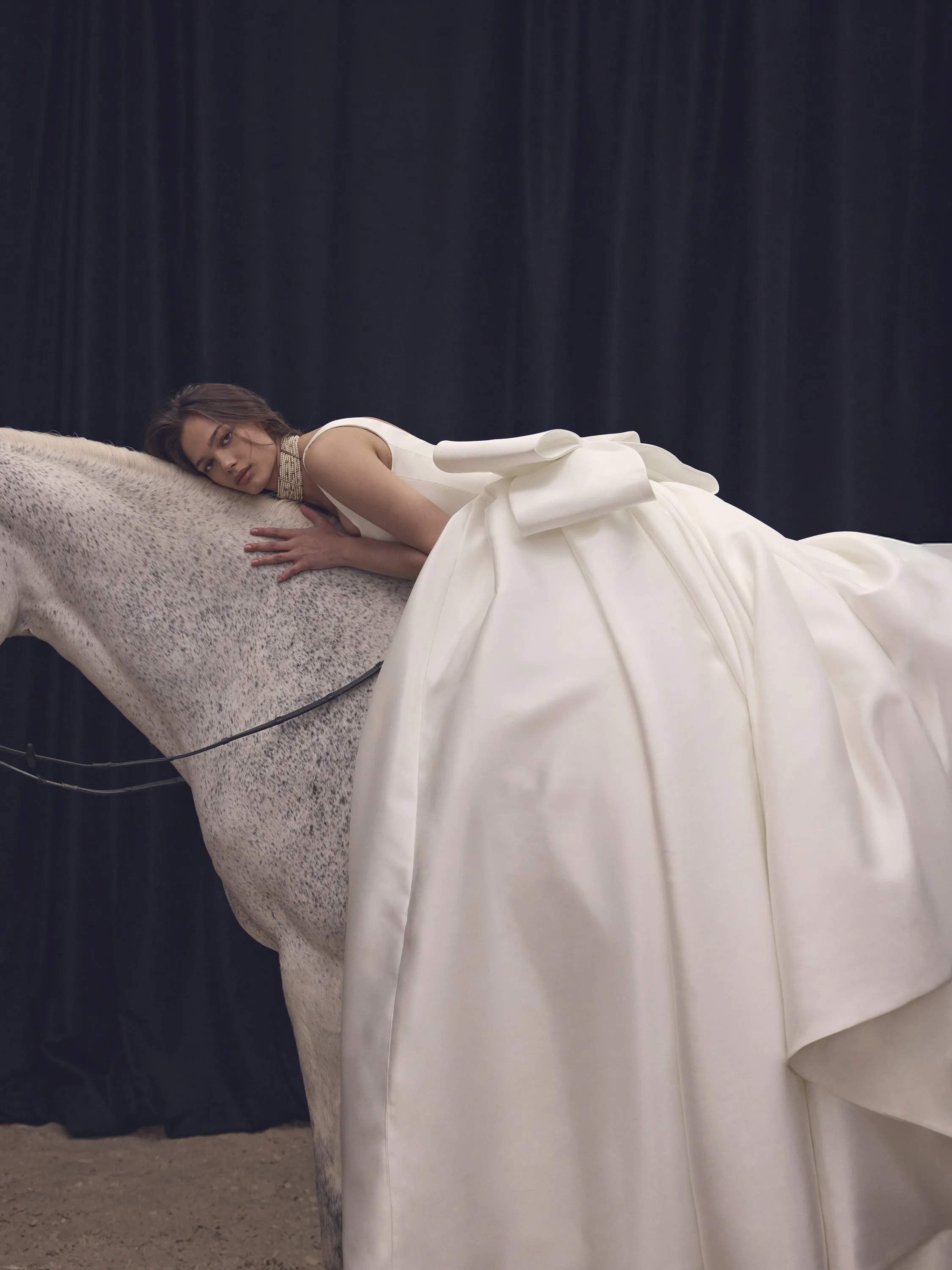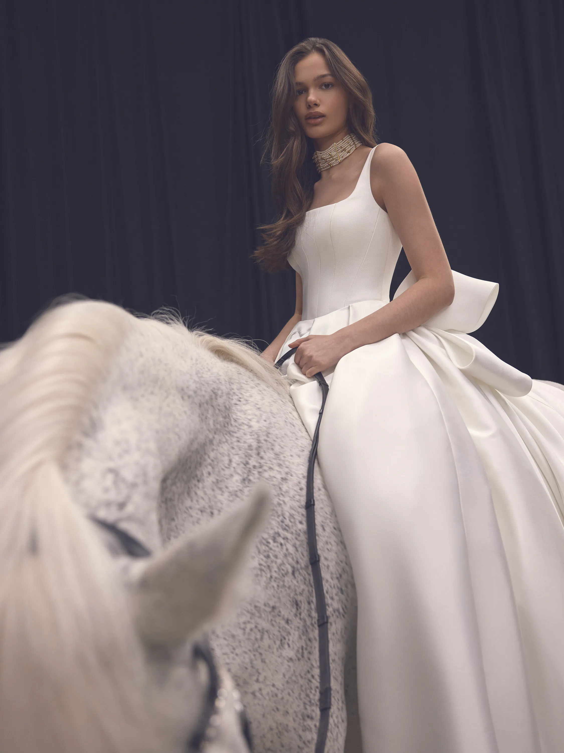 This enchanting princess-style gown, crafted from luxurious milk Mikado satin, features a square neckline and structured corset with V-line that accentuates the waist. The voluminous skirt, created with soft gathers, adds a fairy-tale quality to the silhouette. At the back, an elegant lace-up closure enhances the fit and adds a touch of romance. Completing the look is a detachable oversized bow that cascades into a sweeping train