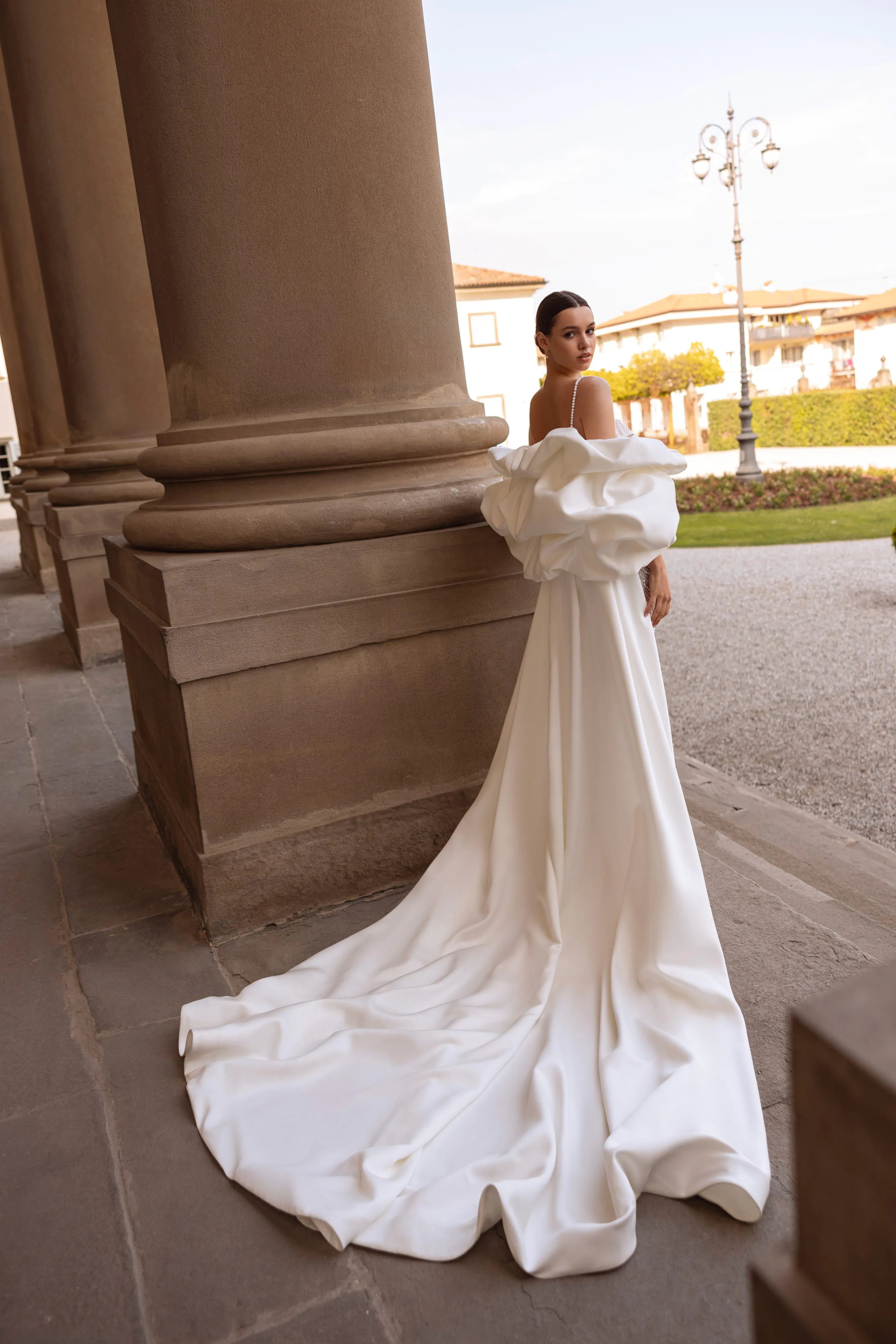 This refined fit-and-flare silhouette gown is crafted from exquisite lace, richly embroidered with delicate pearl motifs. Thin straps add a touch of subtle elegance, letting the detailed lacework take center stage. Layered over the dress is a voluminous satin cape that rests on the forearms and drapes gracefully over them. From beneath the cape, a luxurious train cascades softly to the floor, adding a sense of grandeur and movement.
