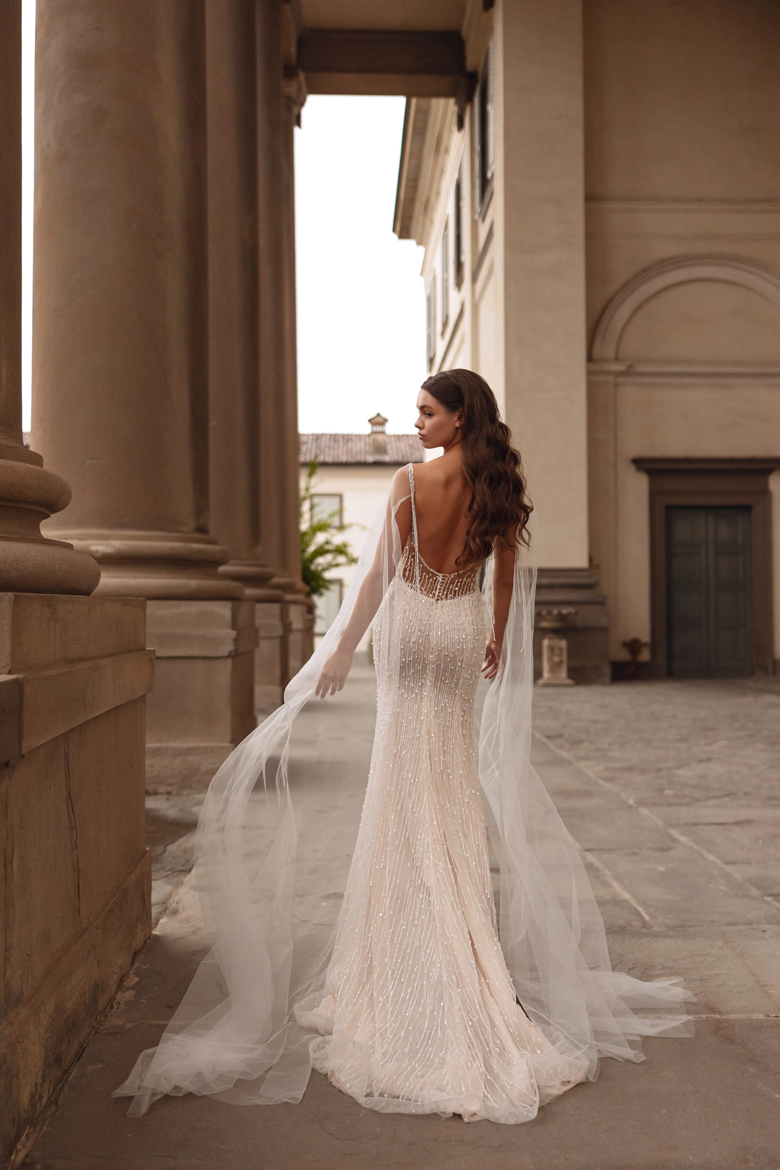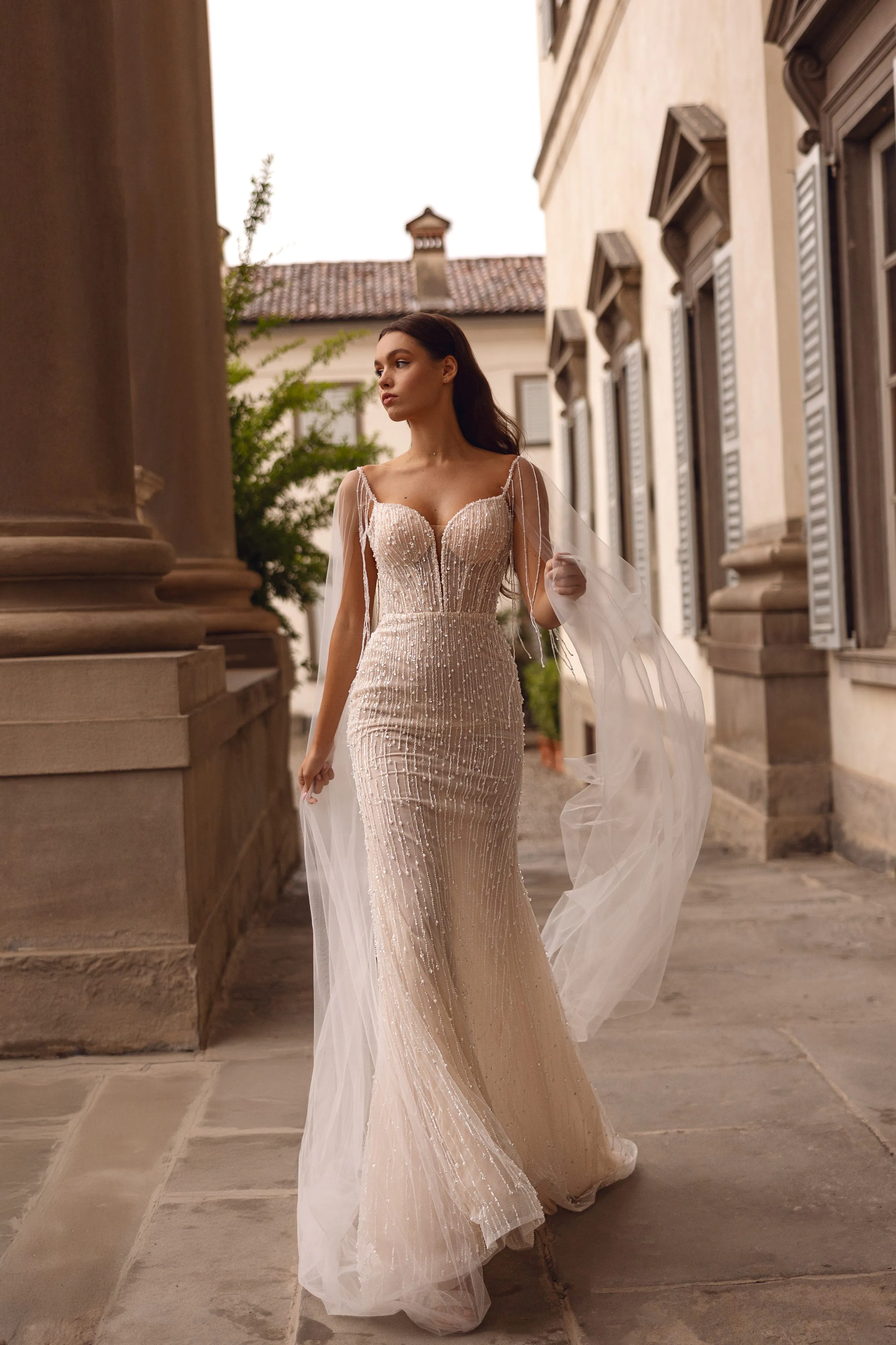 This stunning fit-and-flare gown in ivory nude features exquisite beaded lace, creating a perfect blend of elegance and allure. The dress is beautifully complemented by detachable mesh wings, adorned with delicate beaded threads for a touch of sparkle. The back of the dress is intricately embroidered with beads on sheer mesh, adding a subtle yet captivating detail.