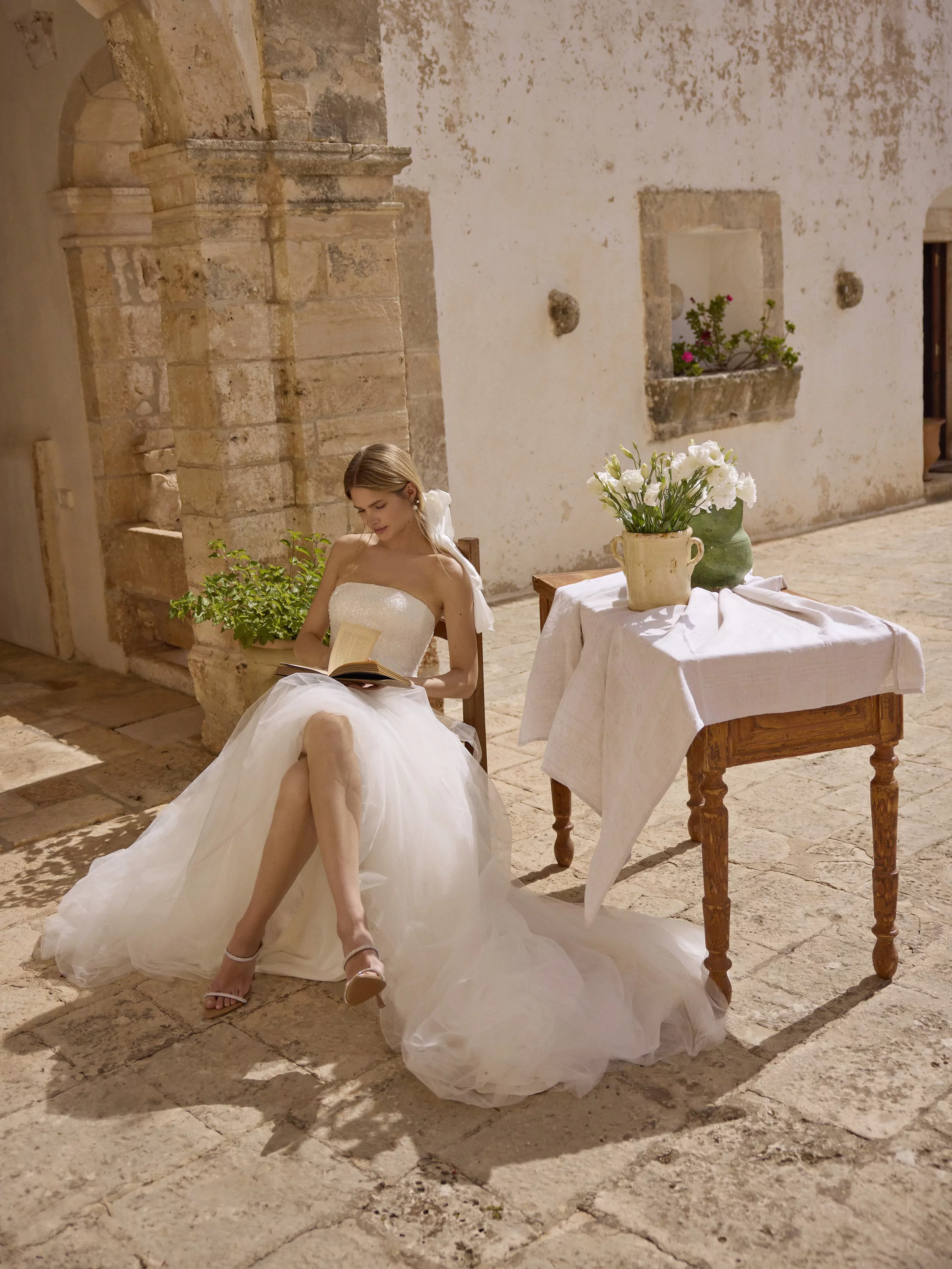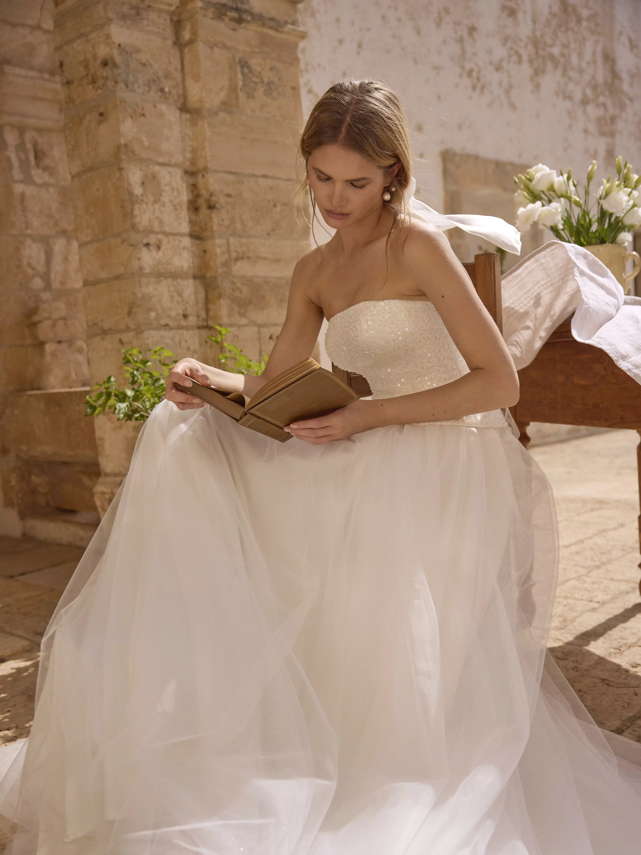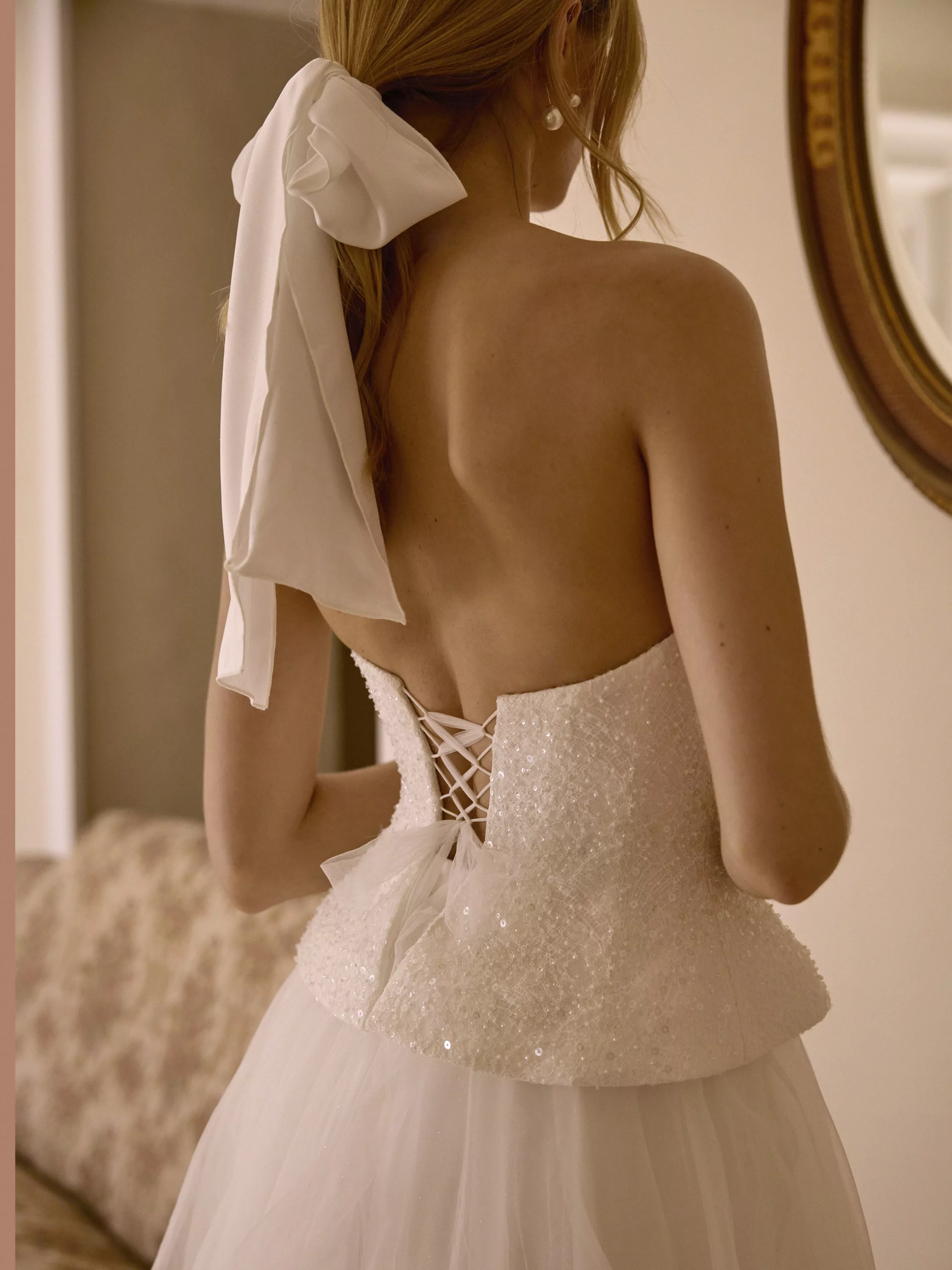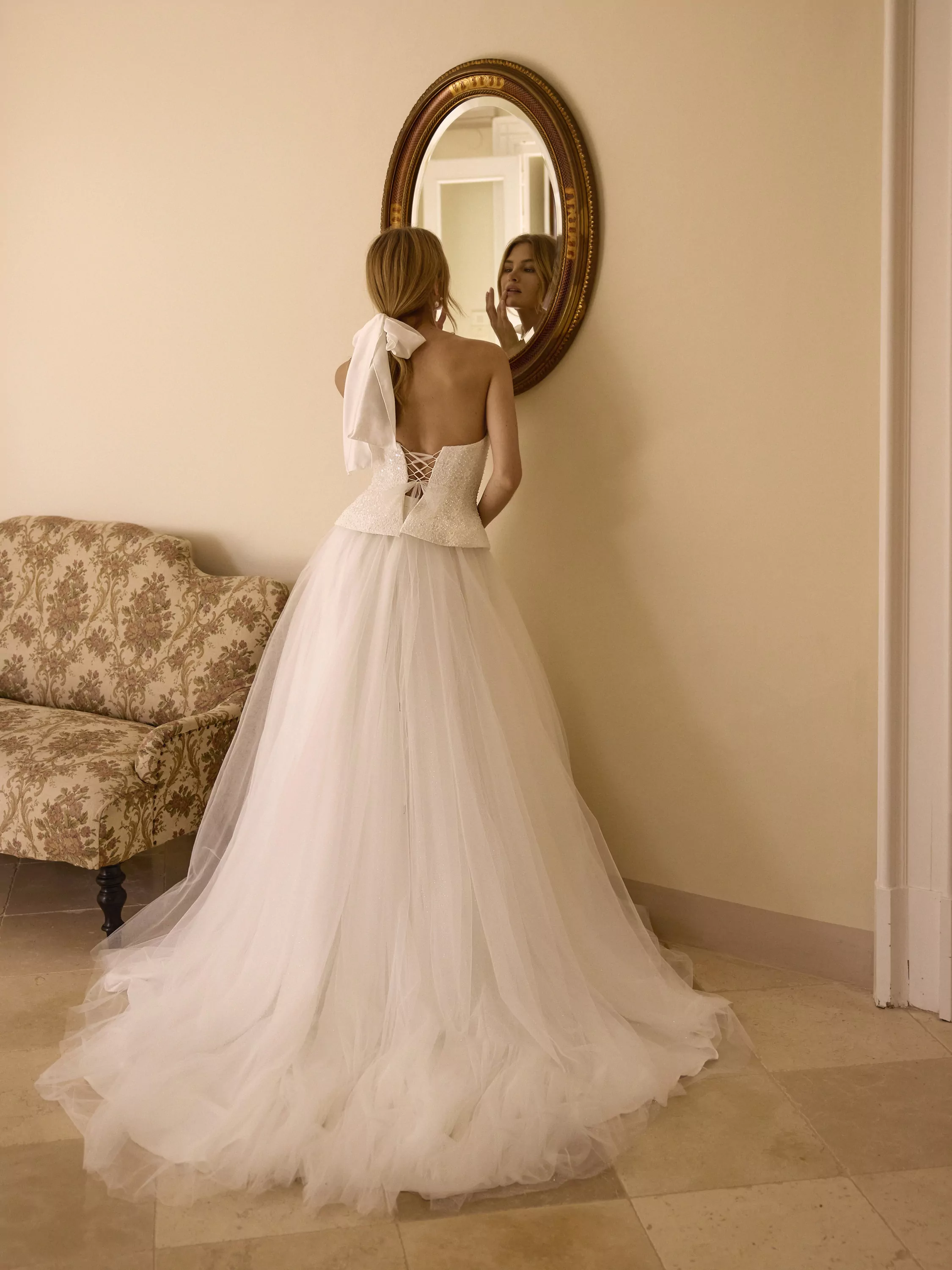 An elegant princess dress, crafted separately with a voluminous milk-colored tulle skirt and a corset with a straight neckline made from delicate lace, embroidered with sequences and beads. The corset gradually flares out towards the hips and features a lace-up detail at the back for an adjustable fit.