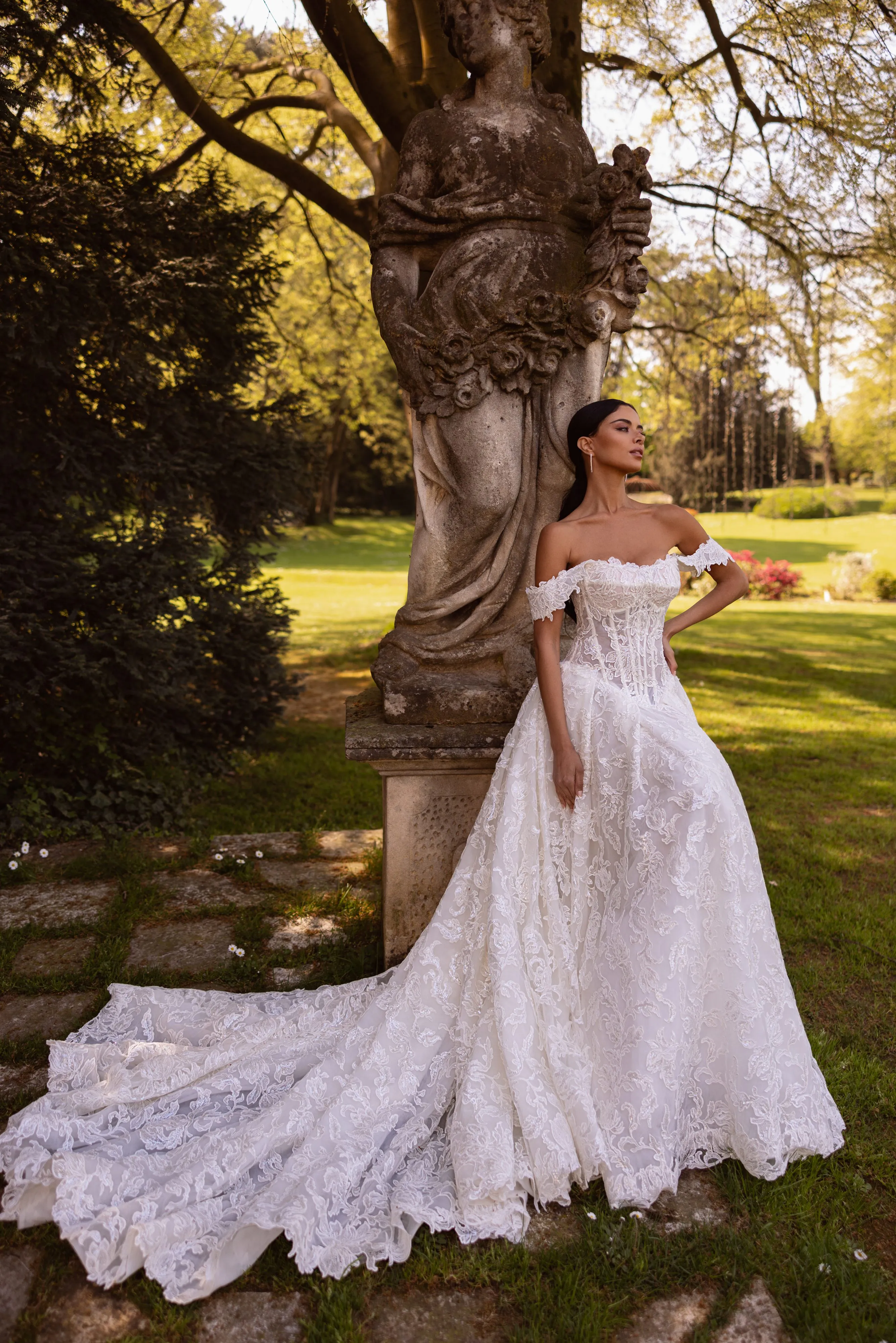This romantic A-line gown in soft ivory is crafted from delicate corded lace embellished with subtle sequins that add a gentle sparkle. The semi-sheer corset features a flattering V-shaped neckline and off-the-shoulder design that highlights the décolletage. Removable long sleeves offer styling versatility, while the lace-up back ensures a perfect fit. Finished with a flowing train, this dress is the epitome of timeless elegance.