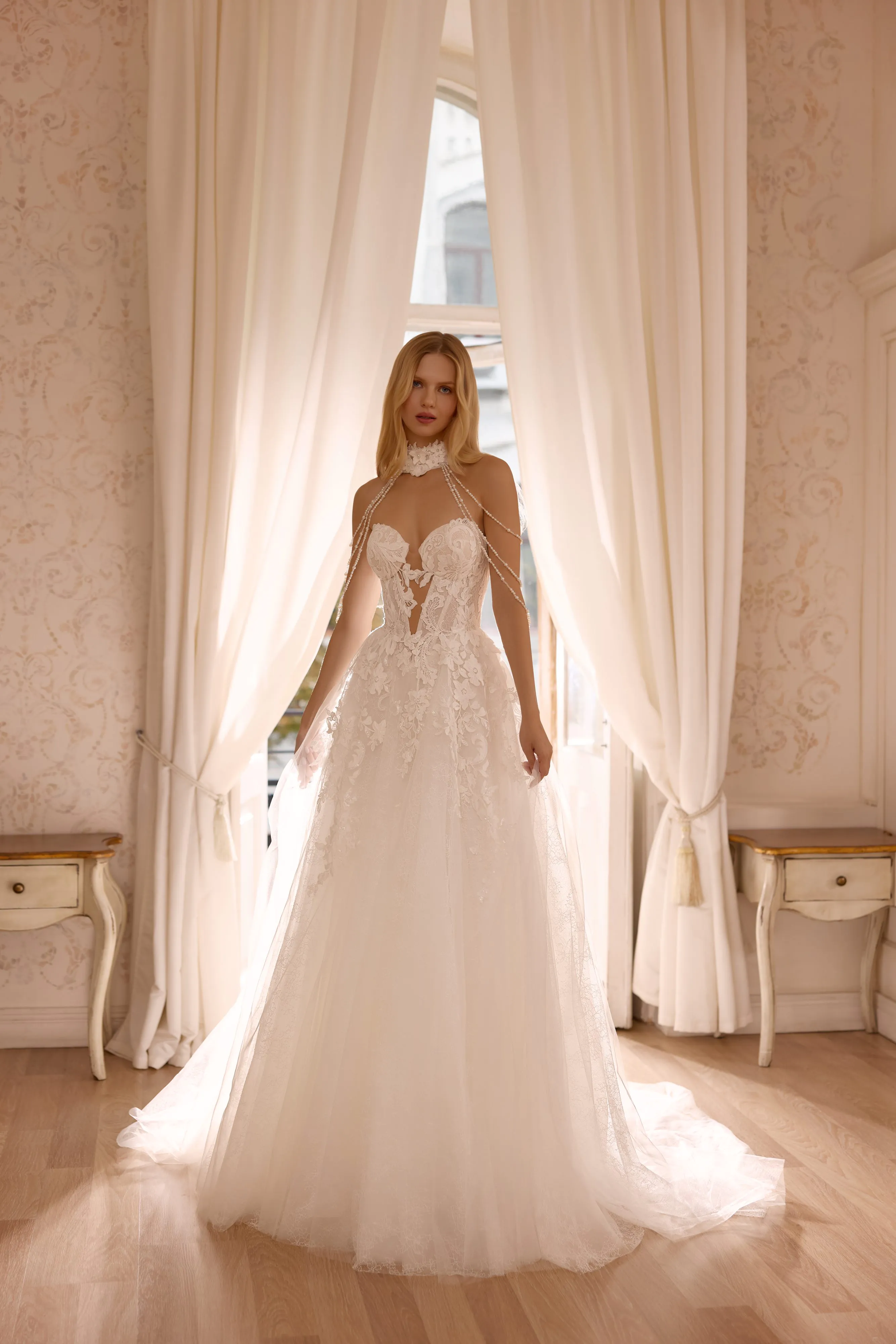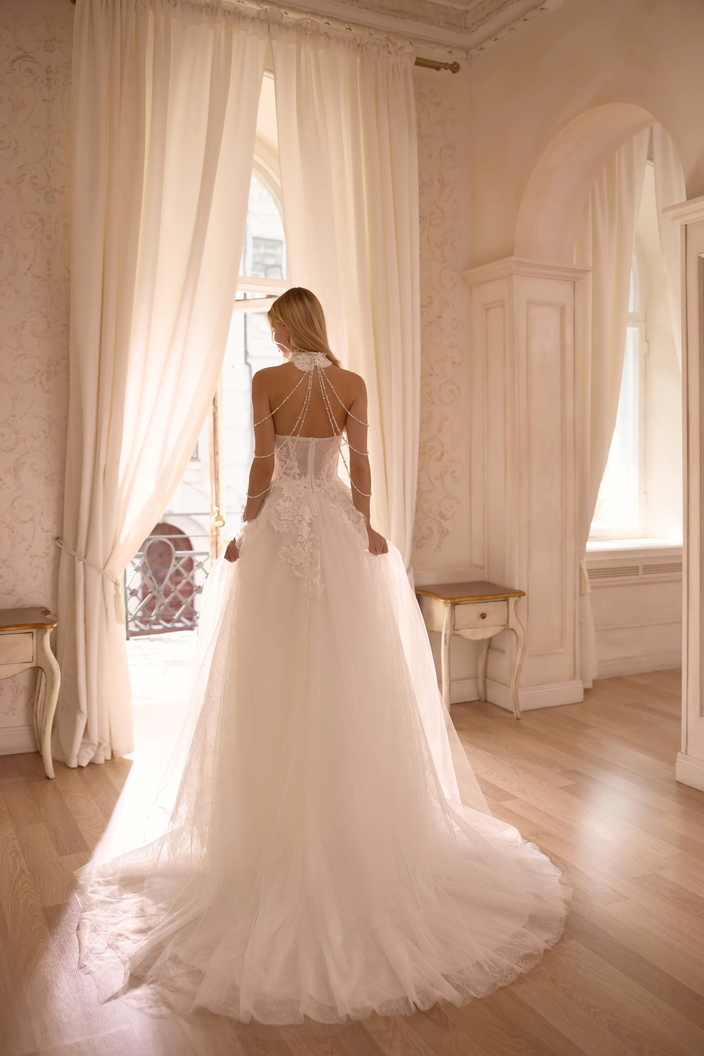 This enchanting princess gown is crafted from airy layers of tulle, creating a light, voluminous silhouette. The structured corset features a nude mesh insert for a subtle illusion effect and is adorned with delicate lace that gently cascades down onto the skirt, blending texture and softness. Adding a unique couture touch, a lace accessory encircles the neck, from which shimmering beaded strands gracefully drape over the shoulders—creating an ethereal, jewelry-like effect.