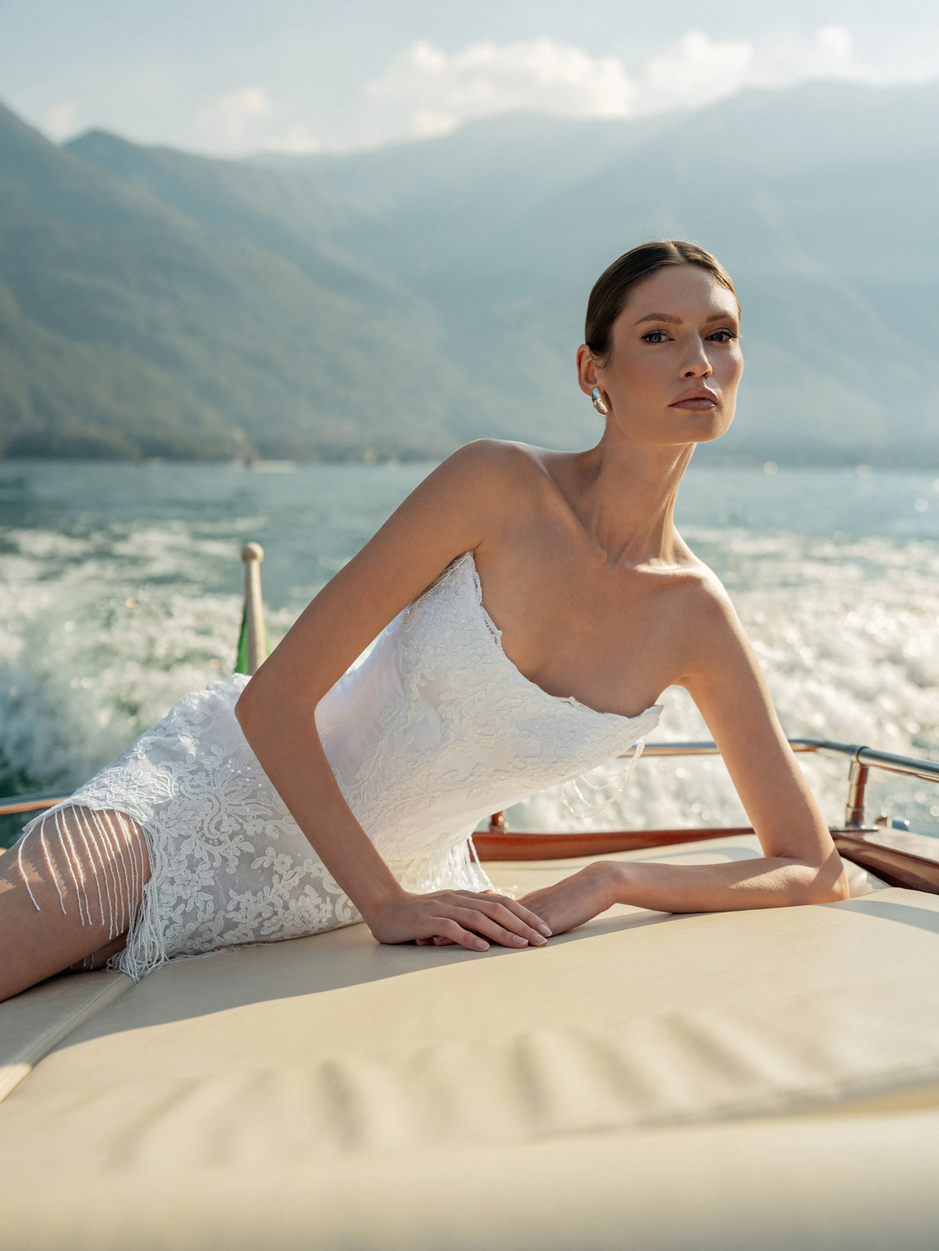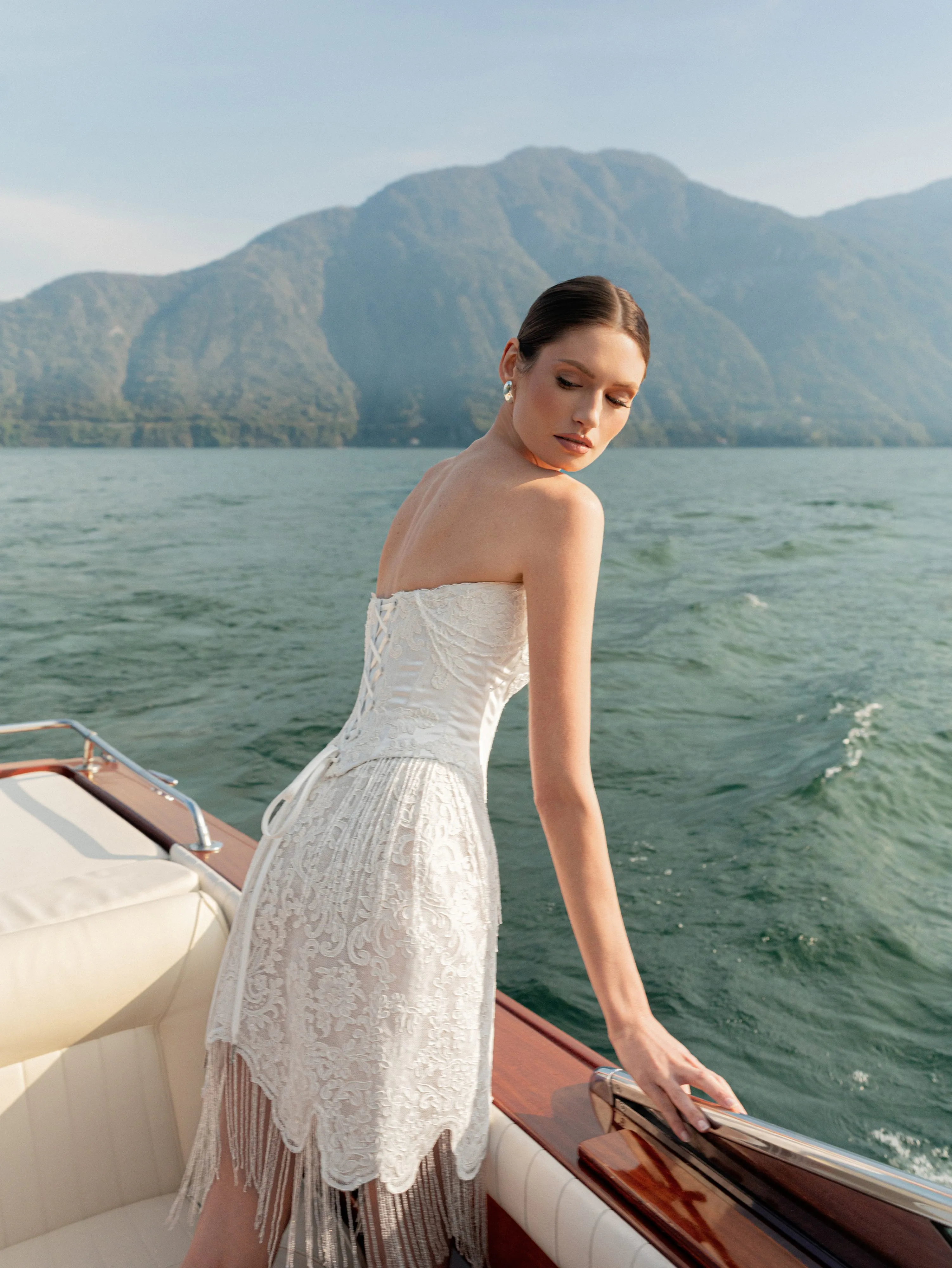 A striking mini dress featuring a cord lace skirt with sequins and a wave-shaped hemline from which beaded fringe cascades. The separate satin corset has a V-shaped neckline, adorned with lace detailing, and beaded embellishments on the shoulders, creating a modern and glamorous silhouette.