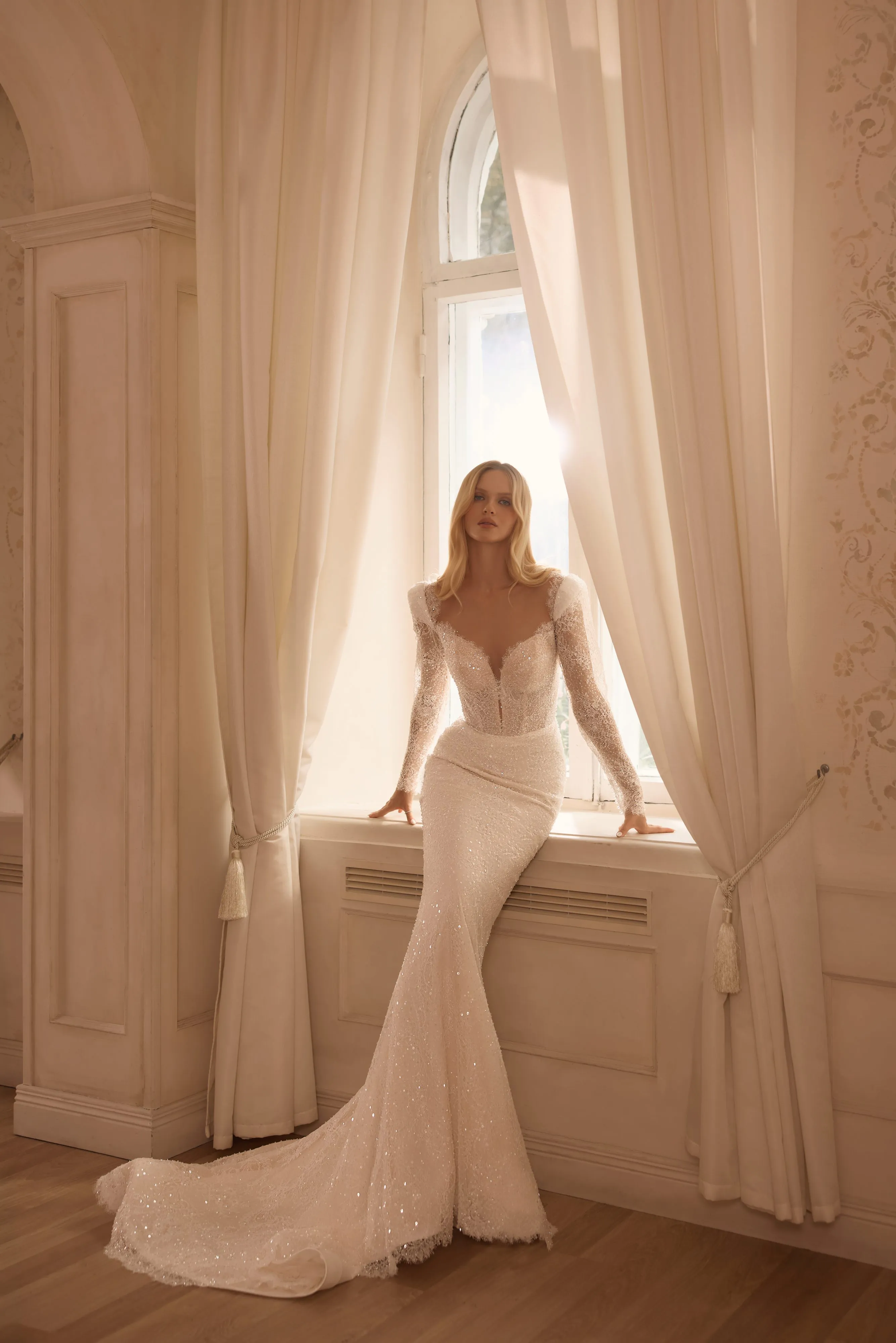 This elegant mermaid gown is crafted from intricately beaded lace, offering a refined shimmer and luxurious texture. Featuring long fitted sleeves and an illusion neckline, the dress creates the effect of an open décolletage while maintaining a sense of delicate coverage. The open back adds a striking, sensual contrast to the structured front, making this gown a perfect blend of timeless elegance and modern allure.