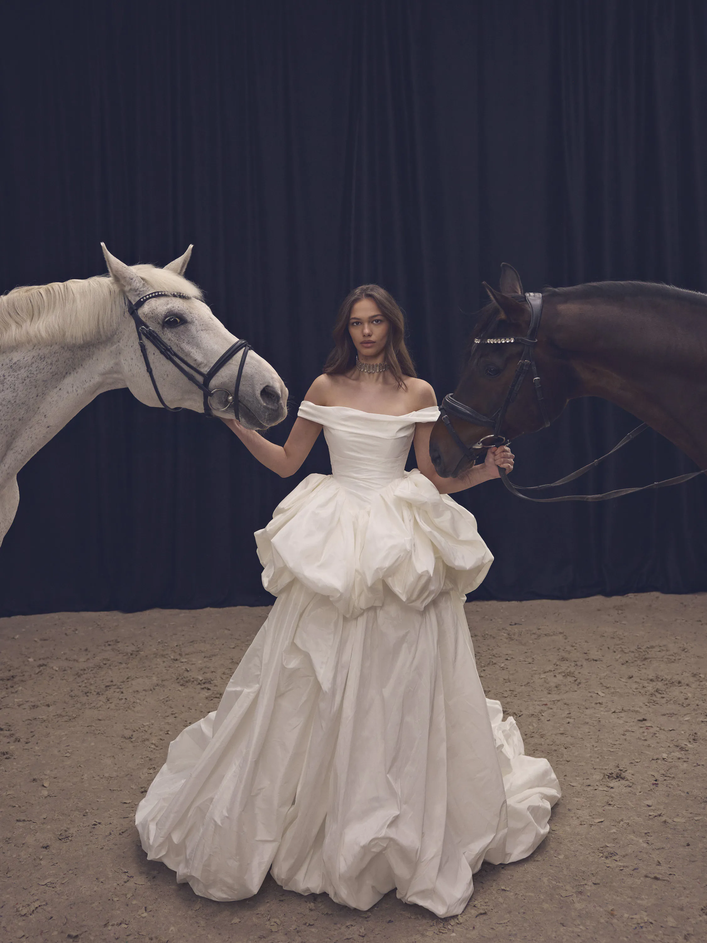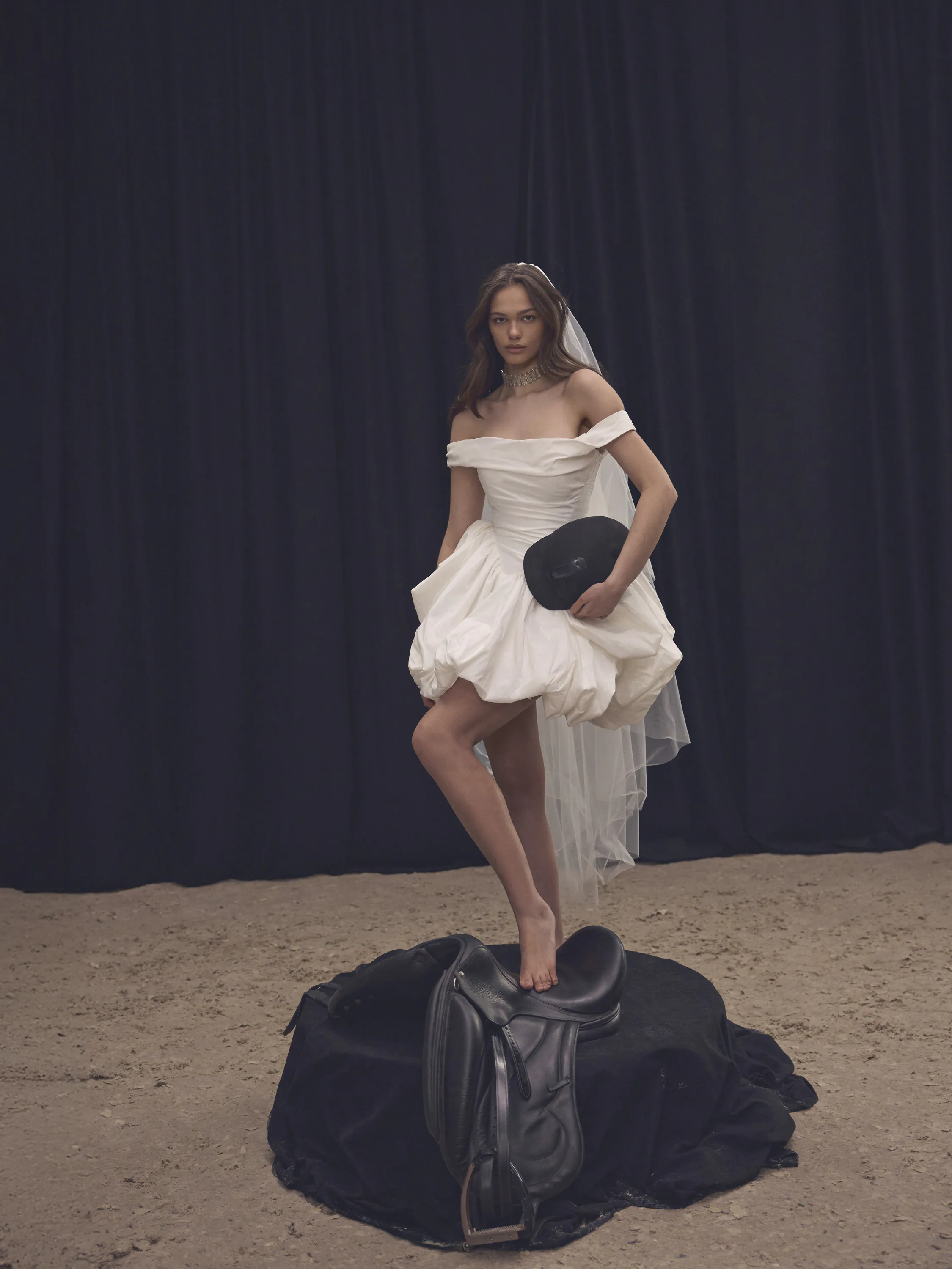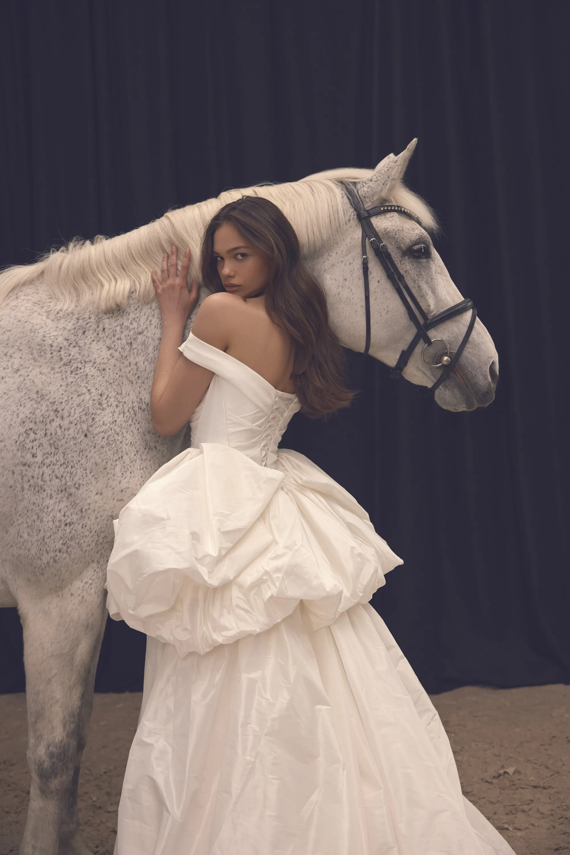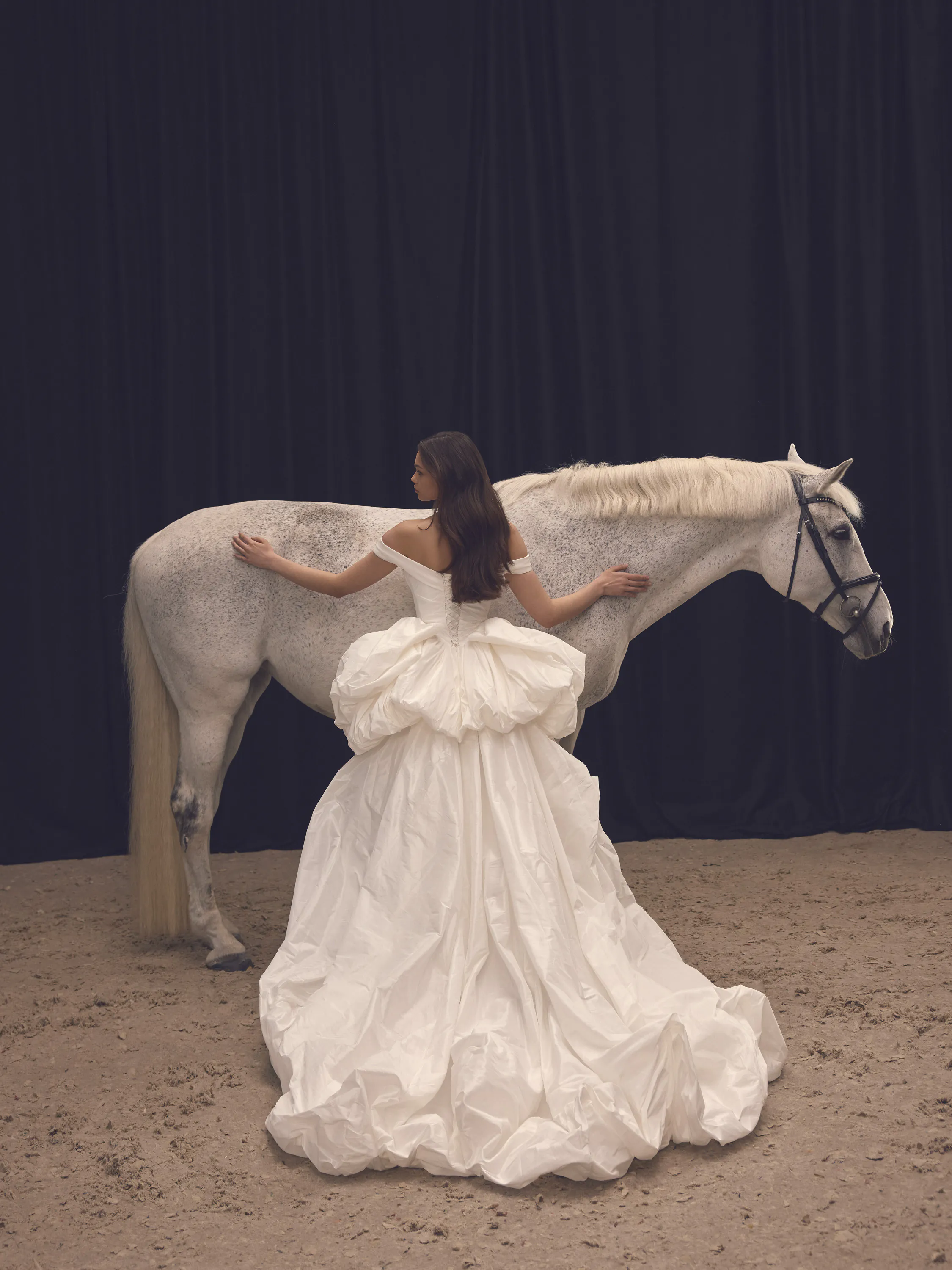 This enchanting transformable gown, crafted from milk-toned taffeta, captures the essence of modern fairytale elegance. The off-shoulder neckline gracefully frames the collarbones, while soft draping along the structured corset highlights the waist, adding a delicate romanticism to the silhouette. In its initial form, the gown features a playful short balloon skirt with a voluminous shape, adorned with statement bows on each side. But the true magic lies in its transformation: a detachable long underskirt, designed to impress with its rich volume, turns the dress into a regal, floor-length princess gown with a dramatic train.