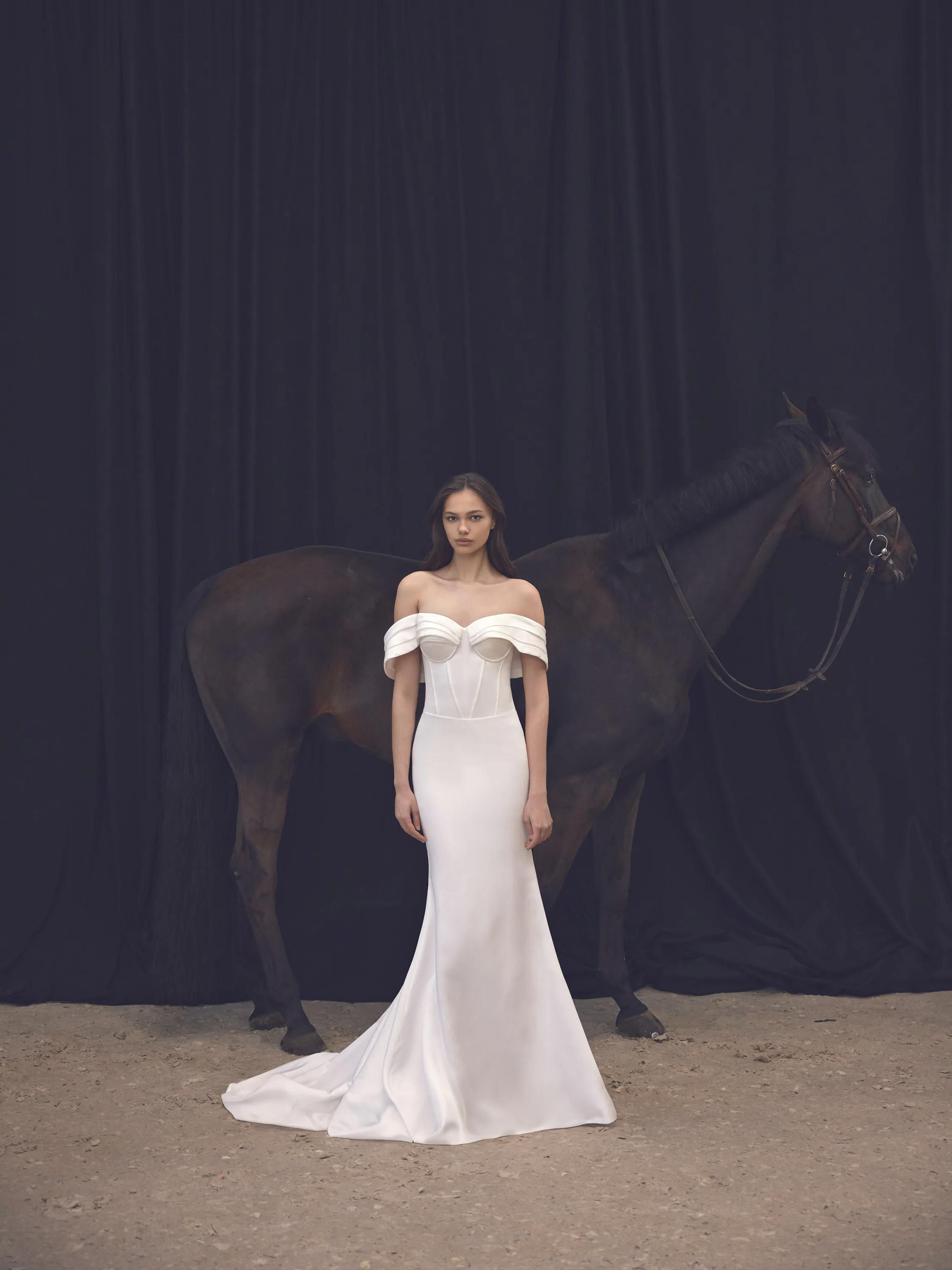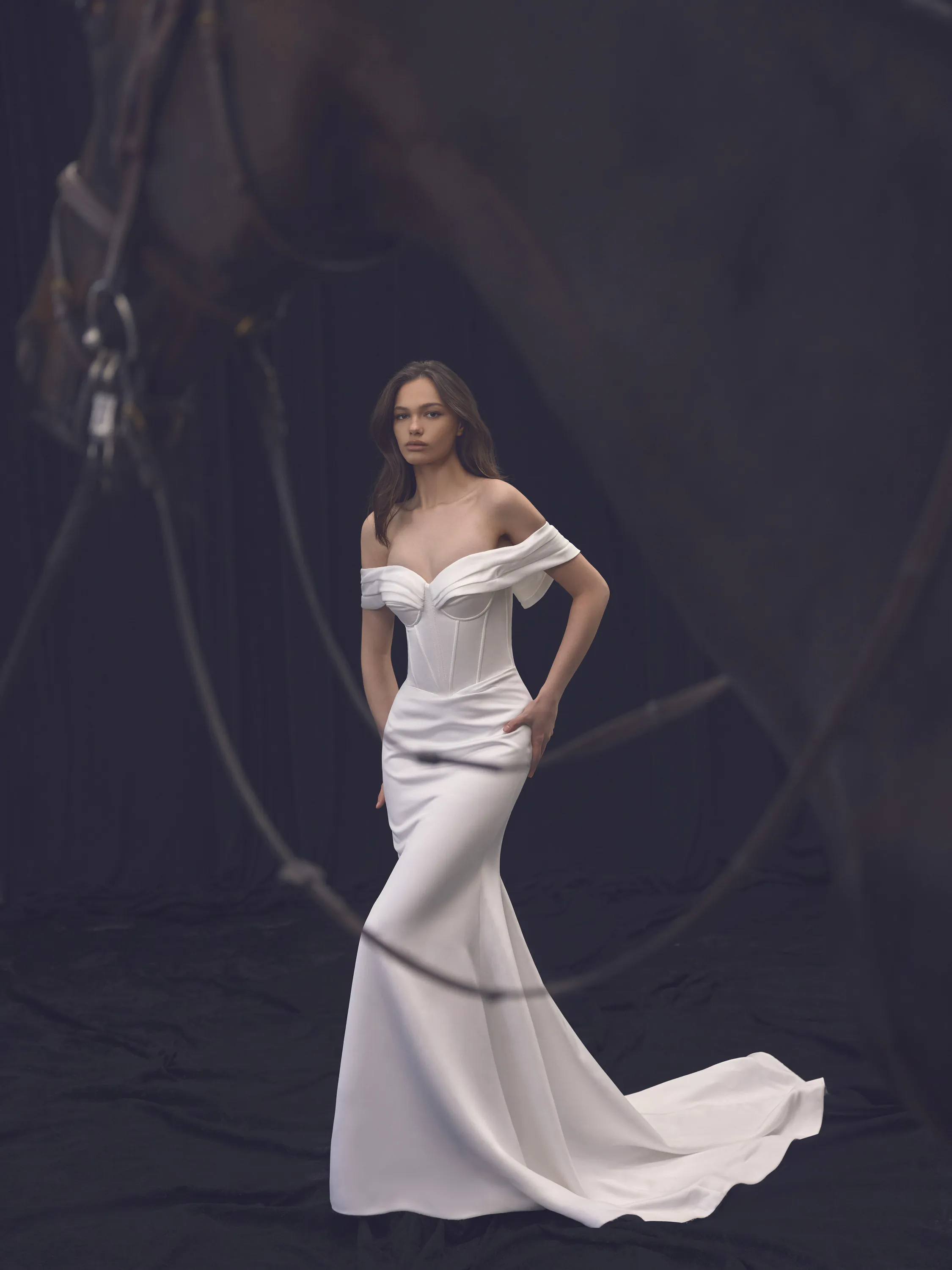 This enchanting mermaid-style gown, crafted from luxurious satin, features an off-shoulder neckline with delicately draped straps that gracefully frame the shoulders. The structured corset enhances the silhouette, providing a flattering fit. The gown is complemented by a detachable long train that transforms the look into a regal princess-style dress. Additionally, detachable long sleeves offer versatility, allowing the bride to adjust her look from ceremony to reception with ease.