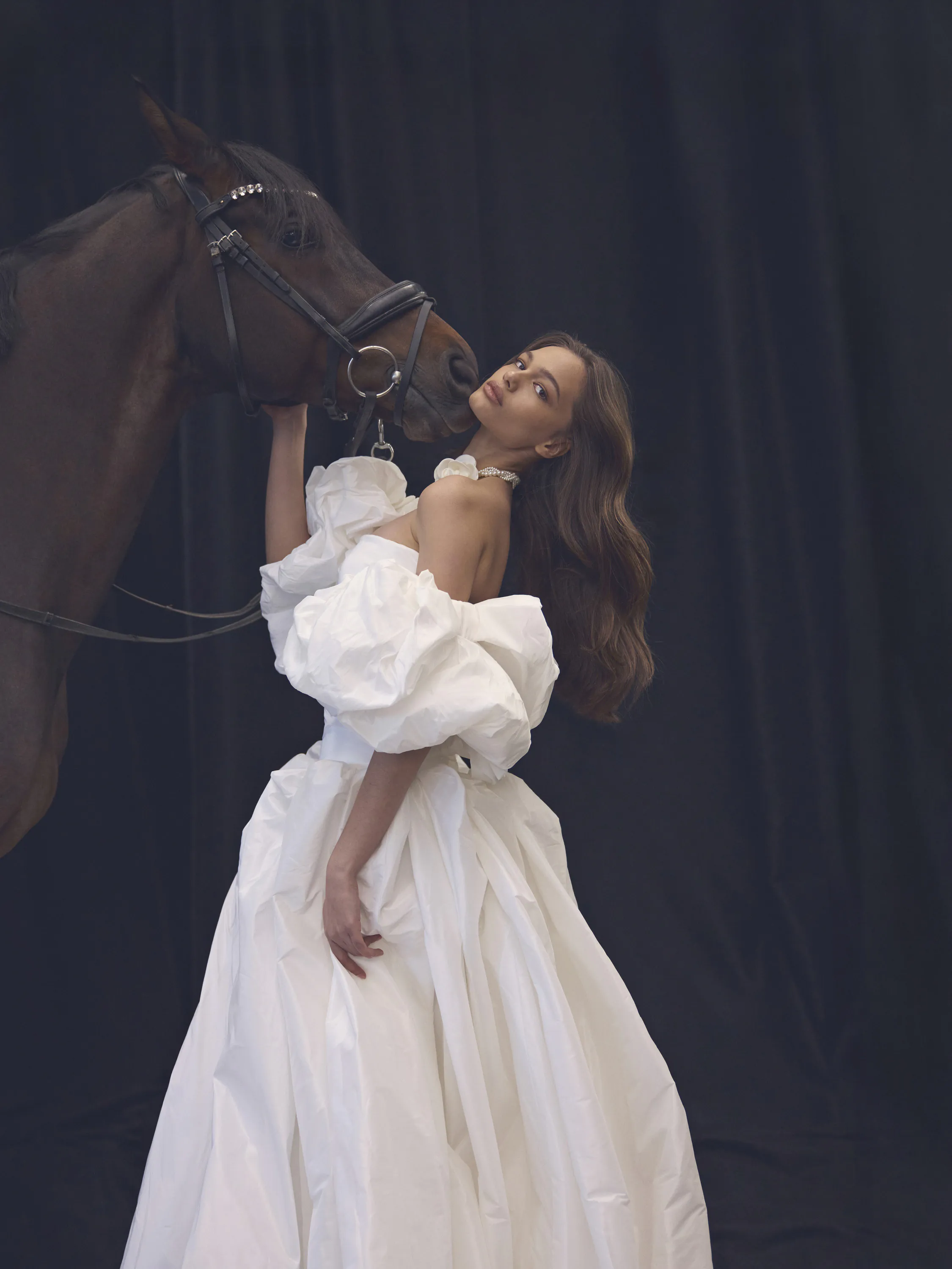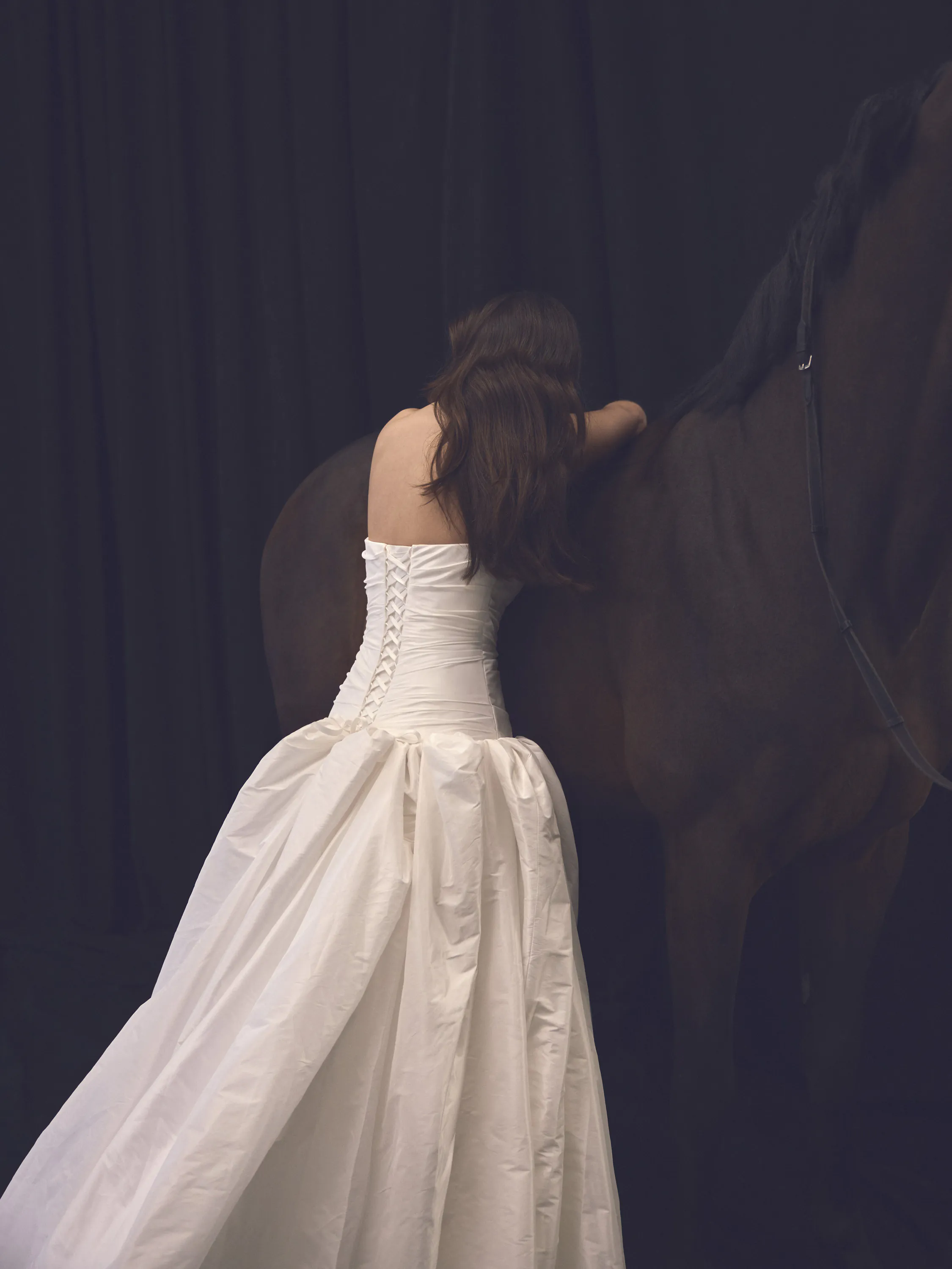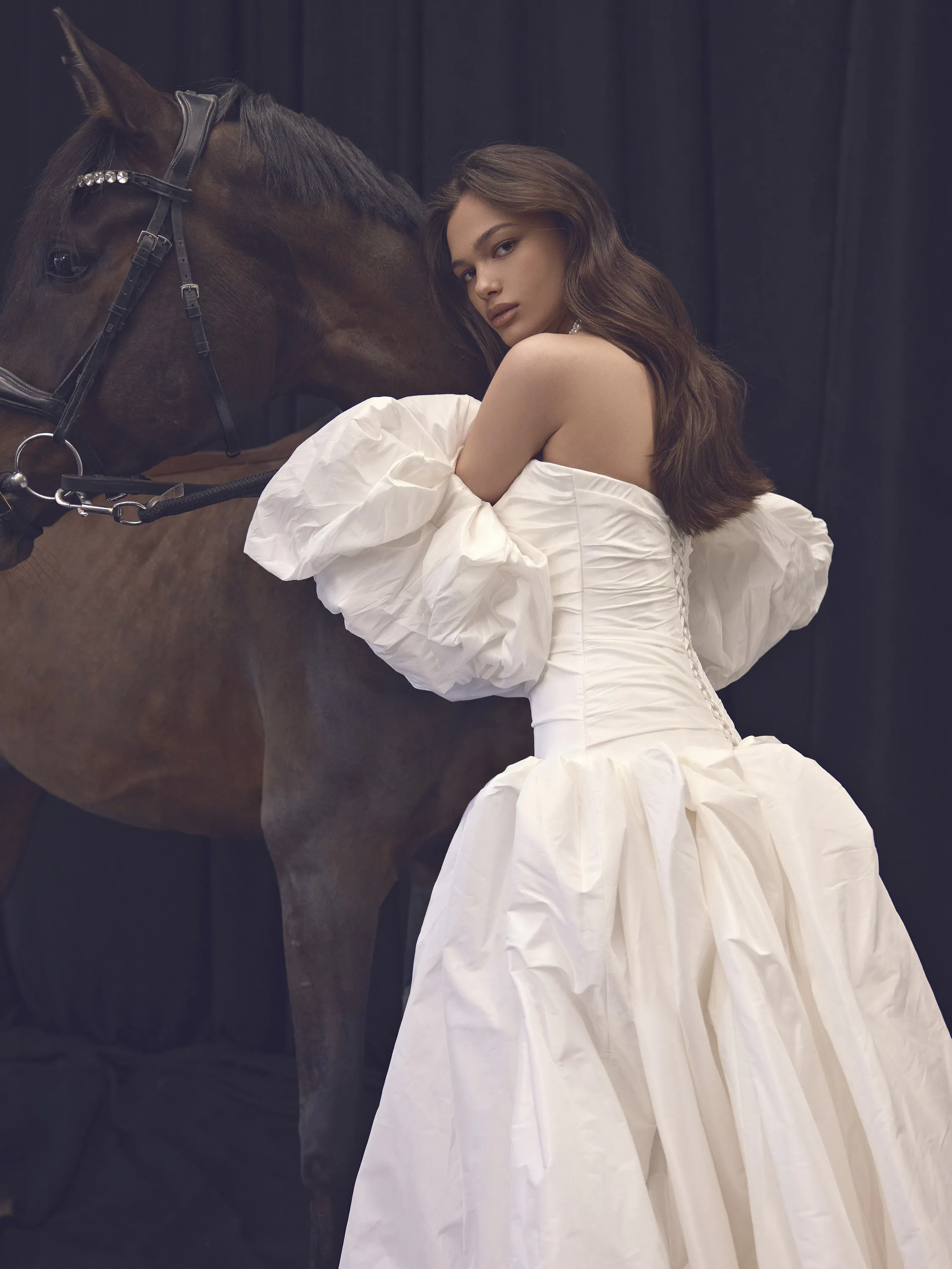 This princess-style gown, crafted from luxurious taffeta, features a low-waisted pleated corset with a straight neckline, creating a graceful and elongated silhouette. The voluminous skirt flows effortlessly from the corset, enhancing the airy and ethereal quality of the dress. At the back, an elegant lace-up detail adds a touch of sophistication and allows for an adjustable fit. Completing the ensemble are detachable puff sleeves, which add a playful and romantic flair to the overall design.