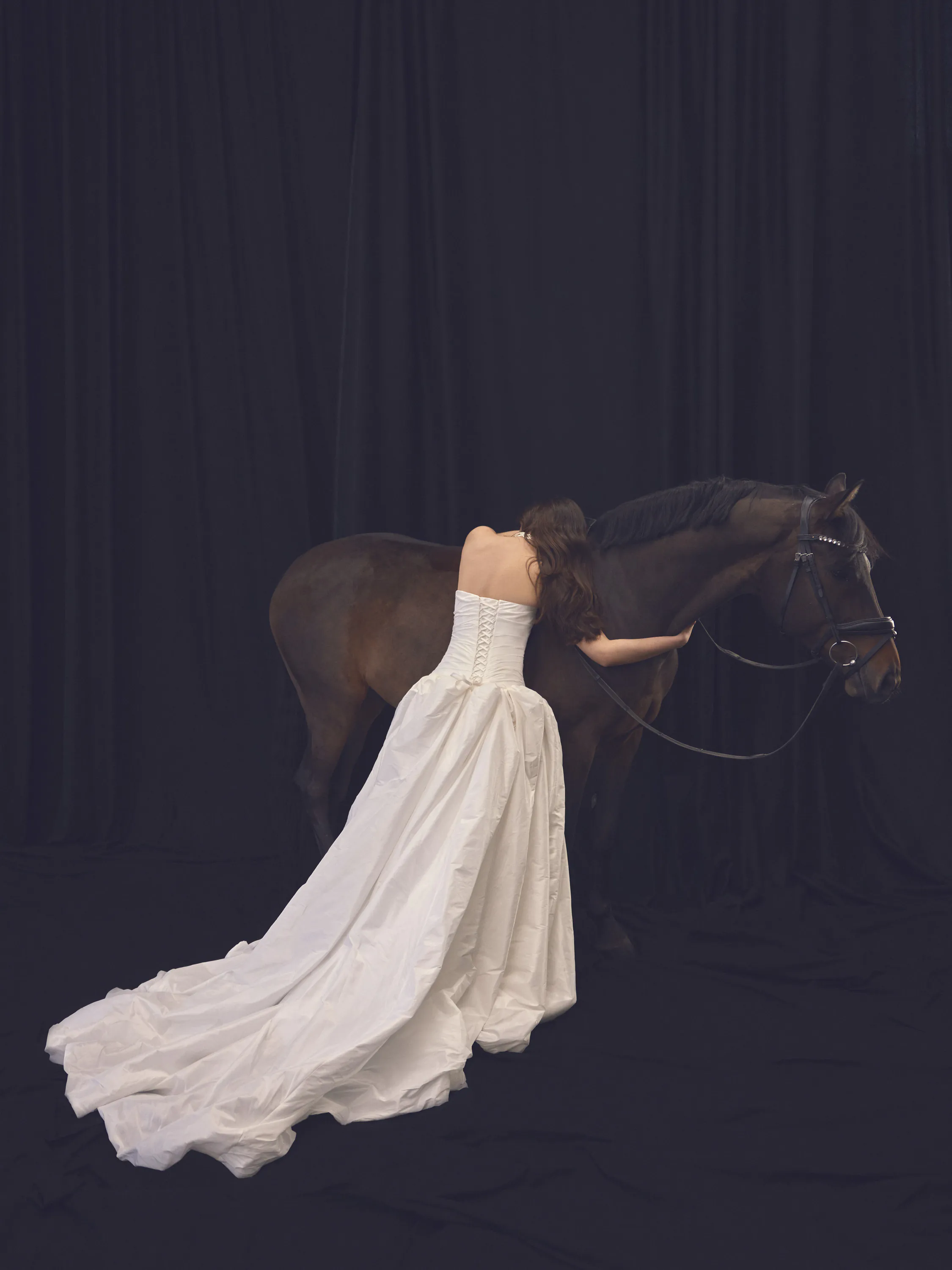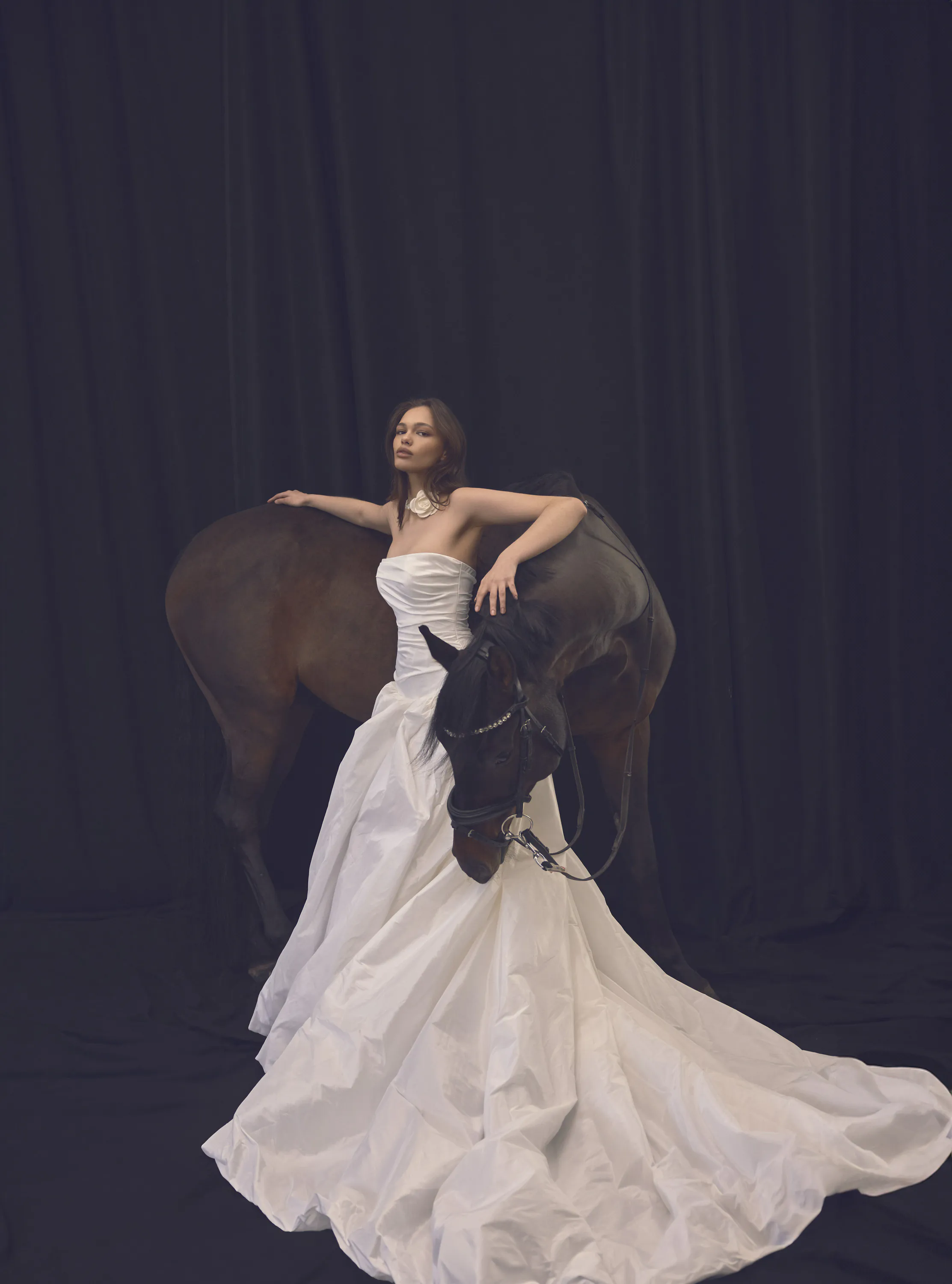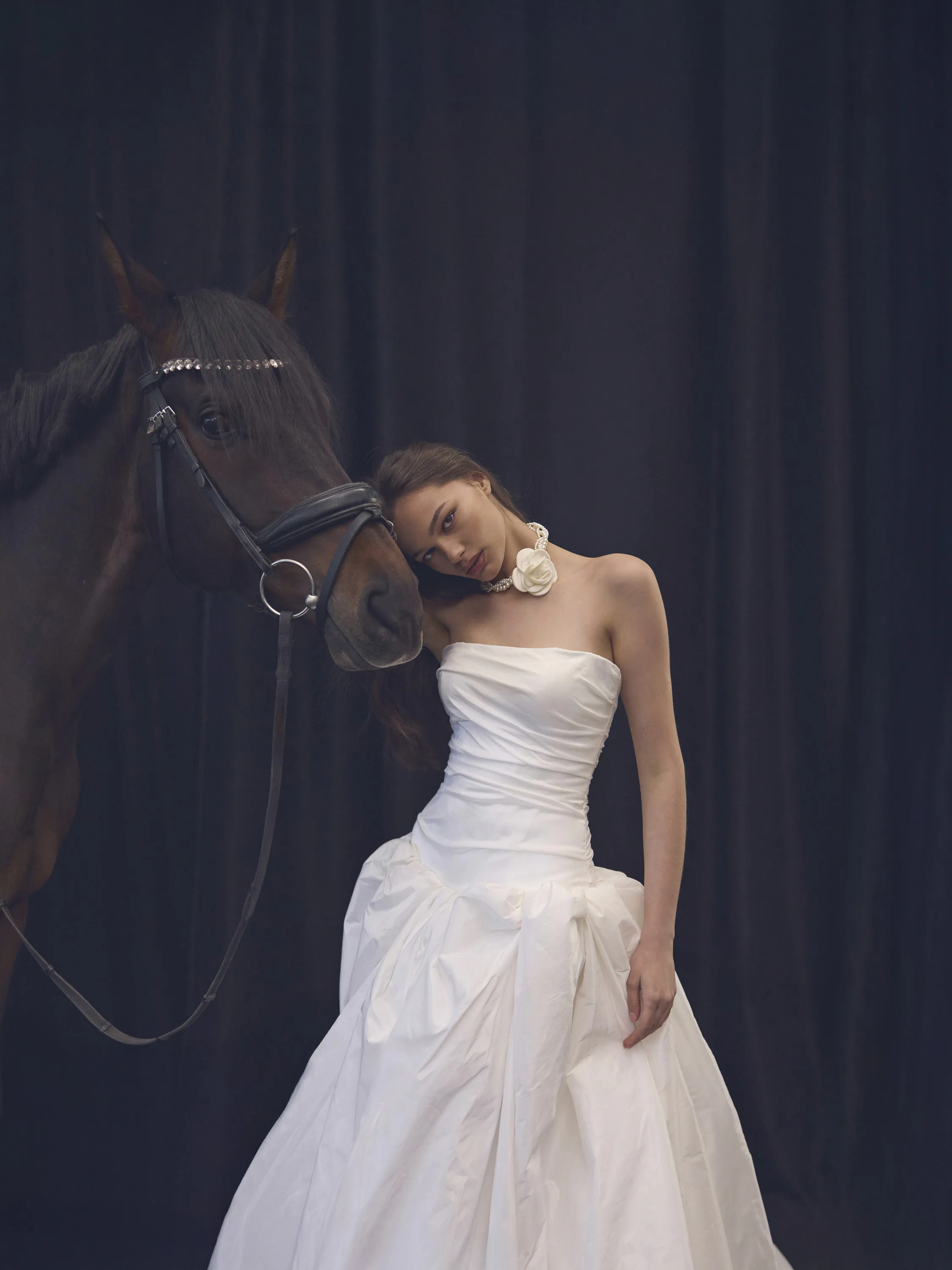 This princess-style gown, crafted from luxurious taffeta, features a low-waisted pleated corset with a straight neckline, creating a graceful and elongated silhouette. The voluminous skirt flows effortlessly from the corset, enhancing the airy and ethereal quality of the dress. At the back, an elegant lace-up detail adds a touch of sophistication and allows for an adjustable fit. Completing the ensemble are detachable puff sleeves, which add a playful and romantic flair to the overall design.