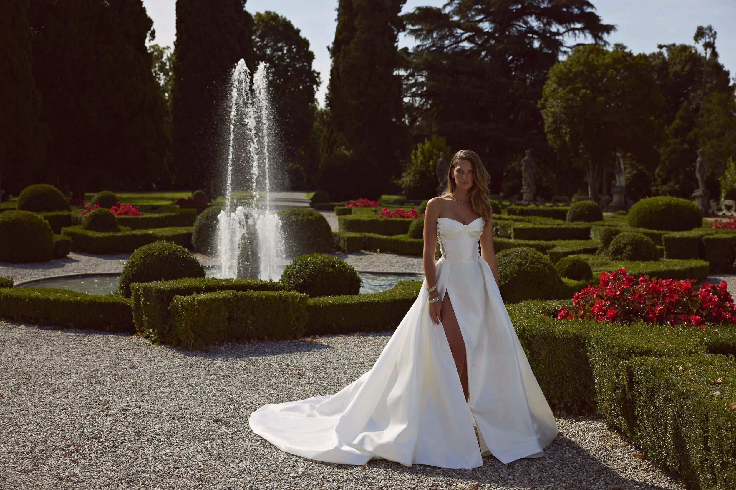 Stylish and elegant dress made of mikado fabric. The dress has shell-shaped cups and a slit on leg. It is complemented by embroidered floral lace on the mesh corset, creating a translucent effect, and is completed with a long train.