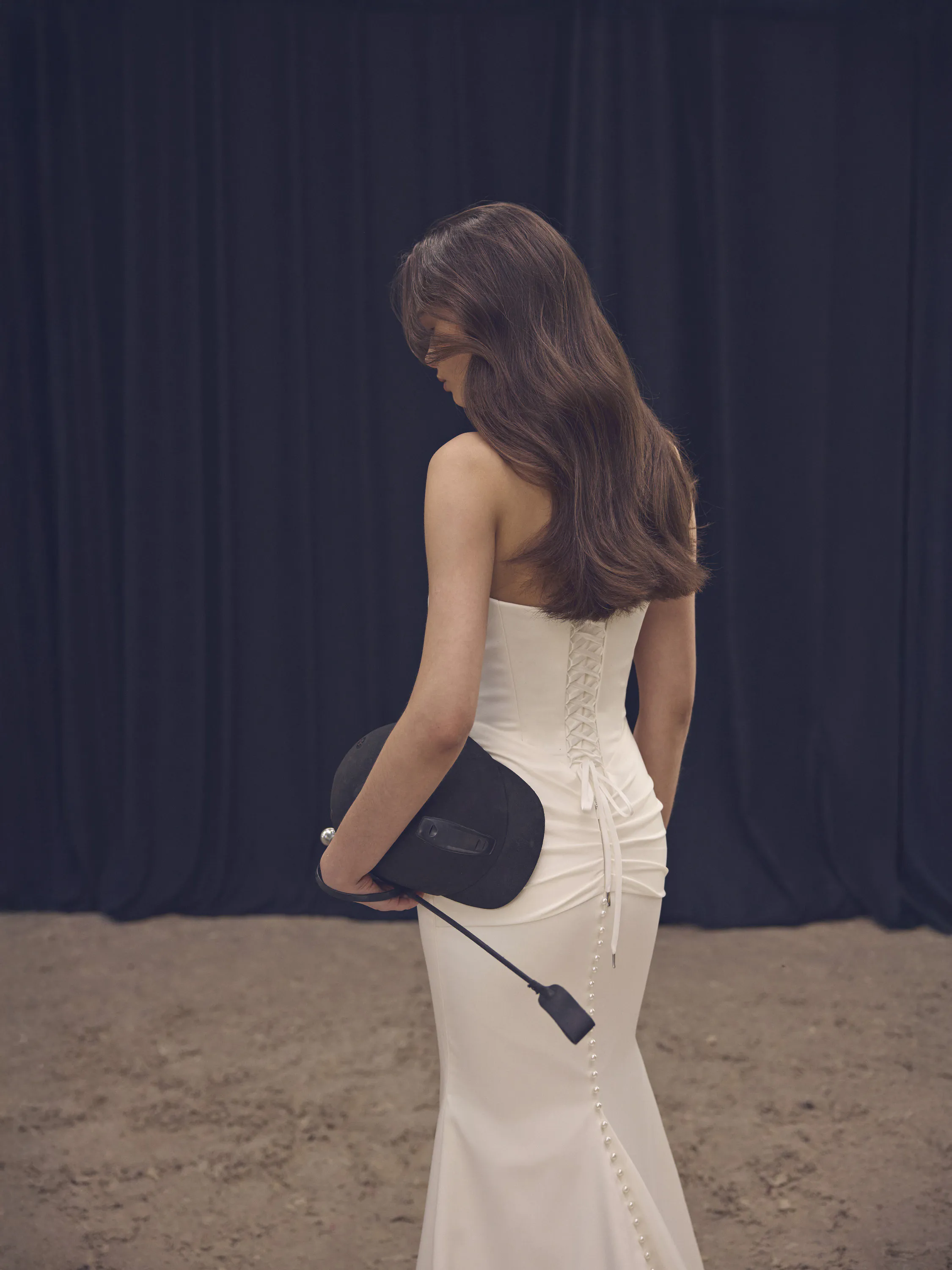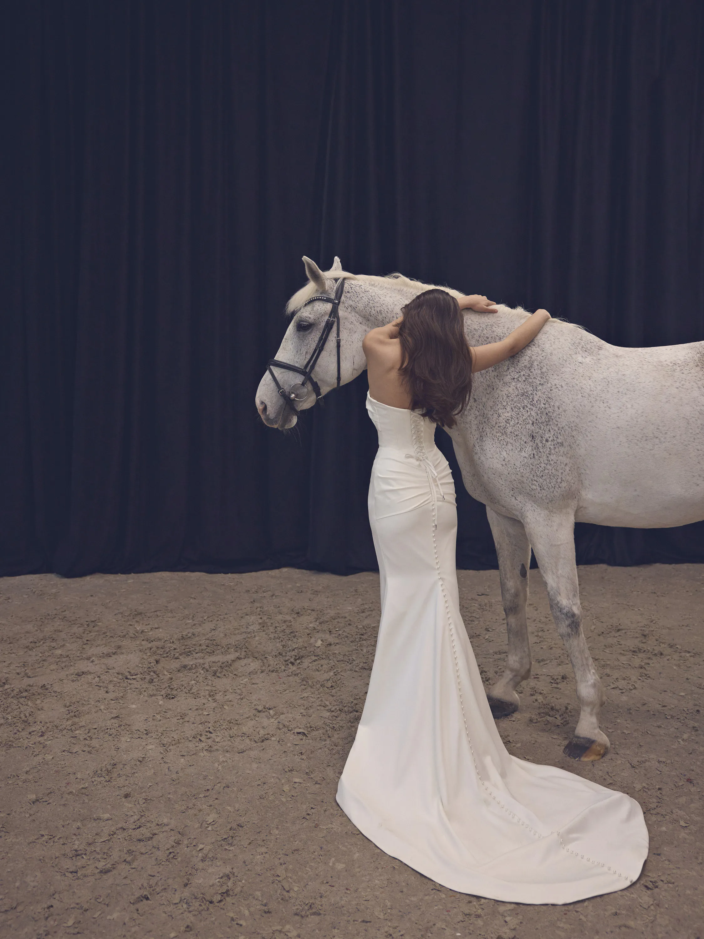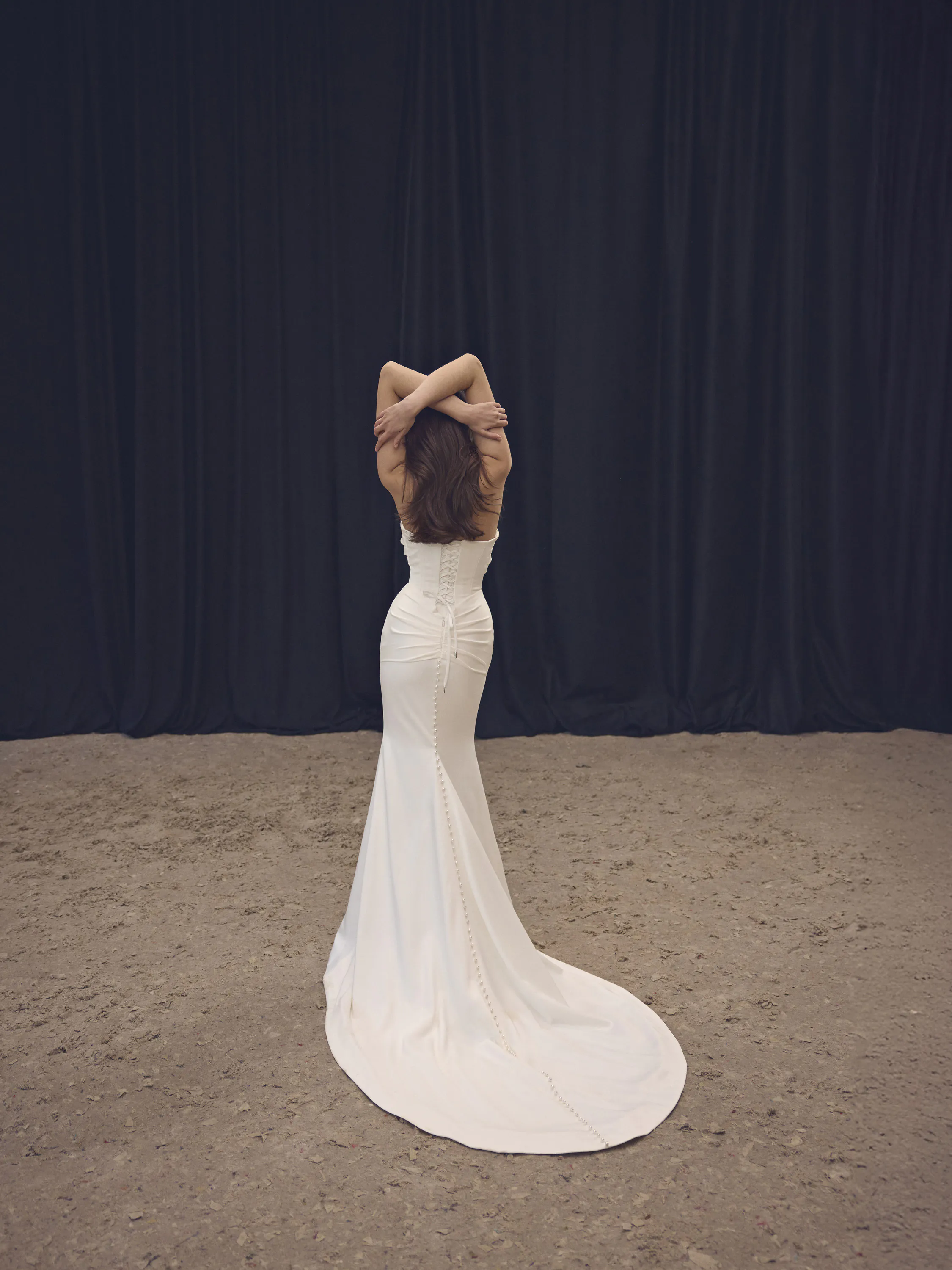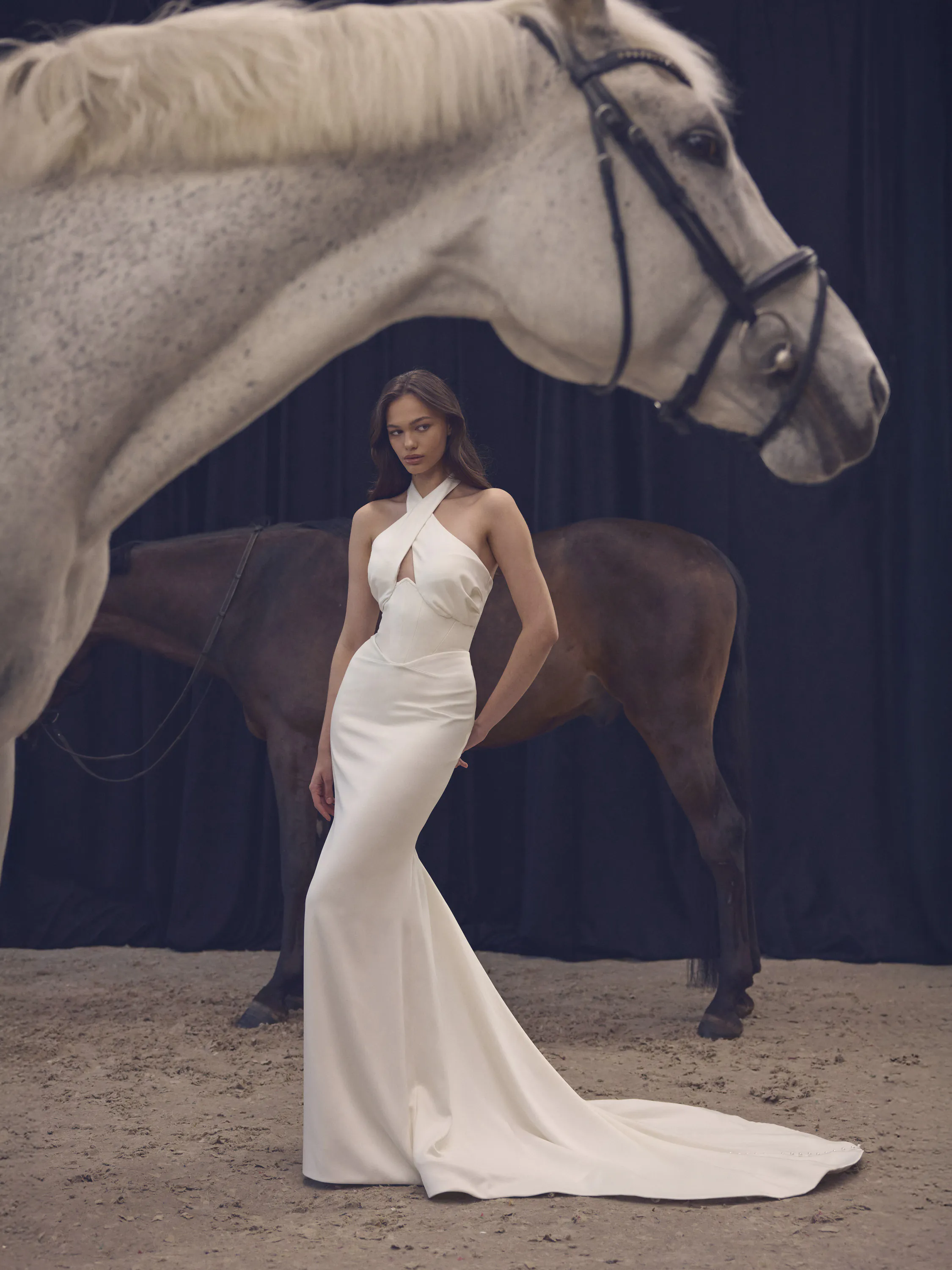 This breathtaking bridal gown features a daring mermaid silhouette crafted from luxurious stretch Dupont. The design begins with a deep V-shaped corset, from which elegant straps emerge at the side seams. These straps cross over the chest in a bold, open style and fasten behind the neck, creating a striking halter effect. At the back, a delicate lace-up closure enhances the fit and adds a touch of romance. Just beneath the corset, soft draping, gracefully flowing into a train that adds movement and luxurious texture. Designed for those who want to make a statement while exuding grace and confidence.